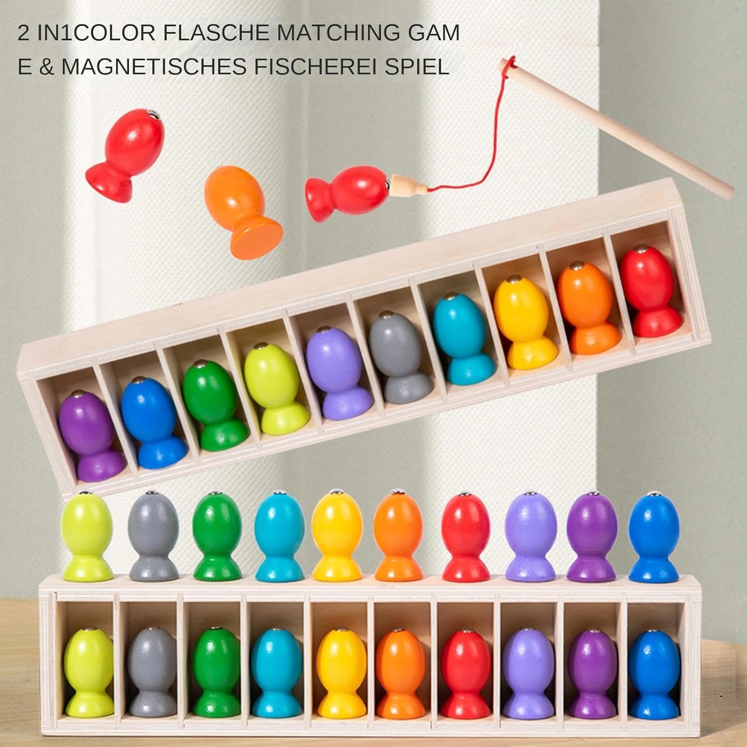 Design 2 in 1: il gioco di pesca magnetico include 20 pesci in legno colorati (bottiglie), una scatola di legno e un'asta da pesca magnetica per il colore della bottiglia e la pesca magnetica. Facile da giocare: questo divertente gioco da tavolo ha 20 bottiglie in 10 colori che possono essere abbinati in coppia. Nascondi le bottiglie nella scatola e usa le bottiglie dello stesso colore con il tuo negozio. Personalizza i colori per vincere. Apprendimento creativo: il gioco magnetico di pesca in legno è un ottimo strumento per sviluppare la coordinazione occhio-mano e le capacità motorie dei bambini, aumentando la loro fiducia in se stessi. Colore bottiglia Challenge gioco Materiali di alta qualità: il gioco di pesca per bambini e giochi di sfida di corrispondenza delle bottiglie è realizzato in legno con bordi lisci, il che rende sicuro per i bambini giocarli. Versatile: questo set di bottiglie colorate e di pesca magnetica favorisce il pensiero veloce e il gioco giocoso, rendendolo un divertente gioco di festa per bambini e adulti, serate di gruppo e in famiglia.