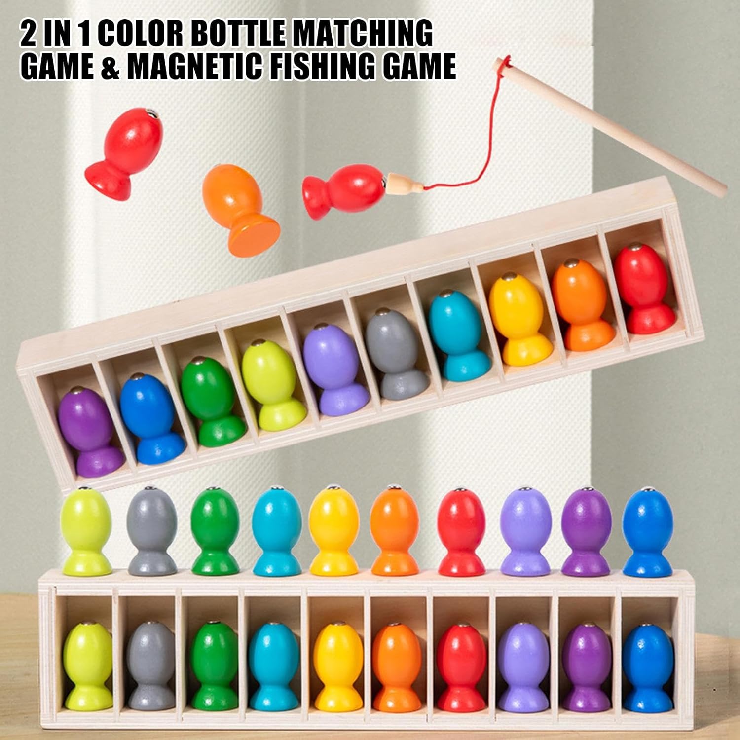 Costruttore Visivo: Sviluppa l'identificazione visiva e il riconoscimento del colore attraverso un gioco di pesca magnetico, dove il bambino combina i colori per stimolare naturalmente le sue capacità cognitive attraverso un'attività giocosa ed educativa Animazione per attività collettive: questo gioco di pesca magnetico offre un intrattenimento adattabile alle età, arricchendo i momenti di gruppo e incoraggiando interazioni memorabili tra i membri della famiglia durante il gioco Sviluppo Cognitivo: questo gioco di pesca magnetico stimola naturalmente la memoria e la concentrazione di, promuove lo sviluppo della loro attenzione per una migliore durata di messa a fuoco, e rafforza la loro resistenza mentale grazie a un'esperienza di gioco accattivante progettata per risvegliare gli spiriti giovani. Miglioramento delle capacità motorie: ottimizza la coordinazione mano-occhio e perfeziona l'abilità manuale incoraggiando la precisione durante la pesca magnetica. Offre un modo interattivo, efficace e piacevole per sviluppare queste abilità motorie essenziali. Materiali per bambini sicuri: realizzato in legno naturale con bordi lucidati, questo gioco di pesca magnetico privilegia durata e sicurezza per offrire ore di gioco senza rischi a qualsiasi età