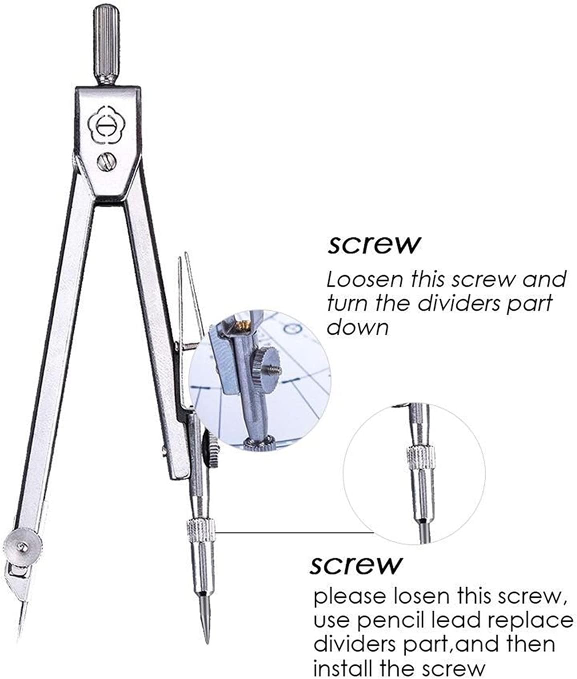 1. Bussola resistente in acciaio inossidabile: 2. La bussola è facile da maneggiare con il supporto per punta in metallo e funziona senza problemi per il suo eccellente lavoro. 3. Il lato opposto dell'estremità della matita è una ganascia regolabile separata che consente di riparare inchiostro o vernice. 4. La bussola viene fornita con una scatola trasparente e ricariche per matita confezionate in una piccola scatola trasparente, comoda da organizzare e trasportare. 5. Eccellente per l'uso a scuola, nella lavorazione del legno o a casa. Il miglior strumento per disegnare cerchi per studenti, artisti, matematici, falegnami.
