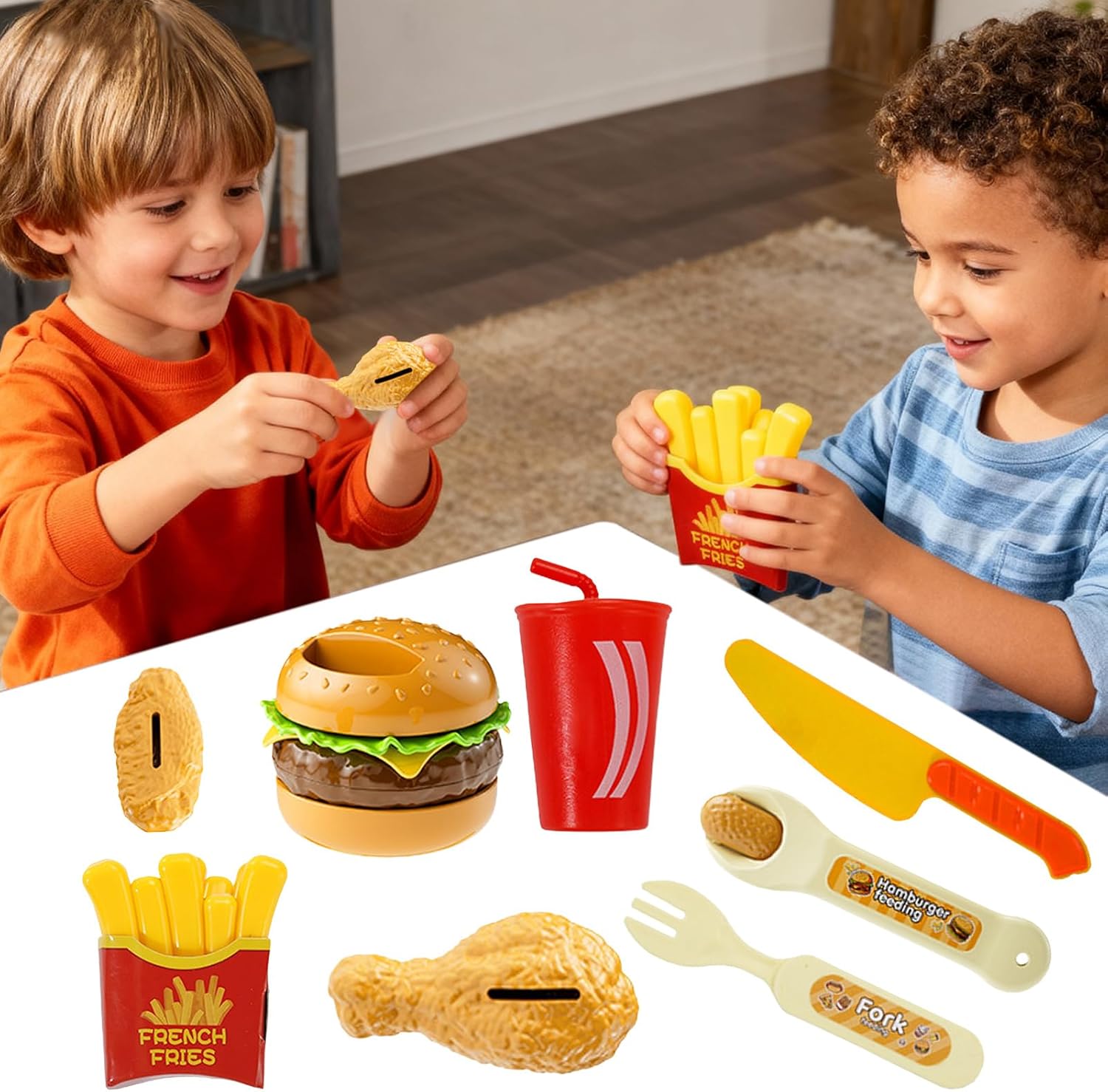 Strumento educativo interattivo: il cibo giocattolo funge da strumento interattivo per promuovere la coordinazione occhio-mano, migliorare le capacità motorie e sostenere lo sviluppo cognitivo. È prezioso per lo sviluppo educativo in scenari di gioco fantasiosi e promuove l'apprendimento attraverso il gioco di ruolo e le attività creative. I bambini possono acquisire così abilità giocosamente importanti per il loro sviluppo educativo. Esperienza di gioco creativa: il giocattolo alimentare promuove la consapevolezza del lavoro di squadra stimolando la creatività in ambienti cooperativi multiplayer, e simula scenari di gioco di ruolo da ristorante per ulteriori estensioni dello scenario che consentono il divertimento interattivo. Attraverso il gioco congiunto, i bambini scoprono nuove possibilità di usare la loro immaginazione e interagire in gruppo, aumentando il piacere del gioco di ruolo e rafforzando le capacità di cooperazione. Incentivo creativo per il gioco di ruolo: il giocattolo Essen ispira gioco d'imitazione fantasioso con il suo autentico design fast food e consente ai bambini di immergersi in scenari di ruolo dinamici come cucinare o servire i pasti. Queste attività giocose promuovono le abilità cognitive, stimolano l'immaginazione e supportano lo sviluppo attraverso il gioco creativo in diverse situazioni. Supporta il gioco fantasioso: il set di alimenti per giochi di gioco facilita i giochi di alimentazione simulati e stimola l'interazione divertente che rafforza le connessioni emotive durante il periodo della famiglia. È perfetto per il legame genitore-figlio e incoraggia momenti felici insieme a casa. Attraverso il gioco creativo con il set di prodotti alimentari di gioco, vengono creati ricordi e lo sviluppo immaginativo è supportato. Tempo di gioco prolungato: il set Kids Play Food include diversi accessori e diversi tipi di cibo come hamburger, patatine fritte e pollo. Arricchisce l'esperienza di gioco stimolando la creazione di storie fantasiose nelle cucine o nelle sale da pranzo, aumentando il tempo di gioco e la creatività naturally.