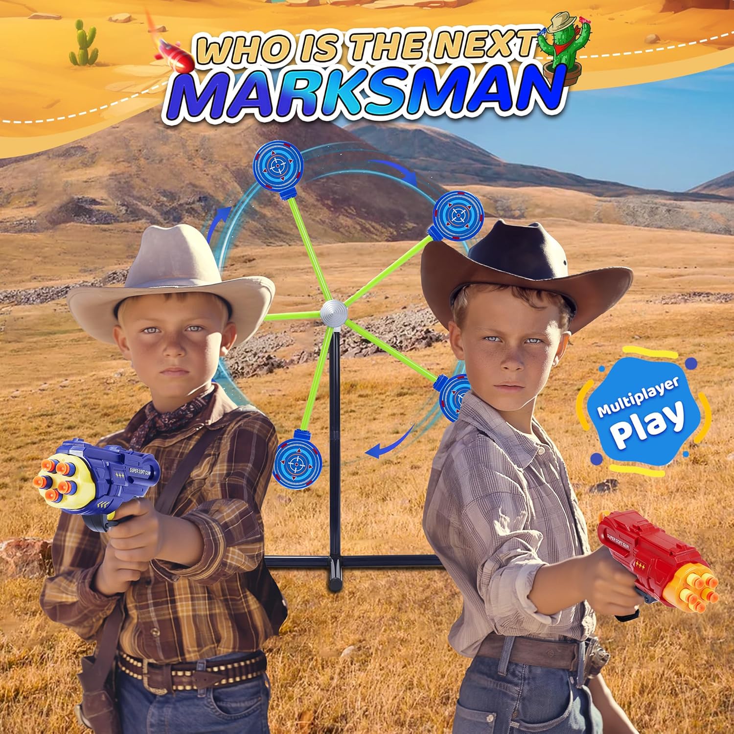 Goditi l'emozionante esperienza di tiro proprio sotto le tue dita! Il nostro set di giochi di tiro è dotato di due pistole da gioco e 20 freccette di schiuma, progettate per essere semplici ma pratiche, consentendoti di montarle facilmente e di immergerti nel divertimento del tiro. Facile da assemblare: questo gioco di tiro include istruzioni dettagliate per l'assemblaggio, garantendo che tu possa completare la configurazione senza sforzo. Il bersaglio rotante migliorato è più stabile e duraturo, permettendoti di godere del tiro senza preoccupazioni. Sfida intelligente a più livelli: il bersaglio rotante presenta tre impostazioni regolabili - statico, rotazione lenta e veloce, adatto ai giocatori di diversi livelli di abilità. Dopo ogni colpo, il bersaglio torna automaticamente alla sua posizione originale. Distanza di tiro più lunga: questo giocattolo bersaglio di tiro supporta distanze di tiro efficaci superiori a 10 metri, liberando lo spazio di gioco. Che si tratti di un ambiente interno aperto o di un campo all'aperto, questo set di giocattoli porterà un'infinita gioia di tiro. Regalo per bambini: è un regalo ideale per i bambini in occasione di compleanni, vacanze o Natale. Questo set di giochi di tiro promette un divertimento illimitato per i bambini, promuovendo allo stesso tempo l'interazione tra i membri della famiglia.