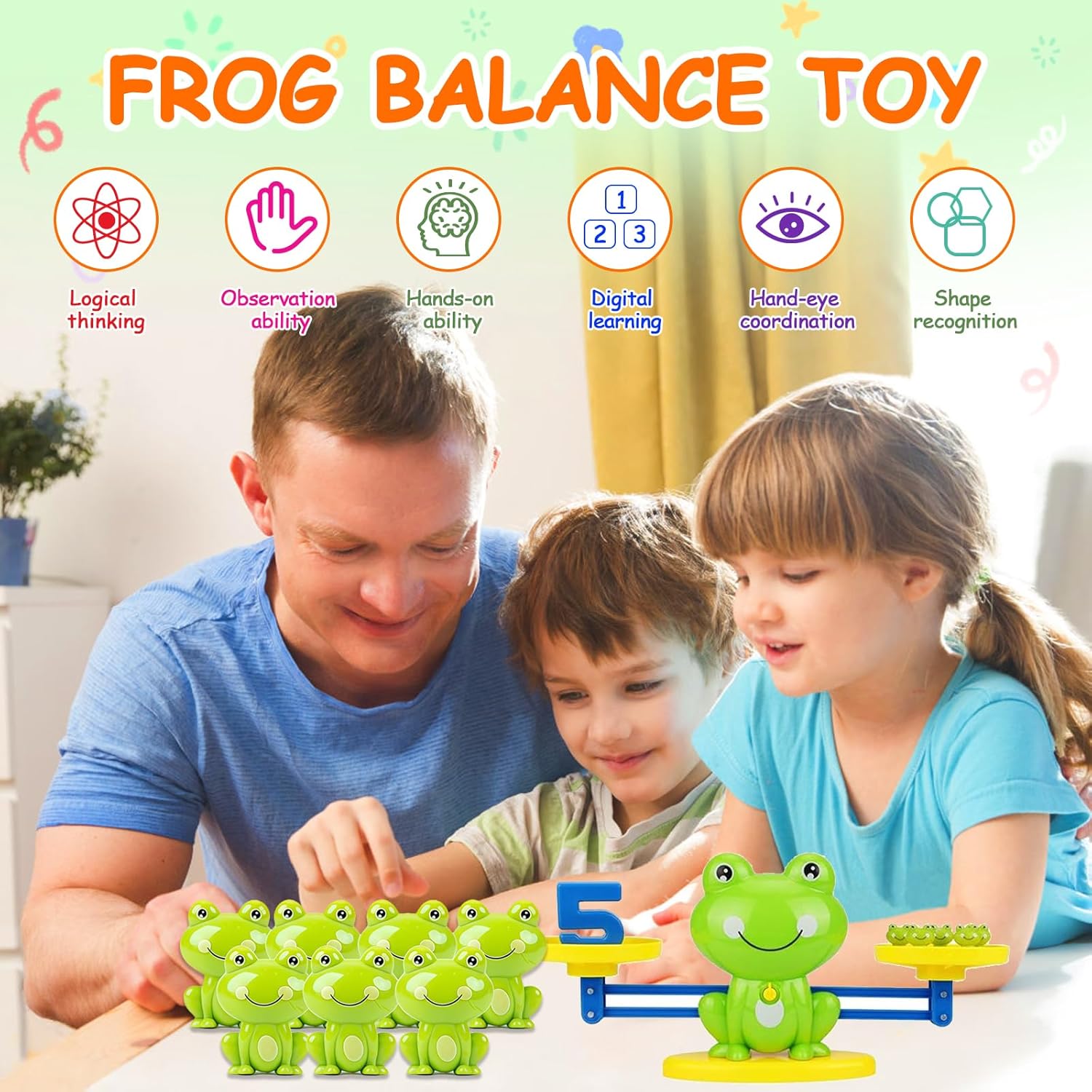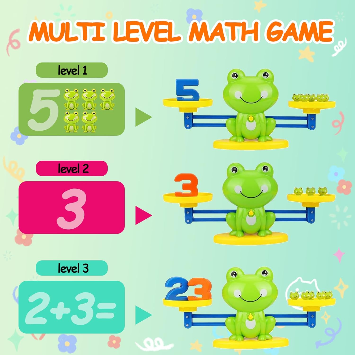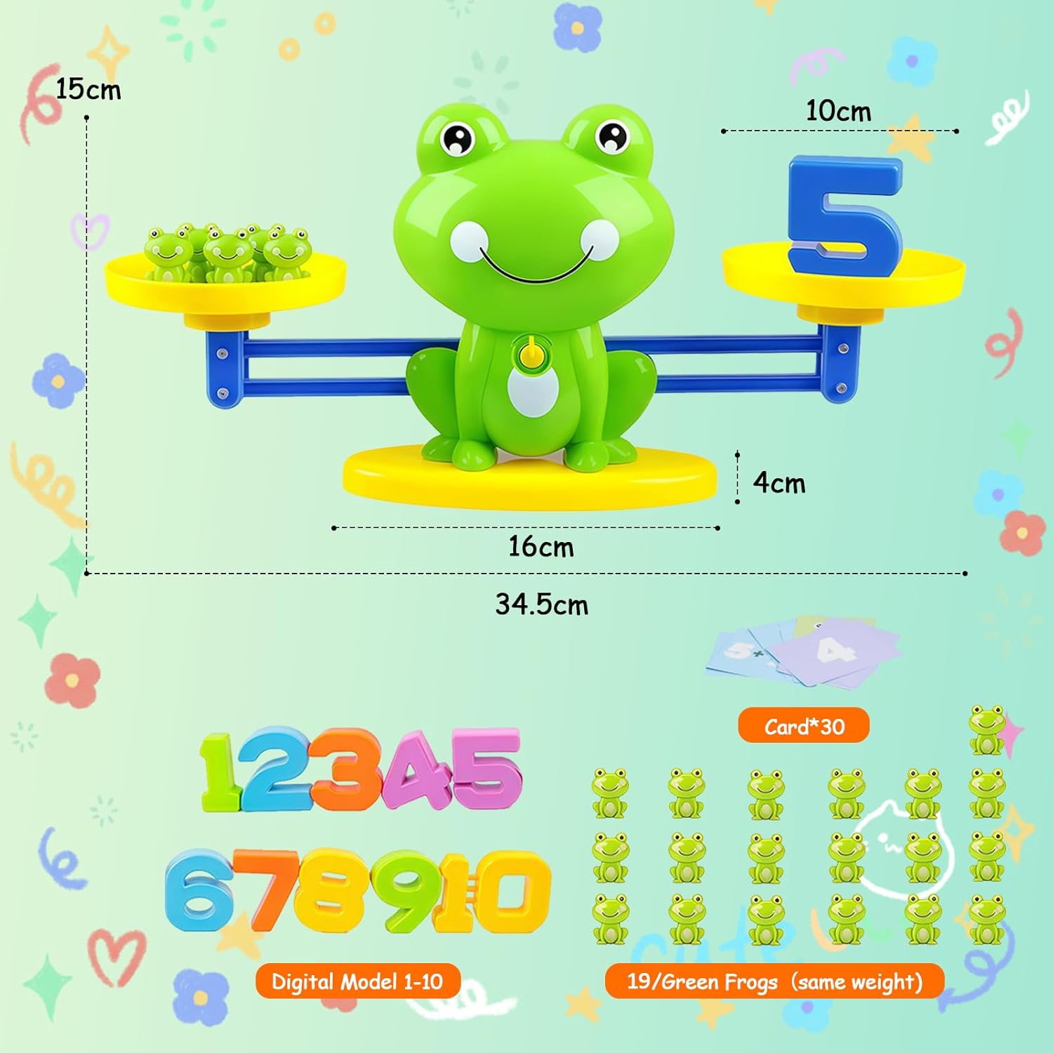 【Apprendimento Matematico Divertente e Intuitivo】Questo gioco educativo di matematica combina la bilancia a forma di rana con pesi a tema per insegnare ai bambini il riconoscimento dei numeri,il conteggio e le prime somme in modo interattivo e coinvolgente. 【Tre Livelli di Gioco per una Crescita Graduale】Il gioco offre tre modalità: riconoscimento dei numeri,conteggio base e addizioni semplici, ideali per accompagnare lo sviluppo cognitivo dei bambini dai 3 anni in su, seguendo il metodo Montessori. 【Metodo Montessori con Apprendimento Sensoriale】La bilancia rana permette ai bambini di comprendere il concetto di equilibrio e quantità in modo concreto,sviluppando abilità logiche e senso numerico grazie a un’esperienza pratica e visiva. 【Regalo Educativo Ideale per Bambini 3-5 anni】Colorato,resistente e facile da usare,questo giocattolo educativo Montessori è un regalo perfetto per stimolare la curiosità e l’interesse per i numeri e la matematica nei bambini in età prescolare. 【Materiali Sicuri e Durevoli per Uso Quotidiano】Realizzato in plastica ABS di alta qualità,atossica e resistente, questo gioco è perfetto sia per l’uso domestico sia per ambienti scolastici,garantendo sicurezza e durata nel tempo.Se avete domande sui prodotti,vi preghiamo di contattarci.Risponderemo entro 24 ore.Grazie per il vostro sostegno!
