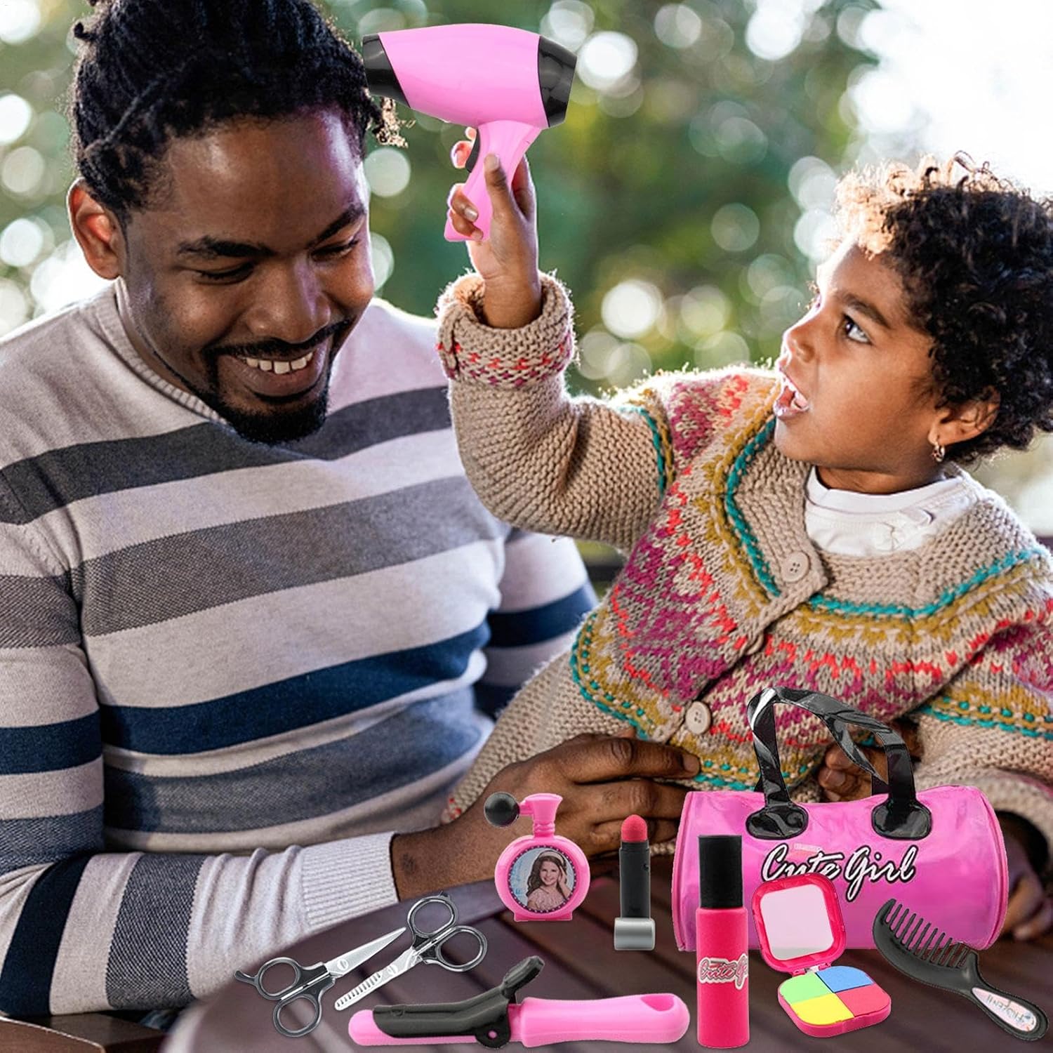 Batteria richiesta: completa di tutti gli strumenti necessari per il gioco fantasioso, incluso un asciugacapelli alimentato a batteria due batterie AA da 1,5 V non incluse, questo set è perfetto per le ragazze che vogliono vivere le loro fantasie da principessa Molto più durevole: realizzato in materiale ABS resistente, il nostro set di trucco di simulazione è costruito per durare. La sua straordinaria durata assicura che rimanga sicuro da indossare per un tempo incredibilmente lungo. Migliora il movimento fine: questo kit per il trucco simulato migliora lo sviluppo del bambino con il suo divertimento coinvolgente di ruolo, lezioni di base di acconciatura e un miglioramento delle capacità motorie. Incoraggiare la creatività promuovendo il controllo del motore fine Ottimo regalo: questo set di trucco simulato è perfetto per compleanni, regali di Natale o eventi in classe. Consigliato per bambini dai 3 anni e offre immaginazione e divertimento per le ragazze che amano giocare con il trucco Facile da lavorare con: questo set di trucco simulato include un asciugacapelli, uno specchio, diversi stili di ferro arricciato e due paia di forbici simulate che sono facili da usare con un pettino; Inoltre, una borsa per una pulizia conveniente