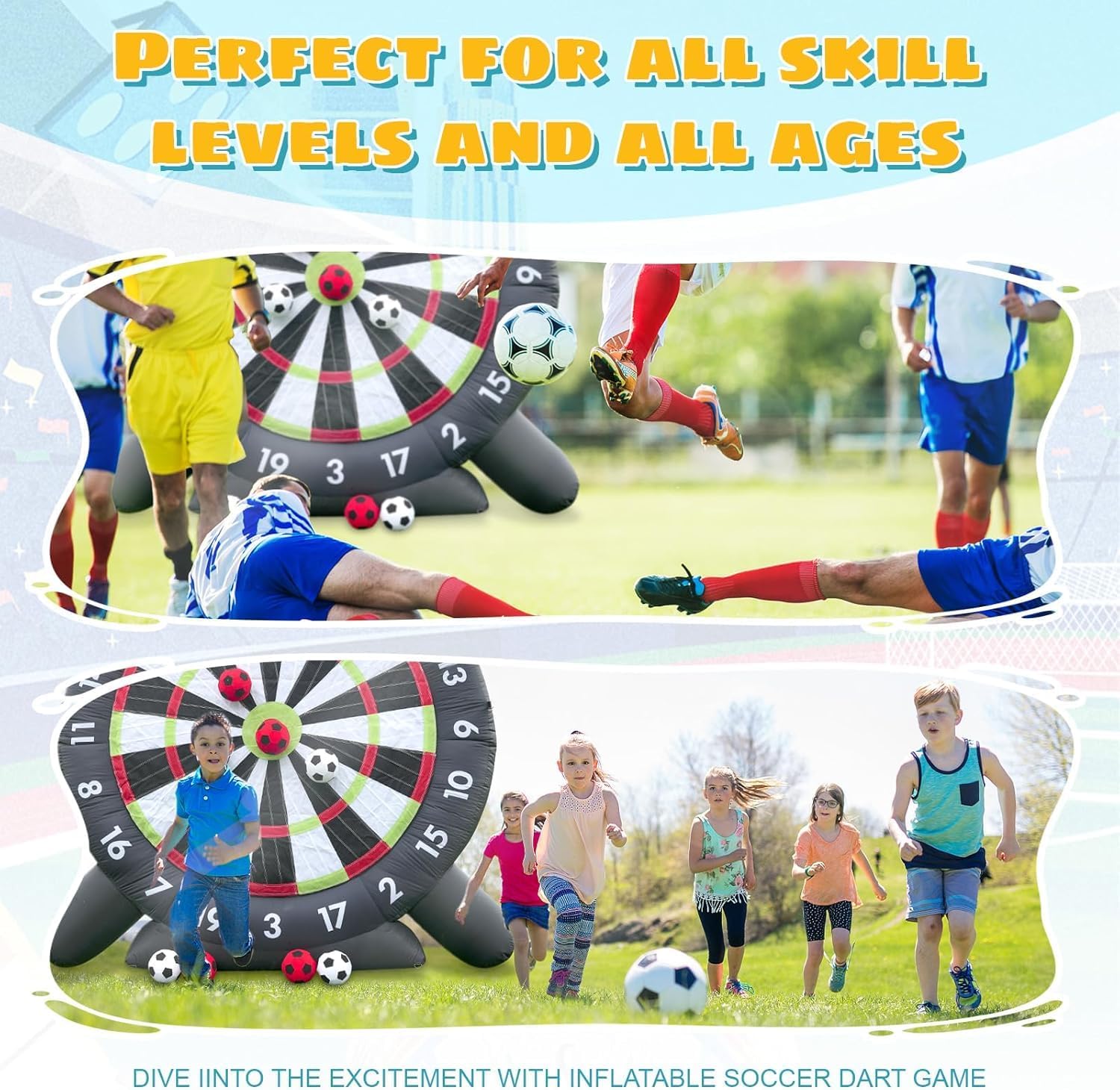 Freccette da calcio gonfiabili: montaggio semplice e comodo da riporre: il bersaglio gonfiabile da calcio e freccette può essere montato in soli 2 minuti o meno. Assicurarsi che sia ben chiuso con la cerniera prima di gonfiarlo. Si sgonfia facilmente e può essere ripiegato in modo compatto, rendendolo perfetto per il trasporto e lo stoccaggio. Evitare oggetti appuntiti durante la manipolazione per prevenirne l'usura. Freccette da calcio gonfiabili Maggiore durata e stabilità: il nostro bersaglio gonfiabile da calcio misura 3 metri per 3 metri ed è realizzato in tessuto Oxford 210d, antistatico e altamente resistente all'usura. Tutte le cuciture sono doppie e la superficie del bersaglio autoriparante offre una forte aderenza, consentendo un facile smontaggio senza danneggiare la palla. Freccette gonfiabili da calcio Design innovativo e divertente: il set include 8 palloni da calcio in feltro. Questo nuovo ed entusiasmante sport unisce calcio e freccette in un unico gioco. Il bersaglio gonfiabile oversize è ideale sia per bambini che per adulti, con superfici gonfiabili e autoadesive su cui è possibile calciare i morbidi palloni da calcio sul grande bersaglio in velcro per un'esperienza di punteggio divertente. Freccette da calcio gonfiabili Uso versatile: perfette per gli appassionati di calcio e rugby, le società di noleggio, le scuole, le gite in spiaggia, i campi estivi, gli eventi aziendali, le riunioni della comunità, le feste in giardino e per promuovere uno stile di vita attivo con la famiglia e gli amici, favorendo al contempo il lavoro di squadra. Freccette gonfiabili da calcio Kit completo di accessori: include 8 palloni da calcio, 1 soffiatore, 1 pompa ad aria, 8 picchetti, 4 corde e 4 sacchi di sabbia. Il nostro servizio clienti è disponibile 24 ore su 24, 7 giorni su 7. Non esitate a contattarci online in qualsiasi momento per ulteriori informazioni sui nostri prodotti.