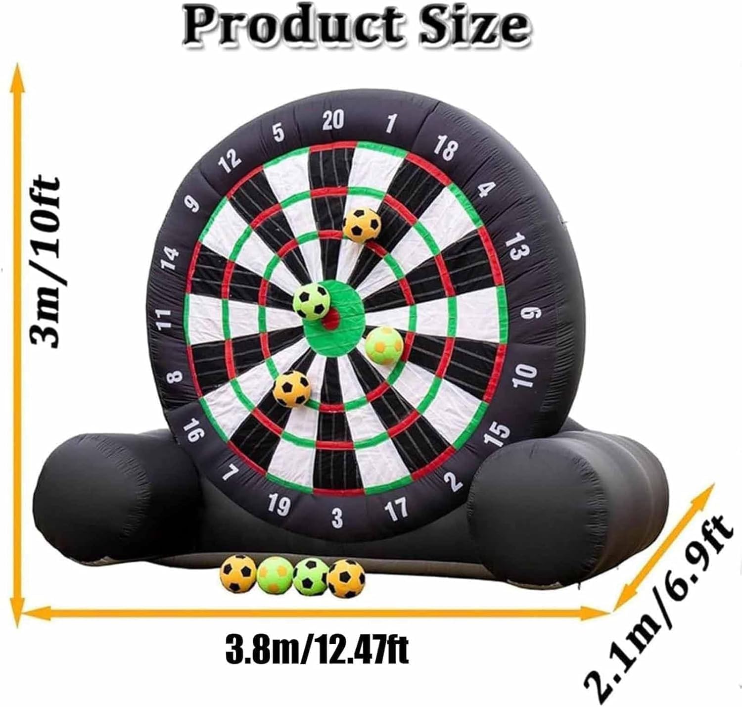 Freccette da calcio gonfiabili per esterni. Facile da montare in meno di 2 minuti e comodo da riporre dopo lo sgonfiaggio per un trasporto senza problemi. Freccette da calcio gonfiabili per esterni Realizzate in resistente tessuto Oxford, rinforzate con doppie cuciture e con un design a freccette con telaio triangolare per una maggiore stabilità. Il pallone da calcio gonfiabile per esterni include un pallone da calcio in feltro ed è dotato di una superficie autoadesiva, progettata per essere morbida e sicura per giocatori di tutte le età. Pallone da calcio gonfiabile per esterni, perfetto per una varietà di contesti, tra cui attività di noleggio, scuole, campeggi ed eventi, per incoraggiare uno stile di vita attivo. Il pacchetto completo di accessori per freccette da calcio gonfiabili da esterno include 8 palloni da calcio, 1 soffiatore d'aria, 1 pompa, 8 picchetti da terra, 4 corde e 4 sacchi di sabbia.