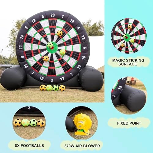 Freccette da calcio gonfiabili: montaggio e stoccaggio rapidi: progettato per la praticità, il bersaglio gonfiabile per freccette da calcio può essere montato in meno di 2 minuti. Dimensioni: 3,6x2,1x3 m (12x6,9x10 piedi) per una facile trasportabilità. Dimensioni del bersaglio gonfiabile per freccette da calcio: il nostro bersaglio gonfiabile per freccette da calcio per esterni misura 3,6x3x2 m (11,8x10x6,5 piedi), realizzato in resistente tessuto Oxford che previene l'elettricità statica e aumenta la resistenza all'usura. Freccette da calcio gonfiabili Caratteristiche entusiasmanti: Include un pallone da calcio in feltro. Combina l'emozione del calcio e delle freccette, rendendo questo bersaglio per freccette di grandi dimensioni perfetto per giocatori di tutte le età. Freccette da calcio gonfiabili Applicazioni versatili: ideali per gli appassionati di calcio, le aziende di noleggio, le scuole, le gite in spiaggia, i campi estivi, gli eventi aziendali, le riunioni della comunità, le feste in giardino e per promuovere uno stile di vita attivo e il lavoro di squadra. Freccette da calcio gonfiabili con maggiore aderenza: sperimenta un gioco senza frustrazioni con il nostro bersaglio extra adesivo che garantisce la massima aderenza delle freccette, ma consente anche una facile rimozione per tutti i giocatori, compresi i bambini più piccoli.