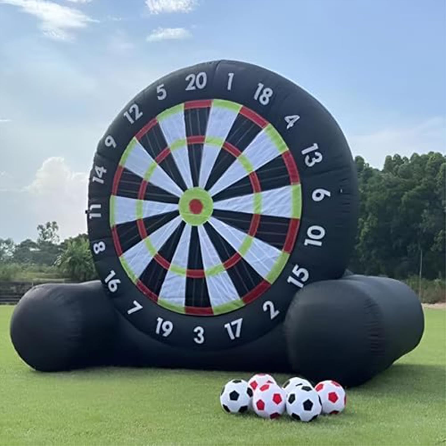 Base ultra stabile per freccette da calcio gonfiabili da esterno: realizzata in resistente tessuto in PVC, la freccetta gonfiabile è progettata per resistere all'usura e prevenire l'elettricità statica. La sua base migliorata garantisce la stabilità anche in caso di vento, offrendo un'esperienza di gioco affidabile. Gioco di freccette gonfiabile da calcio per esterni: goditi ore di divertimento con 8 palloni da calcio in feltro inclusi in colori casuali. Il gioco di freccette da calcio unisce l'emozione del calcio e delle freccette, con un grande bersaglio in velcro che permette anche ai giocatori più piccoli di calciare facilmente le palline pelose e di attaccarle al bersaglio. Gonfiaggio rapido per freccette da calcio gonfiabili da esterno: gonfia questo gigantesco gioco fino a oltre 3 metri di altezza in meno di 5 minuti, con tempi di attesa minimi. Continua a divertirti gonfiandolo continuamente durante l'uso e ricorda di chiudere la cerniera prima di iniziare il processo di gonfiaggio. Bersaglio da calcio gonfiabile per esterni. Cosa riceverai: il pacchetto include un bersaglio per freccette da 3,6x2,1x3 m (12x6,9x10 piedi), un potente soffiatore da 370 W, 8 palloni da calcio, una pompa manuale, un telo di riparazione, 4 corde e 4 picchetti da terra. Scegli questo gioco sportivo con bersaglio per freccette per un'esperienza eccezionale e indimenticabile ovunque tu giochi. Ampie applicazioni del bersaglio gonfiabile per freccette da calcio per esterni: il bersaglio gonfiabile per freccette da calcio per esterni è perfetto per gli appassionati di calcio e football, le aziende di noleggio, le scuole, le gite in spiaggia, i campi estivi, gli eventi aziendali, le riunioni della comunità, le feste in giardino e chiunque desideri promuovere il divertimento attivo e il lavoro di squadra tra amici e familiari.