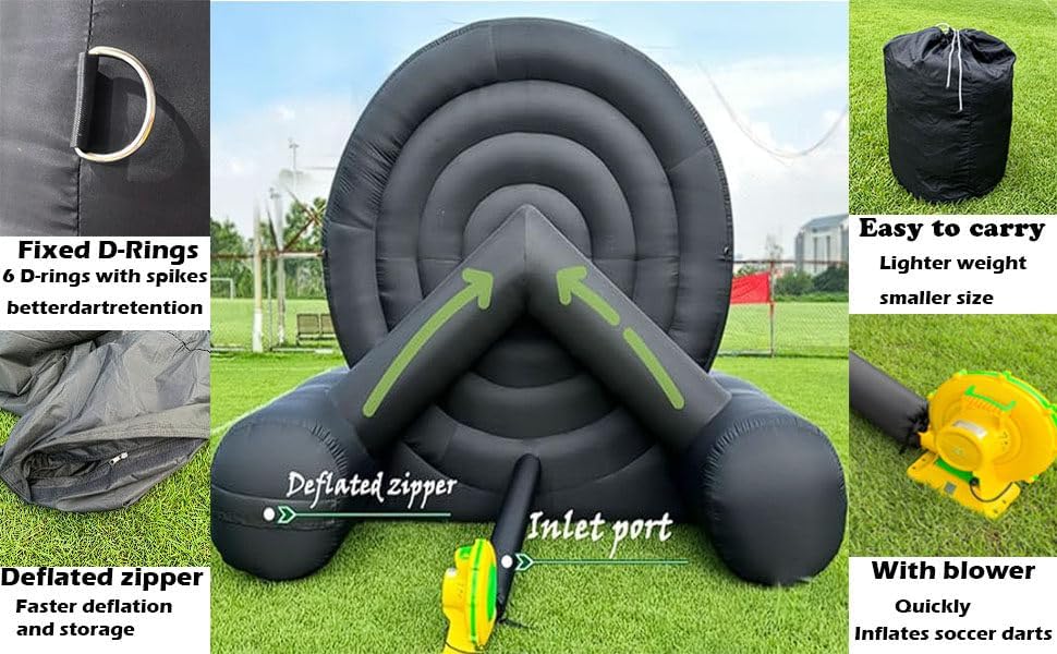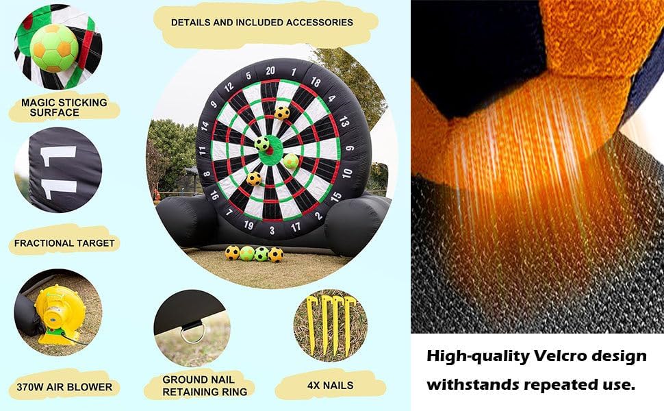 Base ultra stabile per freccette gonfiabili da calcio: realizzata in robusto tessuto Oxford, questa freccetta gonfiabile offre un'eccezionale resistenza all'usura. Il design migliorato della base garantisce stabilità anche in condizioni di vento, offrendo una piattaforma di gioco sicura. Bersaglio gonfiabile per freccette da calcio: include 8 palloni da calcio in feltro colorati, che uniscono l'emozione del calcio alla precisione delle freccette per un'esperienza di gioco unica nel suo genere. Progettato per una presa ottimale, rende facile per giocatori di tutte le età rimuovere le palline dal bersaglio. Calcio gonfiabile da esterno gigante con freccette: progettato per un montaggio rapido, il gonfiaggio richiede meno di 5 minuti e raggiunge un'altezza di oltre 3 metri. Per risultati ottimali, si consiglia un gonfiaggio continuo durante il gioco, con una comoda chiusura a cerniera per un facile trasporto. Attività divertente per il giardino con freccette e calcio gonfiabile: questo set completo comprende un bersaglio per freccette da 3,6 x 2,1 x 3 m, un soffiatore da 370 W, 8 palloni da calcio, una pompa manuale, un telo per riparazioni, 4 corde e 8 picchetti da terra, offrendo tutto il necessario per un'esperienza di gioco senza pari. Gioco di calcio gonfiabile per esterni con freccette: ideale per gli amanti del calcio e del football, questa versatile configurazione è perfetta per servizi di noleggio, scuole, gite in spiaggia, campi estivi, riunioni aziendali e feste in giardino, favorendo il lavoro di squadra e uno stile di vita attivo per amici e familiari.