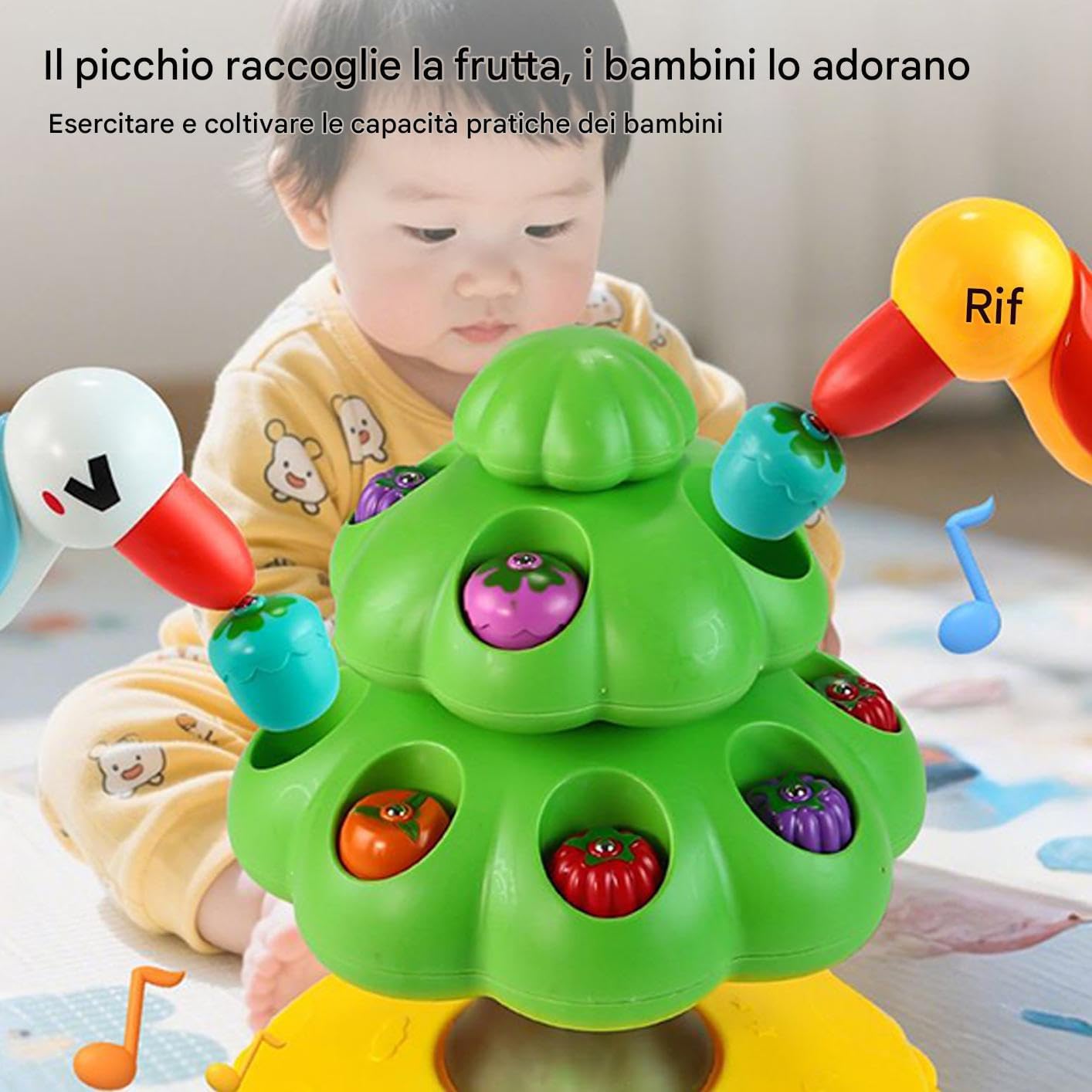 Design Accattivante: Giocattolo da con picchio magnetico per attività interattive che simulano movimenti naturali, potenziando la coordinazione occhio-mano e affinando la precisione di presa durante il gioco coinvolgente Stimolo Mentale: Attraverso il riconoscimento di forme di frutta e attività di ruolo, questo gioco di attiva la mente dei bambini, favorendo la crescita intellettiva introducendo concetti base su piante e animali in modo interattivo e piacevole Facile da usare: Migliora la motricità fine con montaggio graduale, stimolando pensiero logico e percezione spaziale per esperienze di gioco coinvolgenti che favoriscono lo sviluppo cognitivo dei bambini in modo naturale ed Stimolazione Sensoriale: Tre velocità regolabili con effetti sonori e luminosi coinvolgenti favoriscono lo sviluppo sensoriale del bambino, migliorando concentrazione e curiosità grazie all'affascinante funzione rotante Graduale: Migliorando la competenza operativa e sviluppando le abilità motorie, potenzia la di presa con sfide progressive che perfezionano la coordinazione, promuovendo intrattenimento pratico e coinvolgente
