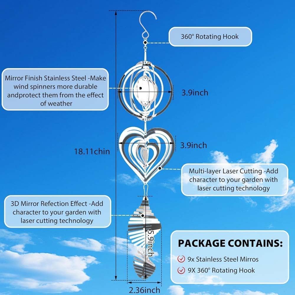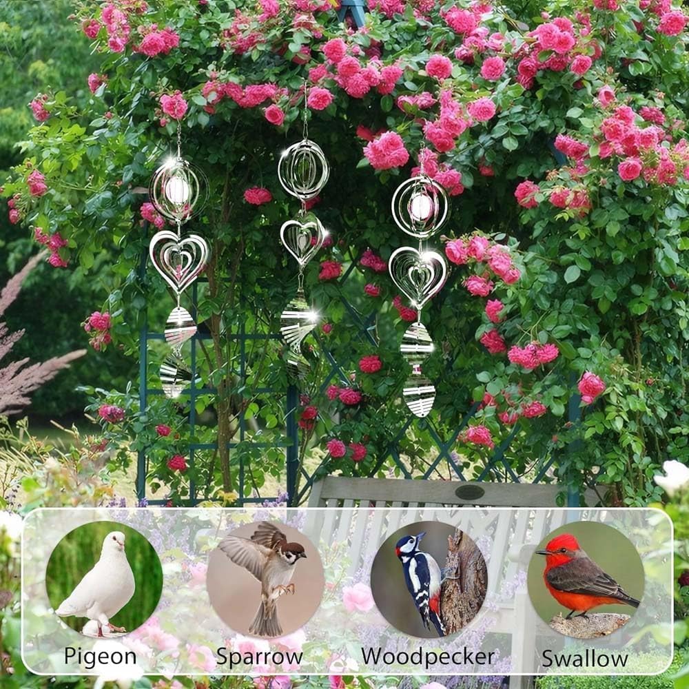 La confezione include: Rivelerai il campanello a vento 3D in acciaio inossidabile, il campanello a vento in metallo è composto da tre parti: un cerchio, un cuore e una foglia. Le nostre girandole ornamentali 3D riflettenti visive utilizzano il movimento del vento e i riflessi di luce per tenere gli uccelli lontani da qualsiasi angolazione. Invece di spaventare e danneggiare gli uccelli, il nostro dispositivo spaventa umanamente li spaventa riflettendo la luce visiva. Materiale di alta qualità: le nostre girandole a vento sono realizzate in acciaio inossidabile resistente con tecnologia di taglio laser per formare una forma vivida. Rifinito con rivestimento in vernice antiruggine, l'arredamento del cortile esterno mostra prestazioni solide a prova di tempo e può adattarsi a tutti i tipi di tempo, sia soleggiato, nuvoloso o piovoso. Con forte resistenza alla corrosione e alla ruggine. Design unico: le nostre sculture a vento 3D da appendere non solo fungono da deterrente per uccelli, ma anche come bella decorazione da giardino. I nostri dispositivi spaventosi per uccelli all'esterno della decorazione del giardino esterno utilizzano movimento del vento e riflessi di luce per tenere gli uccelli lontani da qualsiasi angolazione. Facile da usare: il dispositivo di paura degli uccelli arriva completamente assemblato, pronto per essere appeso e iniziare a lavorare immediatamente. Il girandola riflettente può essere semplicemente montato attaccando un gancio girevole, che dispone di un'apertura per appenderlo facilmente. Ampia applicazione: questa girandola a vento è adatta per uso interno ed esterno, la girandola a vento non può essere utilizzata solo come decorazioni su pareti interne, finestre e lampadari. Puoi anche metterli su alberi esterni, balconi, piscine, cortili e giardini come parte della decorazione del giardinaggio. Sono così belli che ruotano al vento e riflettono la luce del sole.