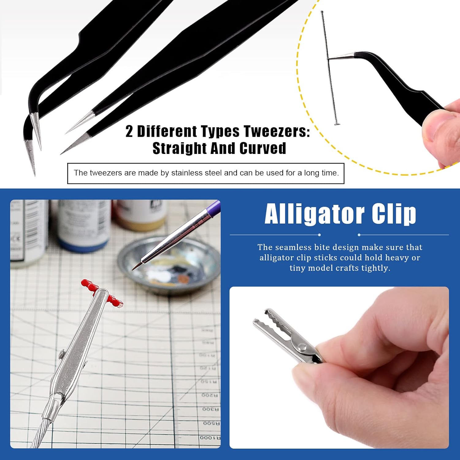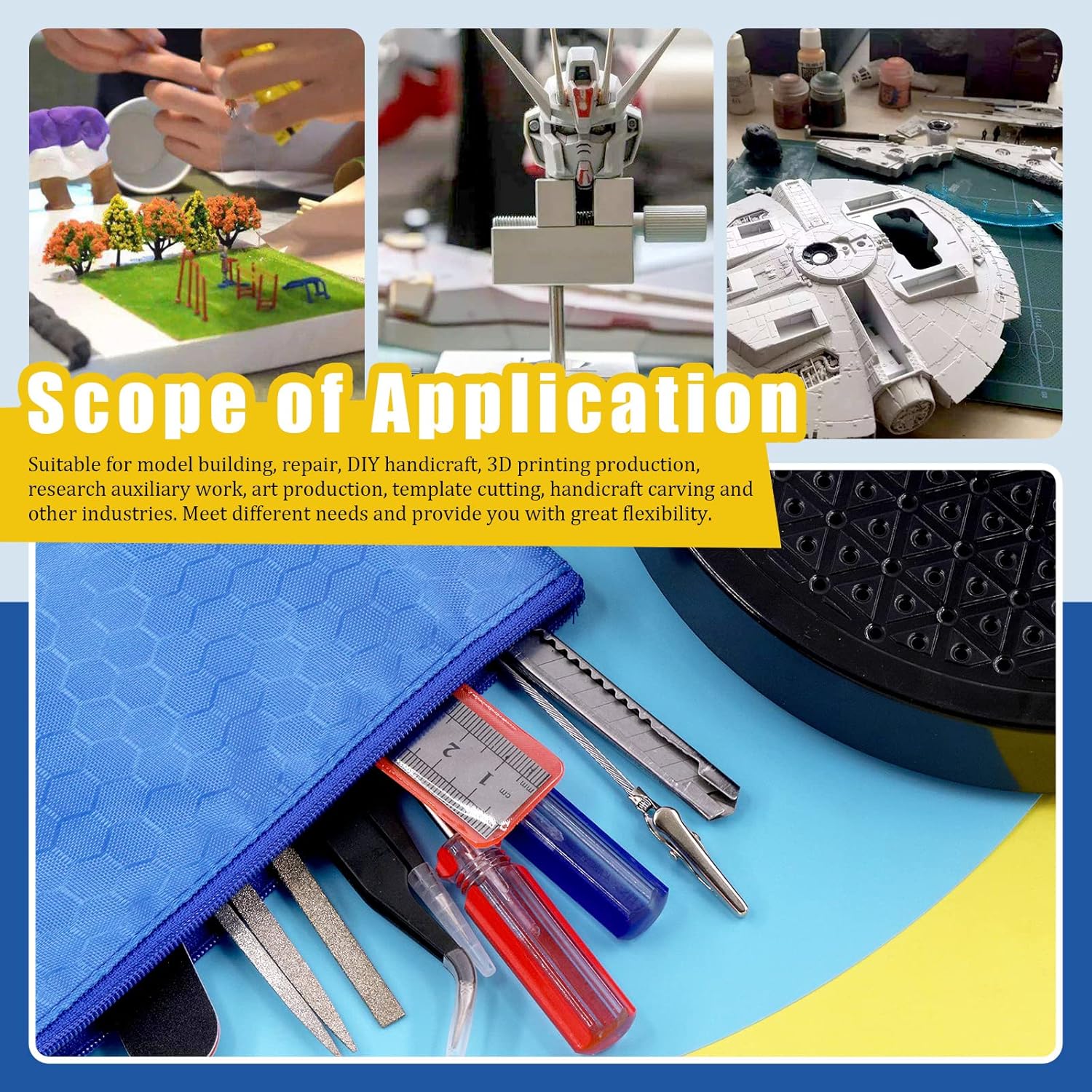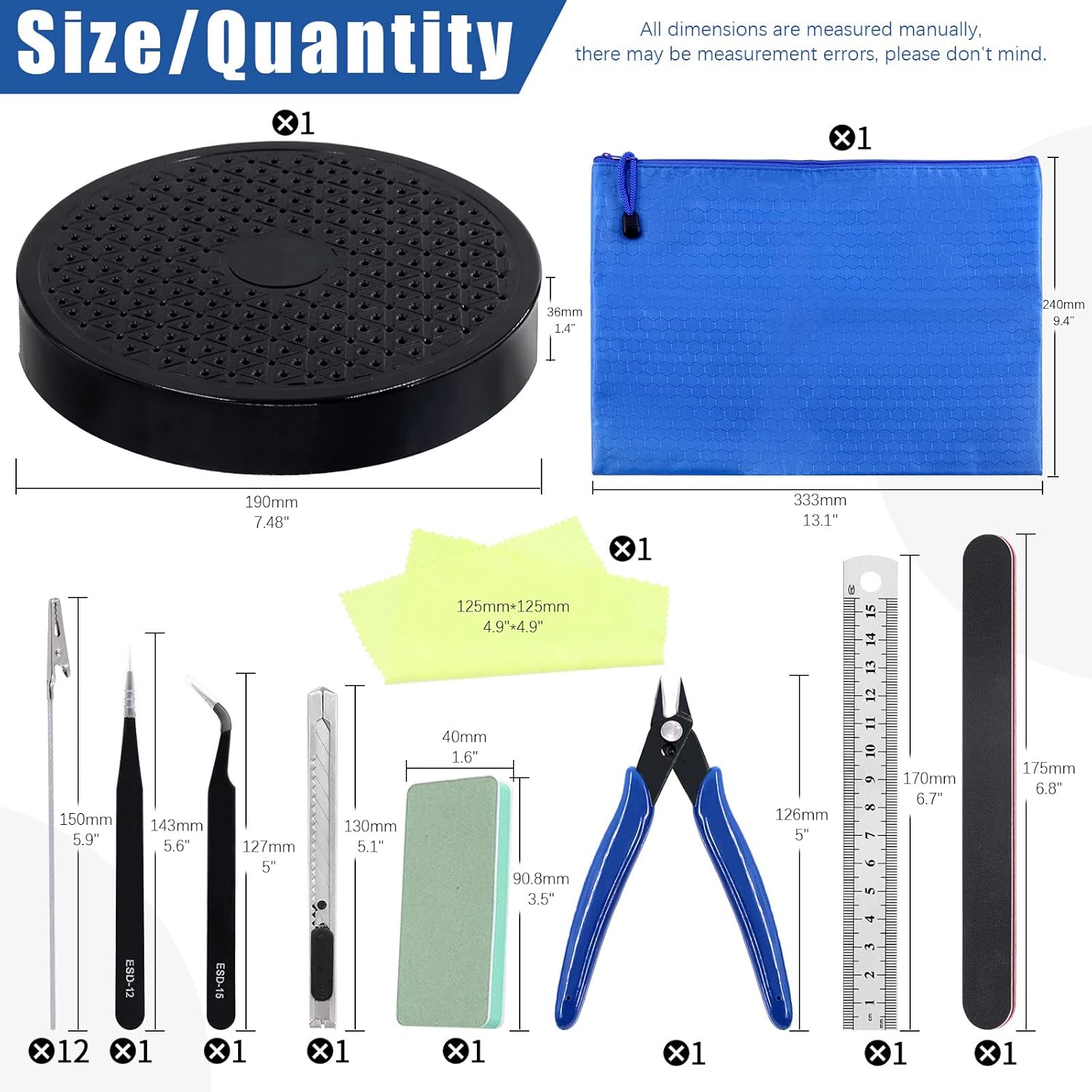 Contenuto della confezione: riceverai 1 righello dritto, 1 cacciavite a taglio, 1 cacciavite Phillips, 2 pinzette, 1 pinza da taglio, 2 barre di lucidatura, 3 file di stoffa, 1 coltello artistico, 1 sacchetto di file blu, con 1 supporto per pittura a 360 gradi e 12 bastoncini a coccodrillo da 150 mm, totalmente 27 pezzi. Questo kit può fornire quasi tutti gli strumenti necessari per la creazione di modelli, risparmiare tempo e denaro nella selezione. Materiale di alta qualità: la maggior parte degli strumenti è realizzata in acciaio al carbonio di alta qualità, forte e durevole. Il resto degli strumenti è realizzato con materiali temprati, resistenti agli acidi e anticorrosione. Il supporto del modello per la pittura è realizzato in plastica, i bastoncini a coccodrillo sono realizzati in ferro e sono dotati di punta in gomma. Ogni strumento soddisfa rigorosi standard di qualità e ben fatto, ideale per i tuoi progetti artigianali. Strumenti pratici: la pinza da taglio con testa affilata e manico ergonomico può aiutarti a tagliare facilmente il filo metallico. La lima è perfetta per modellare cose che richiedono lavori di precisione di dettaglio su piccole superfici e aree strette. Phillips e cacciaviti piatti adatti per installare e rimuovere diverse viti. Le barre di lucidatura sono utilizzate per levigare superfici ruvide e irregolari dei modelli. Il panno per occhiali può aiutarti a pulire la ghiaia fine dopo la macinazione. E altri strumenti per soddisfare le tue diverse esigenze. Clip a coccodrillo e supporto base a 360 gradi): queste clip a coccodrillo sono dotate di punte in gomma resistente, che possono proteggere bene le parti del modello da graffi e non danneggiare l'articolo da bloccare. Il design senza cuciture del morso assicura che i bastoncini a clip a coccodrillo possano contenere saldamente i modelli pesanti o minuscoli. E la base del supporto per pittura con modello di rotazione a 360 gradi consente di vedere tutte le direzioni e gli angoli per aerografo, hobby fai da te. Ampia applicazione: ampiamente utilizzato nella costruzione di modelli, riparazioni, artigianato fai da te, produzione di stampa 3D, ricerca lavori ausiliari, produzione artistica, taglio di modelli, scultura artigianale e altre industrie. Questo kit di attrezzi Gundam è perfetto per riparazioni generali a casa, produzione avanzata fatta a mano, o arti e mestieri personali, adatto per un principiante e amante del modellismo.