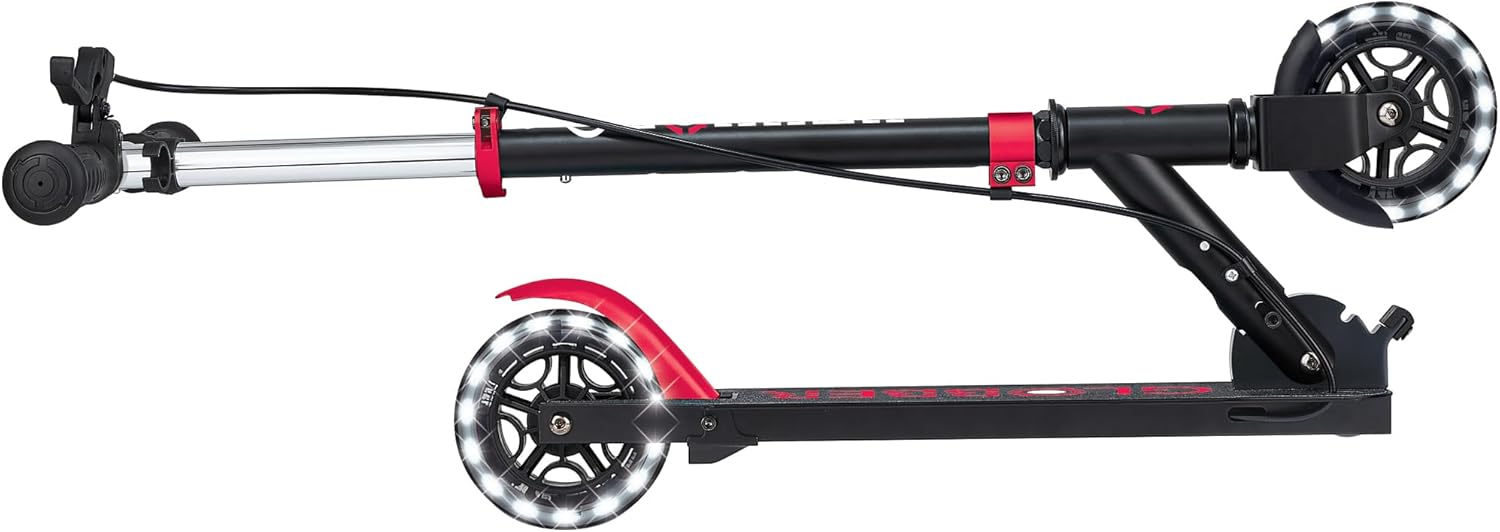 Sistema pieghevole brevettato facile, veloce e sicuro; basta sollevare il pulsante verso l'alto per mettere lo scooter in modalità autoportante o piegato. Barra a T regolabile in 3 altezze (69,6 cm - 79,5 cm) con morsetto facile da usare e freno sul manubrio. Impugnature ergonomiche comode e resistenti con manubrio pieghevole. Morsetto doppio anodizzato in alluminio estruso. Ruote LED da 5 pollici di alta qualità, ad alto rimbalzo e senza batteria che lampeggiano in bianco, montate su cuscinetti ABEC 9, per corse luminose che durano quanto puoi andare in monopattino: più velocemente vai, più luminoso brillo! Robusto ponte rinforzato interamente in alluminio con nastro antiscivolo antiscivolo. Il freno posteriore in metallo offre efficienza dei freni e prolunga la longevità delle ruote.