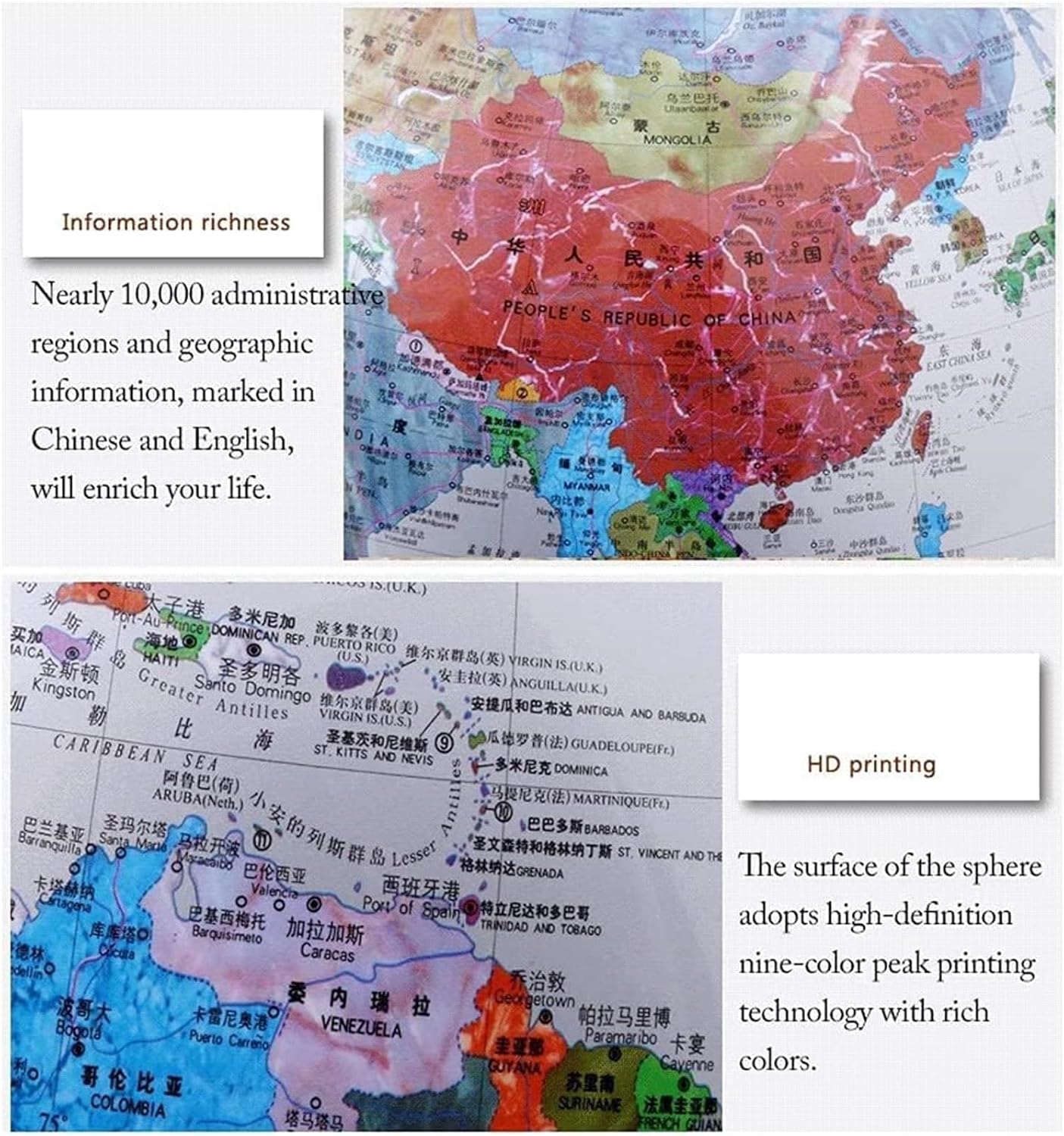 I mappamondi da tavolo aggiungono un tocco senza tempo di raffinatezza e curiosità intellettuale a qualsiasi interno di casa o ufficio. La sfera è realizzata in ABS ecologico e la staffa è in acciaio inossidabile 304. Staffa e base in acciaio inossidabile 304, staffa in acciaio inossidabile opaco, delicata e stabile, senza scolorimento. Montato su meridiana piena e base con finitura argento. Ecco un globo assemblato. Progettato per gli studenti, affidabile e durevole, semi-meridiano e base solidi, rotazione terrestre senza soluzione di continuità Quasi 10.000 aree amministrative e informazioni geografiche, contrassegnate sia in cinese che in inglese, arricchiscono la tua vita.