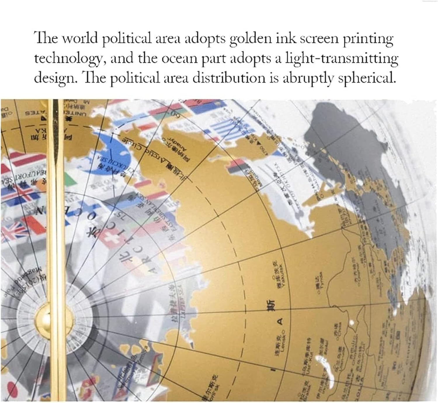 Bellissimo mappamondo accattivante, perfetto per la decorazione della casa e dell'ufficio, con un look elegante e moderno o per abbinarsi ai colori della posizione prescelta. Il globo terrestre è realizzato in materiale ecologico (acrilico), che ha una buona trasmissione della luce e stabilità chimica, e la sfera di cristallo è resistente all'usura e impermeabile. Base in metallo sintetico robusta ed elegante, stabile e non traballa. La superficie adotta la tecnologia di serigrafia ad alta definizione, con colori chiari, scrittura chiara, visione chiara e strati trasparenti. L'interno della sfera è costituito da un cubo acrilico trasparente rotante stampato con il motivo della bandiera del mondo. La squisita fattura delle perle dell'equatore è cristallina come il cristallo e l'identificazione e l'isolamento sono più chiari.