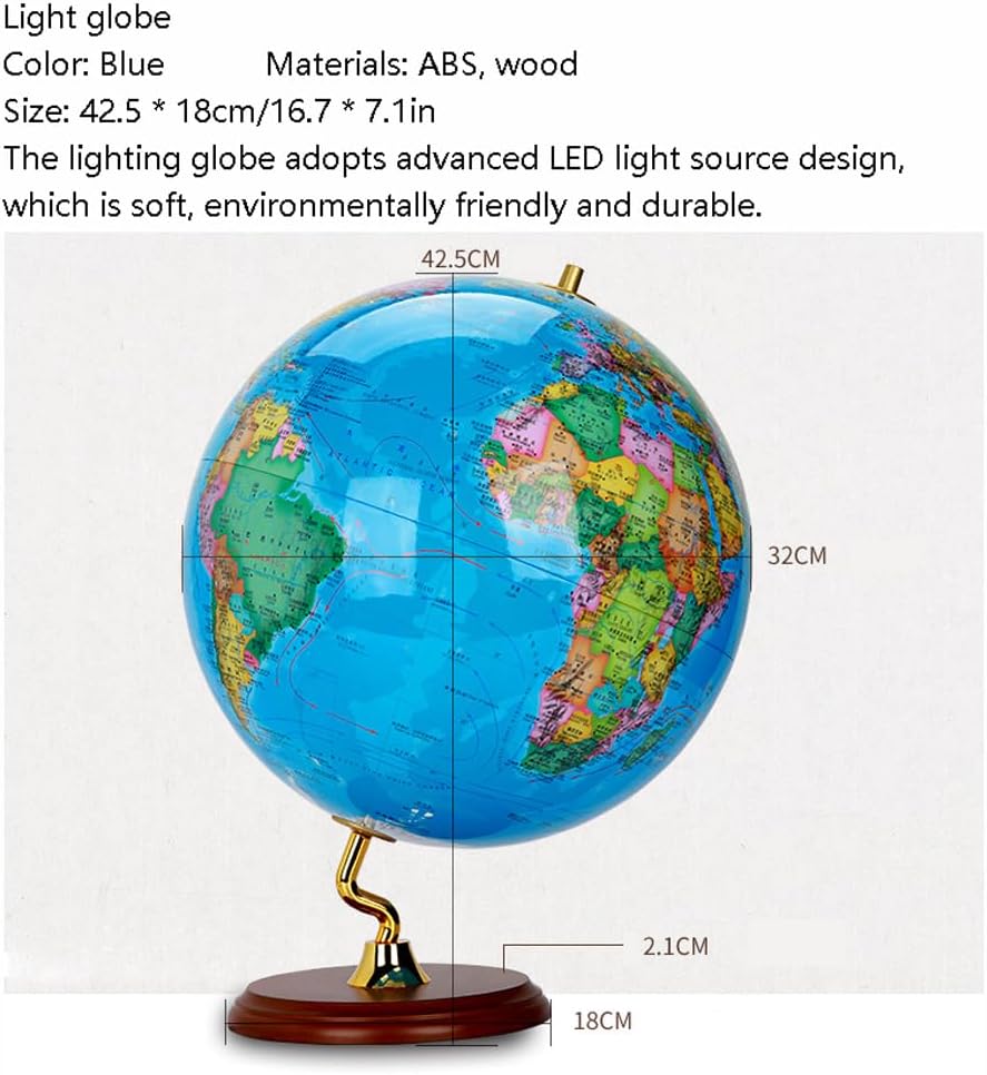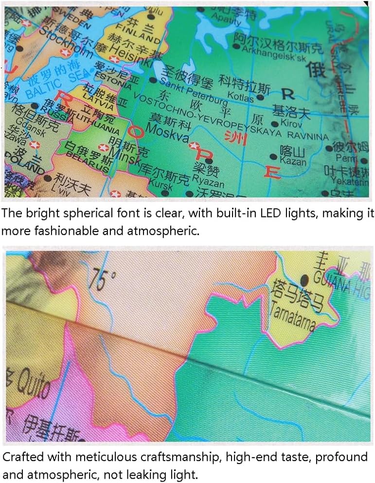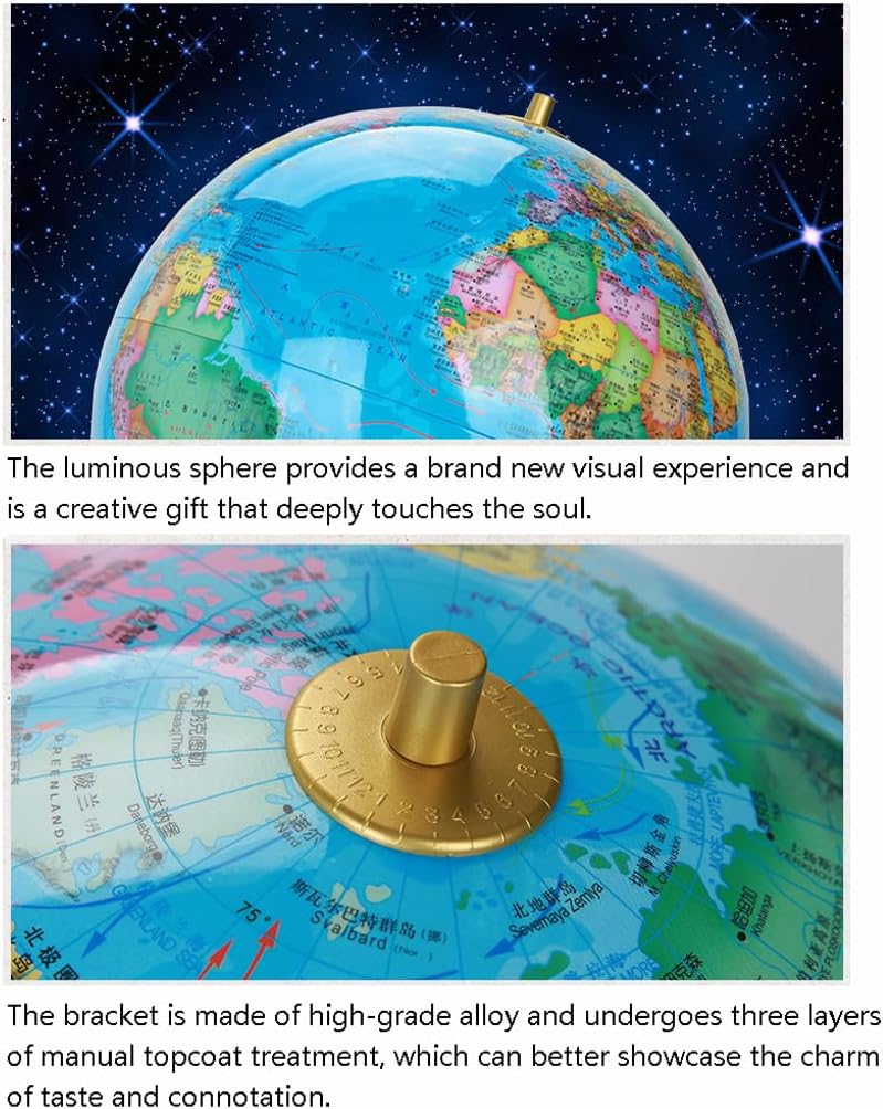 *Un globo vibrante e visivamente accattivante catturerà l'attenzione dei tuoi figli e studenti, rendendo l'apprendimento più piacevole e aggiungendo elementi divertenti e coinvolgenti all'ambiente di apprendimento. Realizzato con materiali di alta qualità, sfera in ABS, con elevata resistenza e tenacità, lunga durata, non facilmente danneggiabile, realizzato con cura con gusto esclusivo, grande connotazione e nessuna perdita di luce. *La staffa è realizzata in lega di alta qualità ed è sottoposta a tre strati di trattamento manuale di finitura, che possono mostrare meglio il fascino del gusto e della connotazione. La base è realizzata in palissandro di alta qualità e il palissandro inodore e atossico lo rende più elegante e nobile. *Il globo luminoso adotta un design avanzato della sorgente luminosa a LED, che è morbido, ecologico e durevole. Il carattere sferico luminoso è chiaro, più alla moda e atmosferico. La sfera luminosa offre un'esperienza visiva completamente nuova ed è un dono creativo che tocca profondamente l'anima. *Il globo retrò, il globo di grandi dimensioni può visualizzare più chiaramente i contorni di ogni paese e regione. Resistente e duraturo, dona un tocco di raffinatezza e fascino alla decorazione della tua casa e dell'ufficio.