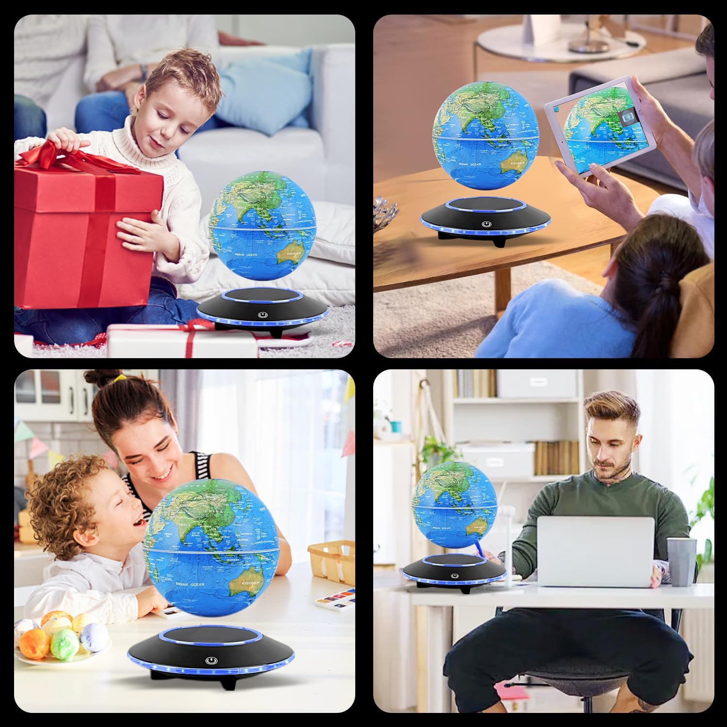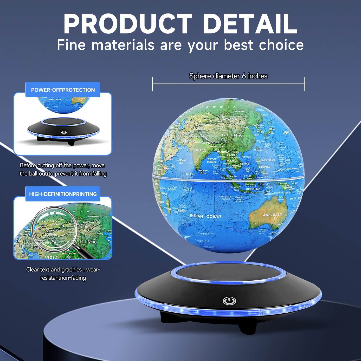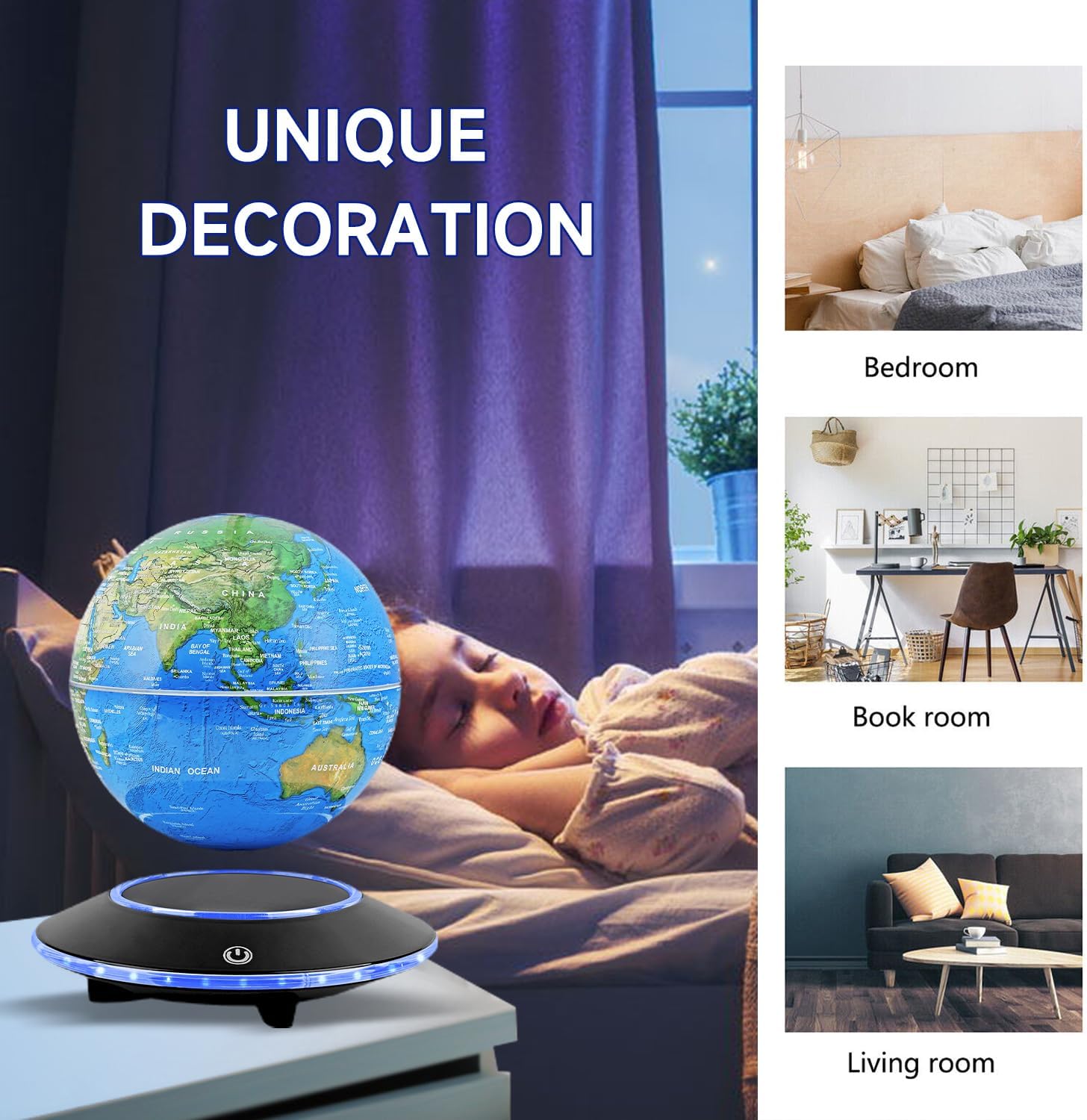 Mappamondo fluttuante e rotante: con tecnologia di levitazione magnetica. Il globo galleggia e ruota automaticamente in aria. A causa dell'azione magnetica della corrente elettrica, il globo galleggia nell'aria e ruota fino a quando non si scontrano con qualcosa o la corrente non si spegne. Luci LED di controllo touch: luce LED bianca integrata. Toccare l'icona di accensione sulla base per accendere o spegnere separatamente la lampada a sfera o la lampada del piedistallo. Al buio, sembra molto cool e bello acceso. Può essere utilizzata come lampada da notte decorativa, lampada d'atmosfera o espositore a casa, ufficio, negozio, ecc. Lezioni di geografia: questo globo da 15 cm mostra chiaramente e accuratamente la geografia del mondo. Il mondo fluttuante è un grande strumento didattico che aiuta i bambini a conoscere la terra e la posizione geografica dei singoli paesi, avvicinando loro il principio della levitazione. Suscita la curiosità e l'interesse dei bambini. Il globo magnetico galleggiante ha un sistema di protezione di spegnimento. Una volta interrotta l'alimentazione, il globo si attacca automaticamente alla base, proteggendolo efficacemente dalle cadute e garantendo sicurezza e durata. Regali creativi: il globo galleggiante è un gadget molto originale. È ideale anche come regalo per compleanni, anniversari, Natale, festa del papà, festa della mamma, amanti, amici, colleghi, ecc.