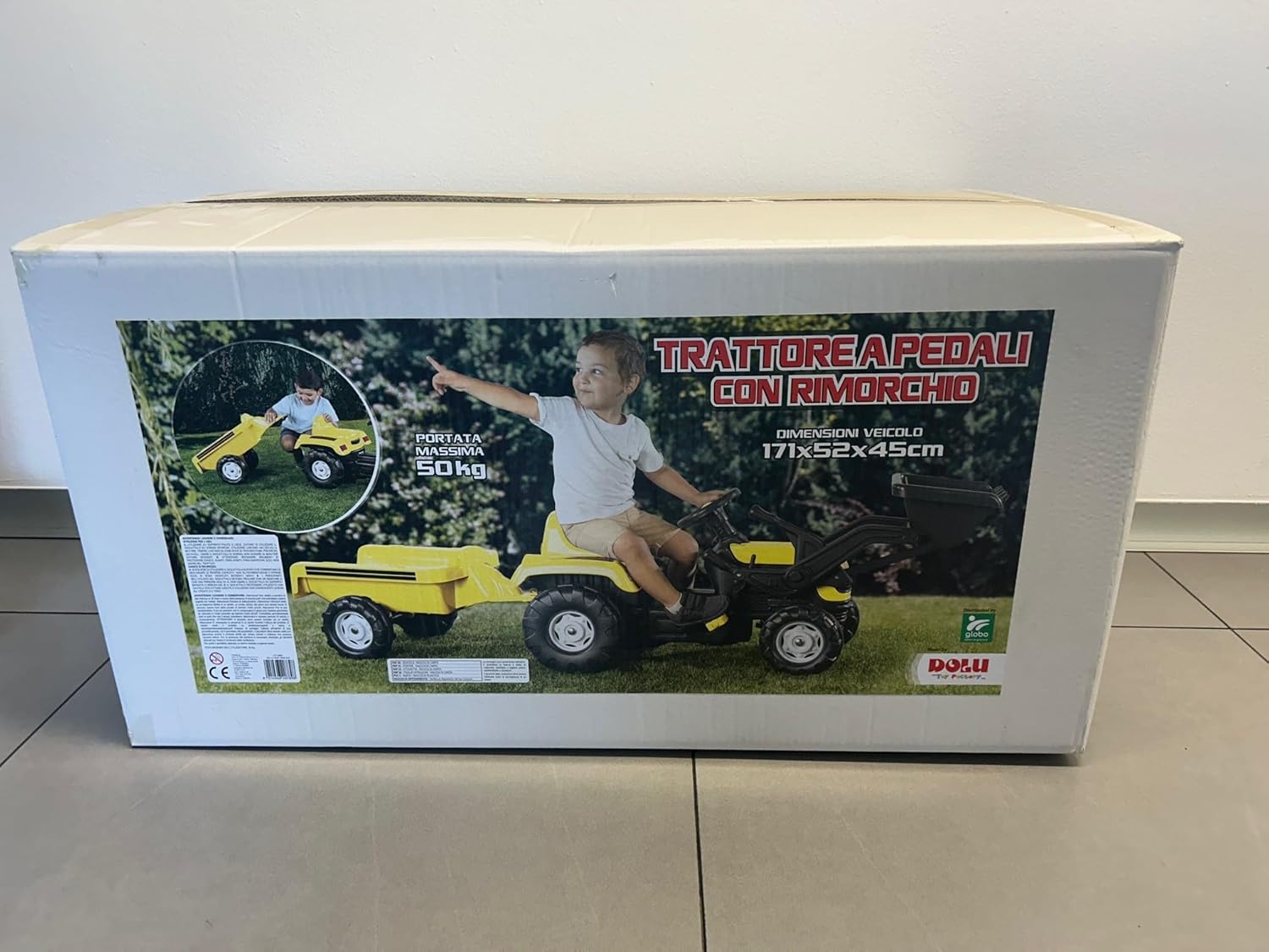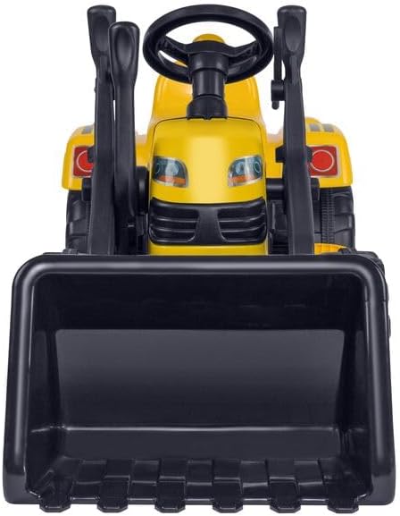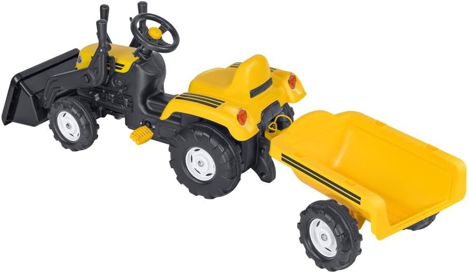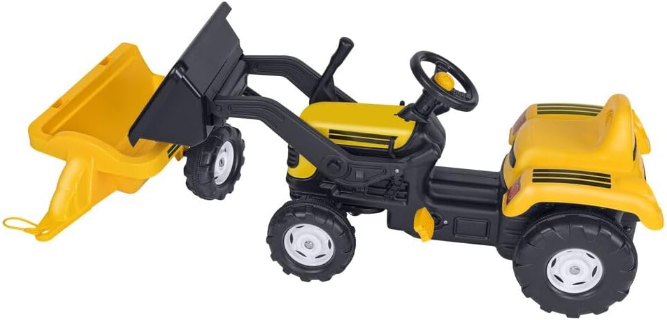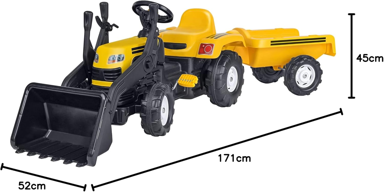 Trattore a pedali con rimorchio e benna Rimorchio facilmente staccabile Benna regolabile grazie alla leva presente accanto al volante Colore: Giallo Portata massima: 50 kg Età: 36 mesi + Dimensioni: 171 x 52 x 45