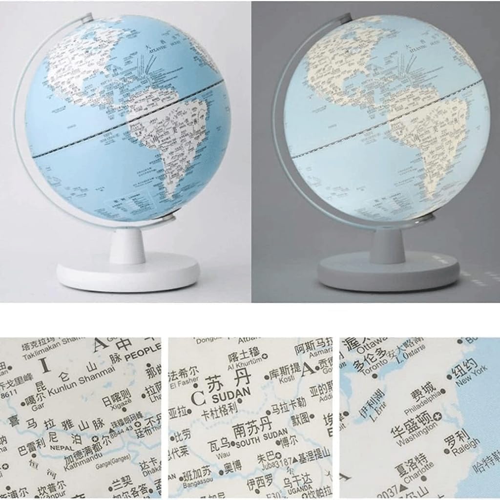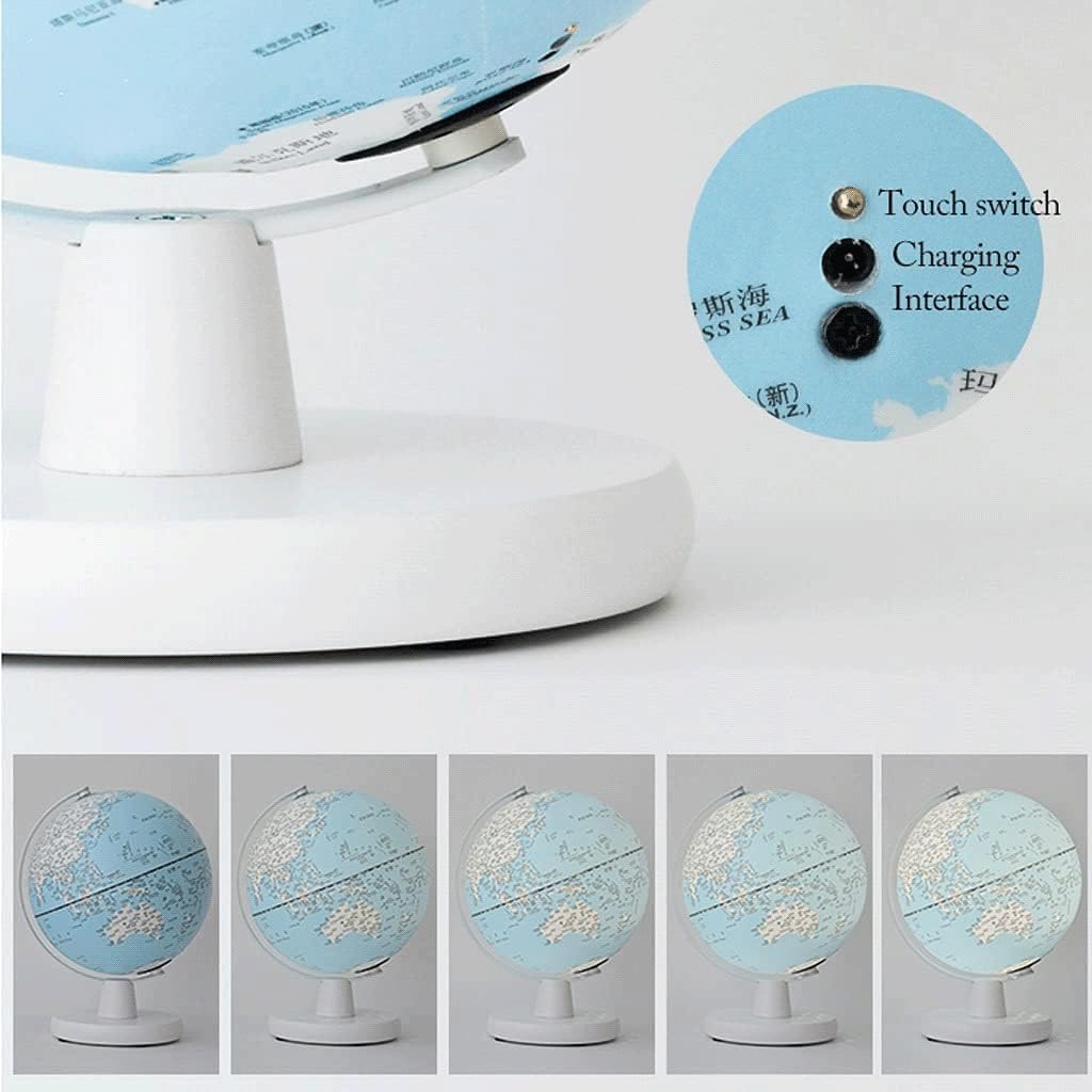 1: Lampada da tavolo globo 2 in 1: bilingue in cinese e inglese, ricca di conoscenze, interessante da imparare, ha un bell'aspetto anche se è accesa o spenta. 2: Accendi il globo di notte, gira la sfera, come se il mondo intero fosse tuo. 3: Funzionamento semplice: interruttore tattile, regolazione continua della luminosità: premere a lungo l'"interruttore tattile" per regolare la luminosità, premere brevemente per accendere la luce del globo. 4:Design di ricarica: durante la ricarica, verrà visualizzata una luce rossa accanto all'interfaccia, la luce rossa scompare, indicando che la batteria è completamente carica. 5: ricarica per 3 ore, la luce può essere accesa continuamente per 2-5 ore, (la durata della batteria sopra varia in base alla luminosità)