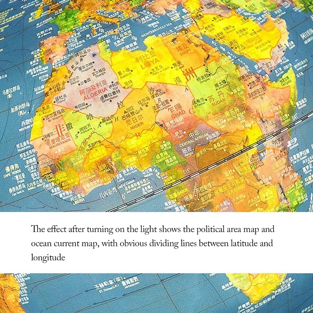 Grafica nitida: stampata con le migliori attrezzature di stampa a sei colori (grafica non dipinta a mano), utilizzando inchiostro anti-UV che non sbiadisce per dieci anni, grafica ad alta definizione ed effetti visivi più realistici. COSTRUZIONE DI ALTA QUALITÀ: il mappamondo LED blu intenso è sostenuto da una struttura e una base in metallo di alta qualità, che garantiscono la stabilità del piano del tavolo o del tavolo, abbastanza resistente per tutte le tue esplorazioni quotidiane. Globo luminoso: cerca paesi o laghi al buio, oppure usalo come luce notturna mentre dormi. Non solo migliorerai le tue competenze geografiche, ma il globo è anche dotato di luci LED integrate, così puoi illuminarlo quando ne hai bisogno. DECORAZIONE CLASSICA PERFETTA: con una rotazione di 720°, puoi ruotare il globo attorno al suo asse per trovare una posizione geografica o accendere le luci per creare l'atmosfera perfetta in qualsiasi stanza. Divertimento:: Con questa grande Terra, imparare non potrebbe essere più facile. Oltre a paesi e acque, la Terra include anche capitali, confini continentali, confini regionali e altro ancora.
