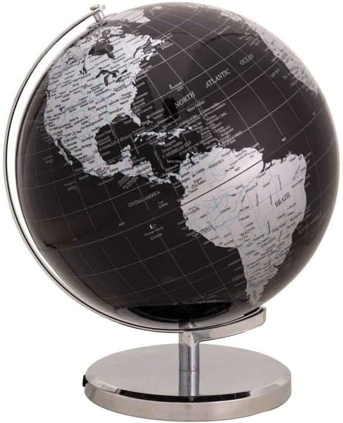 TROIKA Globo terrestre originale di 25 cm di diametro. Globo luminoso con un'altezza totale di 32 cm, girevole su una robusta base in metallo cromato. Altre caratteristiche: cavo nero con spina europea e interruttore. Globo terrestre a LED con immagine della mappa illuminata. Le terre sono d'argento e i mari sono neri. Il globo è etichettato in inglese e mostra continenti, paesi, oceani, aree geografiche, principali città e montagne. Funzionale e decorativa: l'illuminazione LED integrata con luce calda unisce la geografia con un'atmosfera calda. Crea un ambiente confortevole per la scoperta e l'apprendimento. Valore aggiunto: con i suoi dettagli realistici e la lavorazione di alta qualità, il mappamondo non è solo un elemento decorativo, ma anche uno strumento educativo per menti curiose di tutte le età.. Dimensioni totali: 250 x 250 x 320 mm, 1008 g - confezionato in confezione regalo di alta qualità. Collezione di design Globe di Troika. Dai una casa al mondo. La collezione Terrestrial Globe offre un'affascinante selezione di oggetti di design che aggiungeranno un tocco unico ed elegante alla tua casa o al tuo ufficio. Viaggi intelligenti Fedeli al nostro motto "organizzati in movimento", offriamo accessori da viaggio più grandi e più piccoli. Dall'adattatore al decoder via cavo, dallo zaino alla custodia per passaporto, dalla borsa alla custodia per documenti 🎁 Regala gioia – TROIKA è sinonimo di trasformare le tendenze attuali in prodotti ben studiati, sempre con particolare attenzione al design coerente e alla creatività. Tutti conoscono la questione del regalo giusto, ma non è mai facile trovare quello giusto.