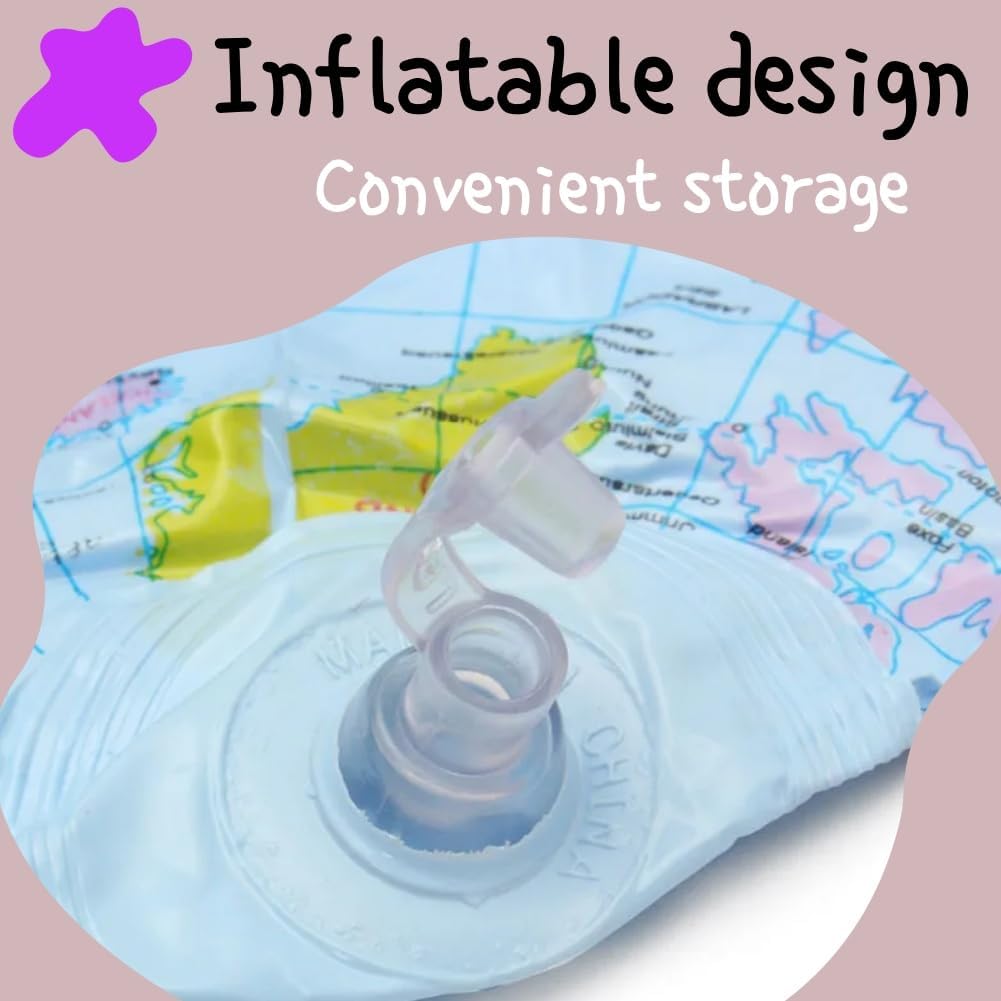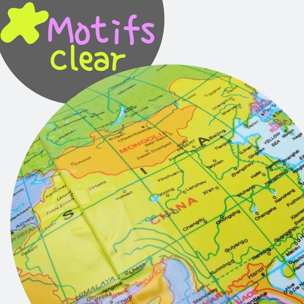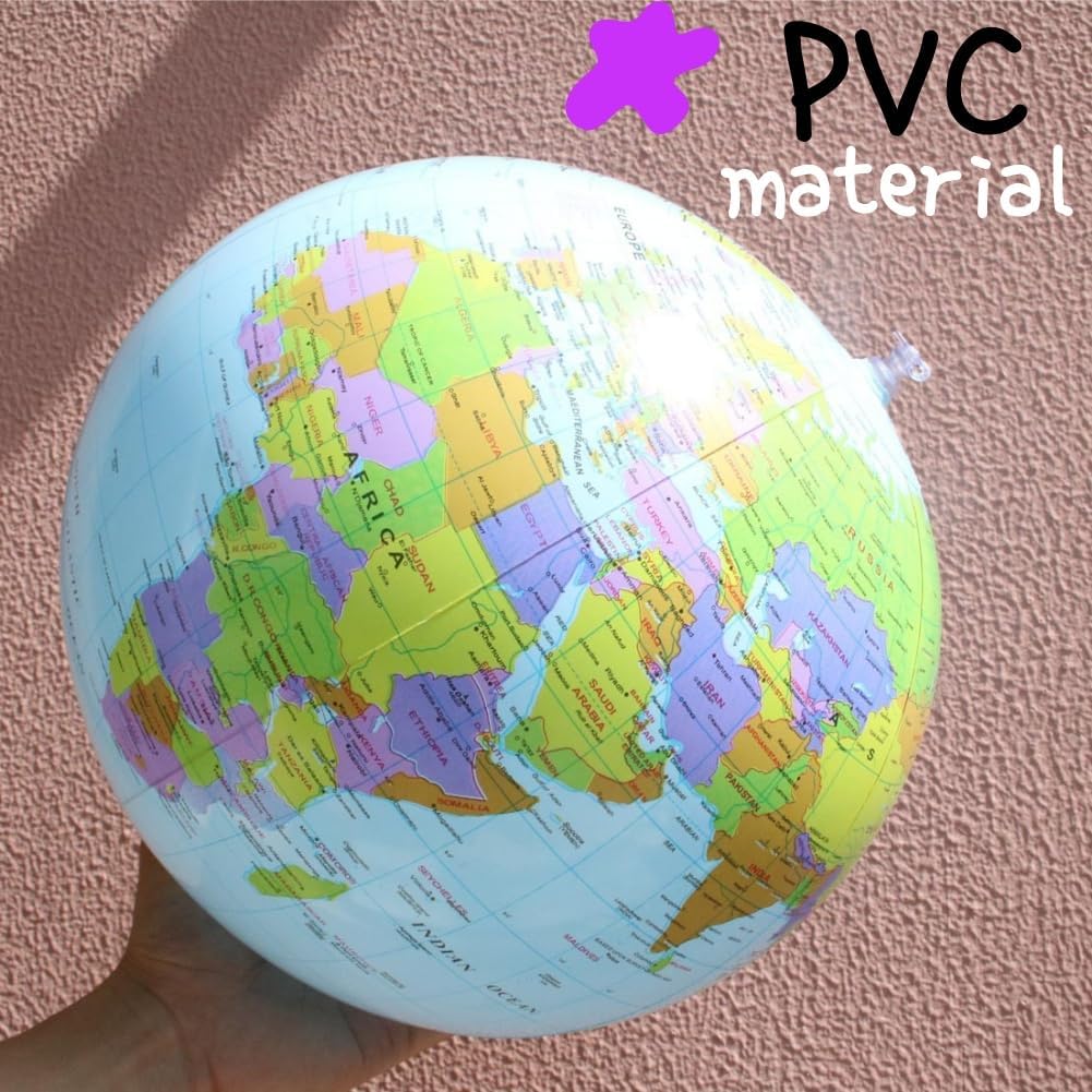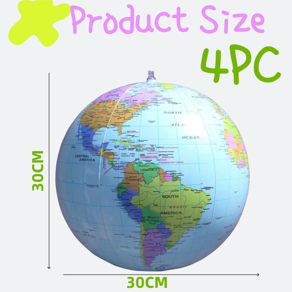 Confezione del prodotto: il prodotto contiene 4 globi gonfiabili. DIMENSIONE: circa 16 pollici/38 cm quando non gonfiato, 12 pollici/28 cm quando gonfiato. MATERIALE DUREVOLE: Realizzato in PVC di alta qualità, resistente ed elastico, molto resistente e non facile da strappare. ETICHETTATURA CHIARA: design innovativo e colorato, diversi paesi e città hanno colori diversi, facili da distinguere. UTILIZZO: Può essere utilizzato per lezioni di geografia, studio o come pallone da spiaggia, giochi gonfiabili da piscina.
