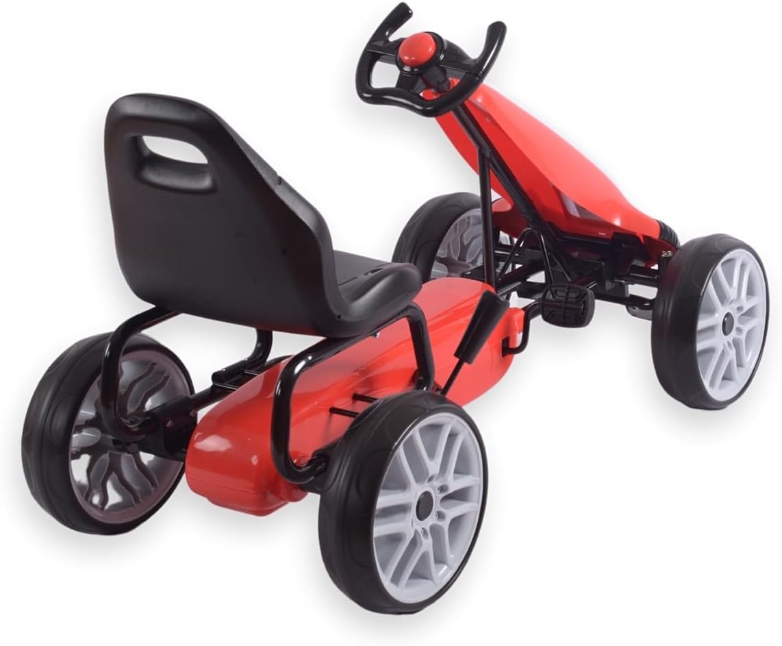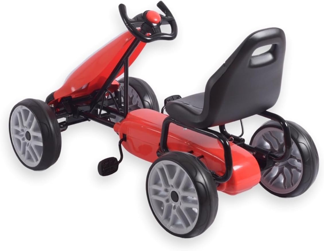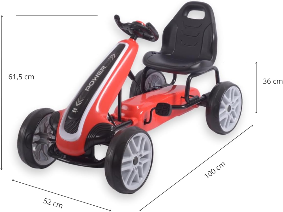 Descrizione prodotto Power Pedal Go-Kart Il Power Go Kart è un veicolo solido ed elegante progettato per i bambini e offre emozionanti viaggi all'aperto. Grazie al suo aspetto realistico e alla struttura robusta, questo go-kart offre un grande divertimento e allo stesso tempo supporta lo sviluppo delle capacità motorie e della forma fisica. Il veicolo è realizzato con una struttura in metallo leggero e plastica di alta qualità, che garantisce una lunga durata e resistenza ai danni. È dotato di una trasmissione a catena chiusa con pedali e ruote grandi e resistenti con pneumatici in schiuma (EVA) che offrono una buona presa e comfort di guida su diverse superfici. Il volante sportivo ergonomico consente una presa sicura e un facile controllo, mentre il sedile sagomato garantisce una guida confortevole. È inoltre dotato di un freno a mano. Il Power Pedal Go Kart è un ottimo giocattolo che offre ai bambini un tempo di gioco attivo all'aria aperta, sostenendo allo stesso tempo il loro sviluppo fisico e la coordinazione. È un ottimo modo per imparare attraverso il gioco, offrendo ai bambini piacere di guida e un senso di indipendenza. Il veicolo è facile da montare, stabile e sicuro. È raccomandato per bambini dai 3 anni. Caratteristiche: sedile ergonomico con 2 livelli di regolazione della distanza dal volante. Struttura robusta freno a mano. Azionamento: marcia in avanti Funzione della cosiddetta "ruota libera" catena completamente coperta. Grandi ruote in schiuma e cuscinetti a sfera (EVA). Pneumatici profilati con impugnatura sullo schienale facilita il trasporto del volante sportivo, copertura in plastica del piantone dello sterzo, fascia di età 3+ carico massimo 30 kg. norme di sicurezza europee Disponibile in 3 colori (rosso, rosa, blu) 1 anno di garanzia. Dati tecnici: altezza totale: 61,5 cm, larghezza totale: 52 cm, lunghezza totale: 100 cm, altezza seduta: 36 cm, larghezza seduta: 33 cm, profondità seduta: 21 cm, larghezza schienale: 33 cm, altezza schienale: 26 cm, larghezza volante: 21 cm, altezza del manubrio: 16 cm, altezza dal pavimento al bordo inferiore del volante: 49 cm. Posizione 1: Distanza dal Bordo del sedile del pedale (distanza massima): 36 cm. Posizione 2: distanza dal bordo del sedile al pedale (distanza massima): 40 cm. Distanza dallo schienale ai bracci del volante Posizione 1: 46 cm, posizione 2: 49 cm, interasse: 75 cm, diametro ruota: 26 cm, larghezza pneumatici: 7,5 cm, dimensioni pedali: 6 x 7,5 cm, spessore pedale: 2 cm libertà: 8.5 Dimensioni confezione: lunghezza: 87 cm, larghezza: 49 cm, altezza: 26 cm, peso netto: 8,8 kg, peso lordo: 10,3 kg Avviso di sicurezza Nessuna avvertenza applicabile