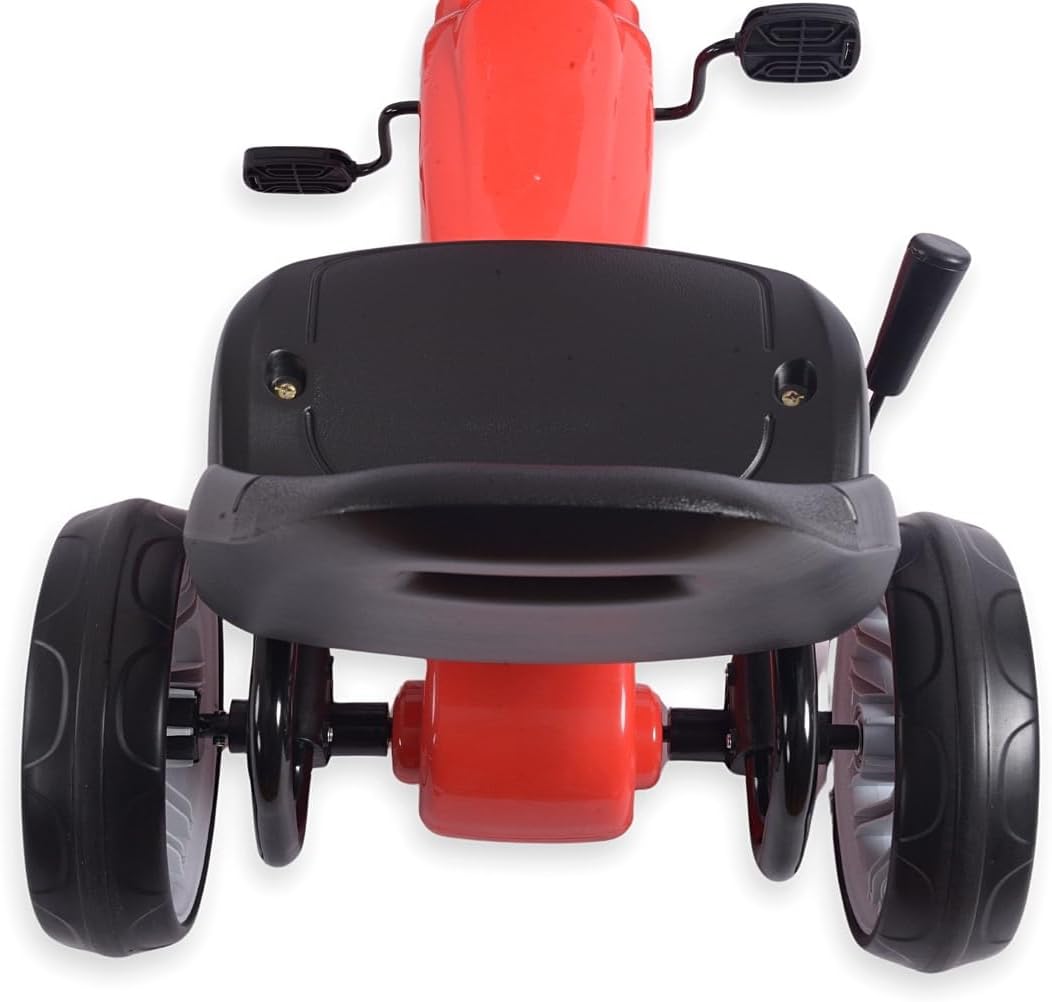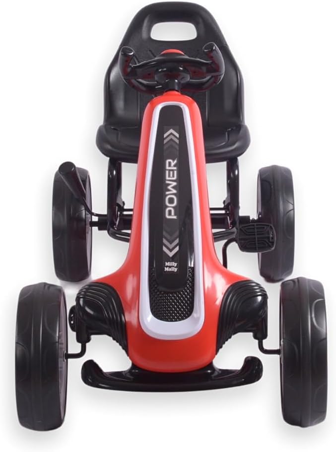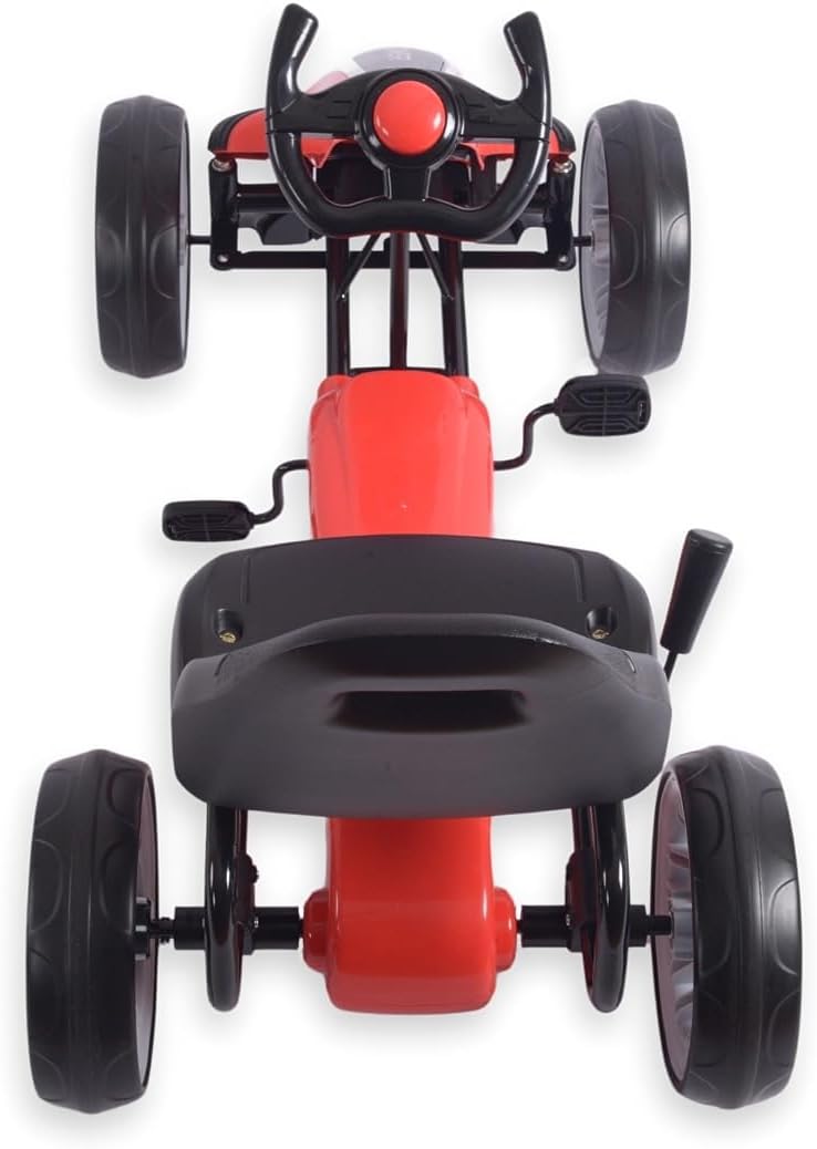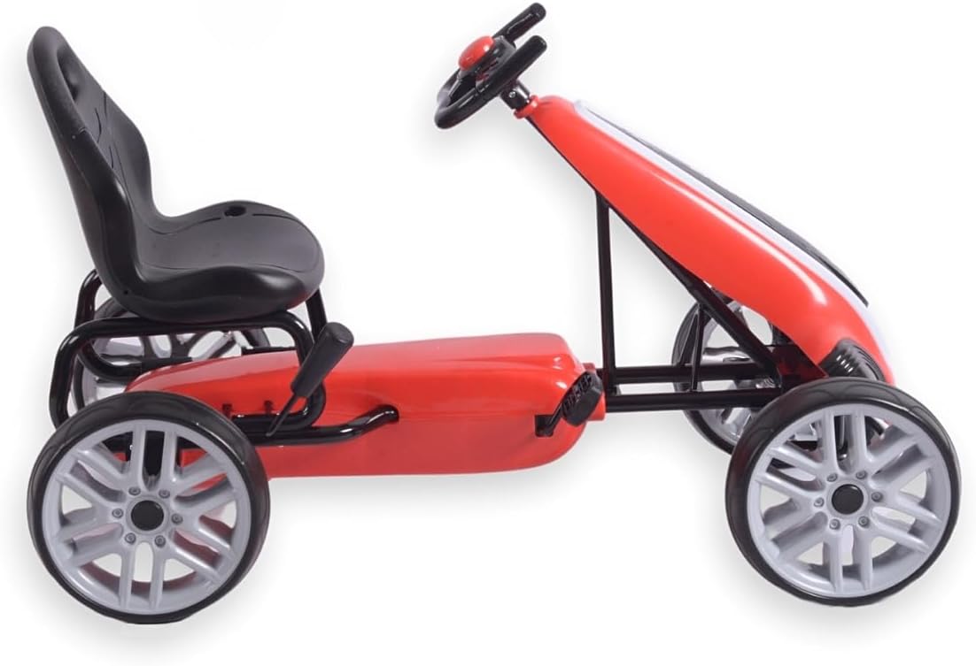 Descrizione prodotto Power Pedal Go-Kart Il Power Go Kart è un veicolo solido ed elegante progettato per i bambini e offre emozionanti viaggi all'aperto. Grazie al suo aspetto realistico e alla struttura robusta, questo go-kart offre un grande divertimento e allo stesso tempo supporta lo sviluppo delle capacità motorie e della forma fisica. Il veicolo è realizzato con una struttura in metallo leggero e plastica di alta qualità, che garantisce una lunga durata e resistenza ai danni. È dotato di una trasmissione a catena chiusa con pedali e ruote grandi e resistenti con pneumatici in schiuma (EVA) che offrono una buona presa e comfort di guida su diverse superfici. Il volante sportivo ergonomico consente una presa sicura e un facile controllo, mentre il sedile sagomato garantisce una guida confortevole. È inoltre dotato di un freno a mano. Il Power Pedal Go Kart è un ottimo giocattolo che offre ai bambini un tempo di gioco attivo all'aria aperta, sostenendo allo stesso tempo il loro sviluppo fisico e la coordinazione. È un ottimo modo per imparare attraverso il gioco, offrendo ai bambini piacere di guida e un senso di indipendenza. Il veicolo è facile da montare, stabile e sicuro. È raccomandato per bambini dai 3 anni. Caratteristiche: sedile ergonomico con 2 livelli di regolazione della distanza dal volante. Struttura robusta freno a mano. Azionamento: marcia in avanti Funzione della cosiddetta "ruota libera" catena completamente coperta. Grandi ruote in schiuma e cuscinetti a sfera (EVA). Pneumatici profilati con impugnatura sullo schienale facilita il trasporto del volante sportivo, copertura in plastica del piantone dello sterzo, fascia di età 3+ carico massimo 30 kg. norme di sicurezza europee Disponibile in 3 colori (rosso, rosa, blu) 1 anno di garanzia. Dati tecnici: altezza totale: 61,5 cm, larghezza totale: 52 cm, lunghezza totale: 100 cm, altezza seduta: 36 cm, larghezza seduta: 33 cm, profondità seduta: 21 cm, larghezza schienale: 33 cm, altezza schienale: 26 cm, larghezza volante: 21 cm, altezza del manubrio: 16 cm, altezza dal pavimento al bordo inferiore del volante: 49 cm. Posizione 1: Distanza dal Bordo del sedile del pedale (distanza massima): 36 cm. Posizione 2: distanza dal bordo del sedile al pedale (distanza massima): 40 cm. Distanza dallo schienale ai bracci del volante Posizione 1: 46 cm, posizione 2: 49 cm, interasse: 75 cm, diametro ruota: 26 cm, larghezza pneumatici: 7,5 cm, dimensioni pedali: 6 x 7,5 cm, spessore pedale: 2 cm libertà: 8.5 Dimensioni confezione: lunghezza: 87 cm, larghezza: 49 cm, altezza: 26 cm, peso netto: 8,8 kg, peso lordo: 10,3 kg Avviso di sicurezza Nessuna avvertenza applicabile