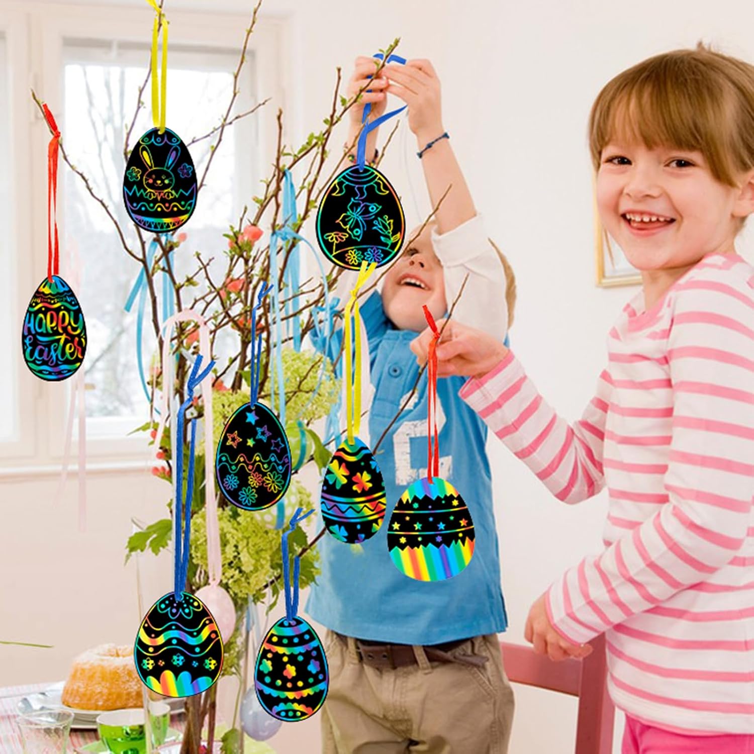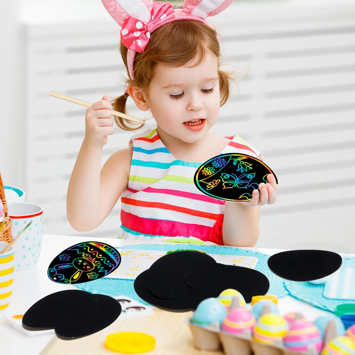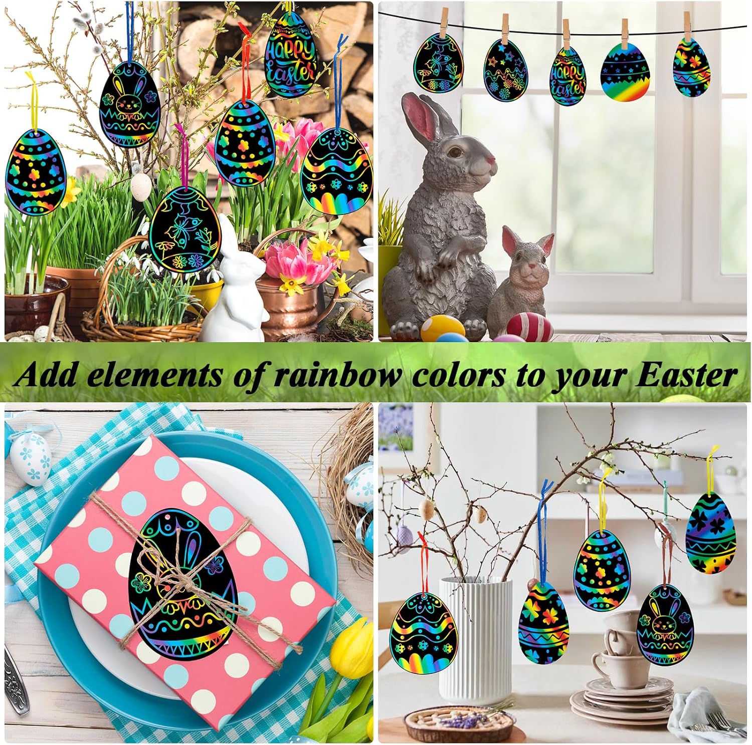 Pacchetto incluso: Il pacchetto viene fornito con 36 pezzi di carta per graffiare le uova di Pasqua in 3 forme diverse, abbinati a 36 pezzi di nastri e 12 pezzi di bastoncini di legno. Materiali da disegno sicuri: Queste carte da disegno pasquali utilizzano un cartoncino spesso atossico con un rivestimento nero sulla superficie. Il bastoncino per graffiare è fatto di legno, sicuro, ecologico, durevole e non facile da sbiadire e deformare. Nessun odore particolare, polvere atossica, i bambini possono realizzare in tutta sicurezza colorati cartelli di carta pasquale. Facile da usare: Basta scegliere il disegno da grattare che più vi piace, usare la vostra immaginazione e poi grattare delicatamente il disegno con un bastoncino di legno per rivelare gli splendidi colori dell'arcobaleno sottostanti! Ogni pezzo di carta da grattare è dotato di fori preforati, che possono essere appesi con nastri ovunque si voglia decorare la Pasqua. Stimola la creatività del bambino: Usare una penna di legno per raschiare il manto nero e rivelare il bellissimo arcobaleno sottostante. Creare vari modelli può esercitare le abilità di pittura dei bambini e stimolare la creatività e l'immaginazione dei bambini, che è perfetto per i bambini a fare progetti artigianali fai da te. Perfetta idea regalo per Pasqua: Questo gratta e vinci arcobaleno è adatto come regalo di festa per bambini e bambine dai 3 anni in su. Questi gratta e vinci possono essere applicati in molte occasioni significative come la festa di Pasqua, il progetto di artigianato, l'attività del campo d'arte, o il giorno di divertimento in famiglia, fare alcuni dipinti diversi come regalo per i tuoi amici, compagni di classe, insegnanti.