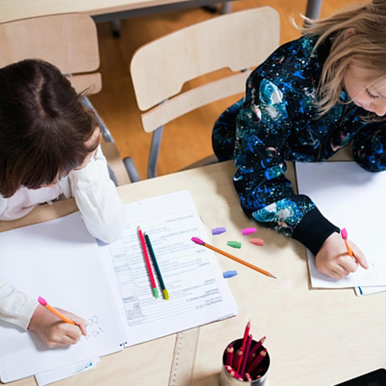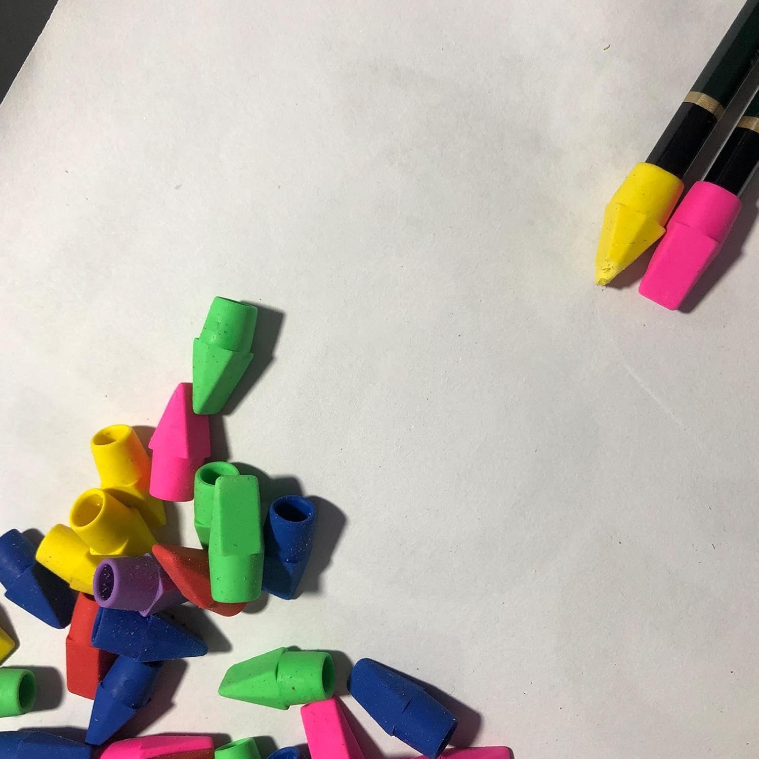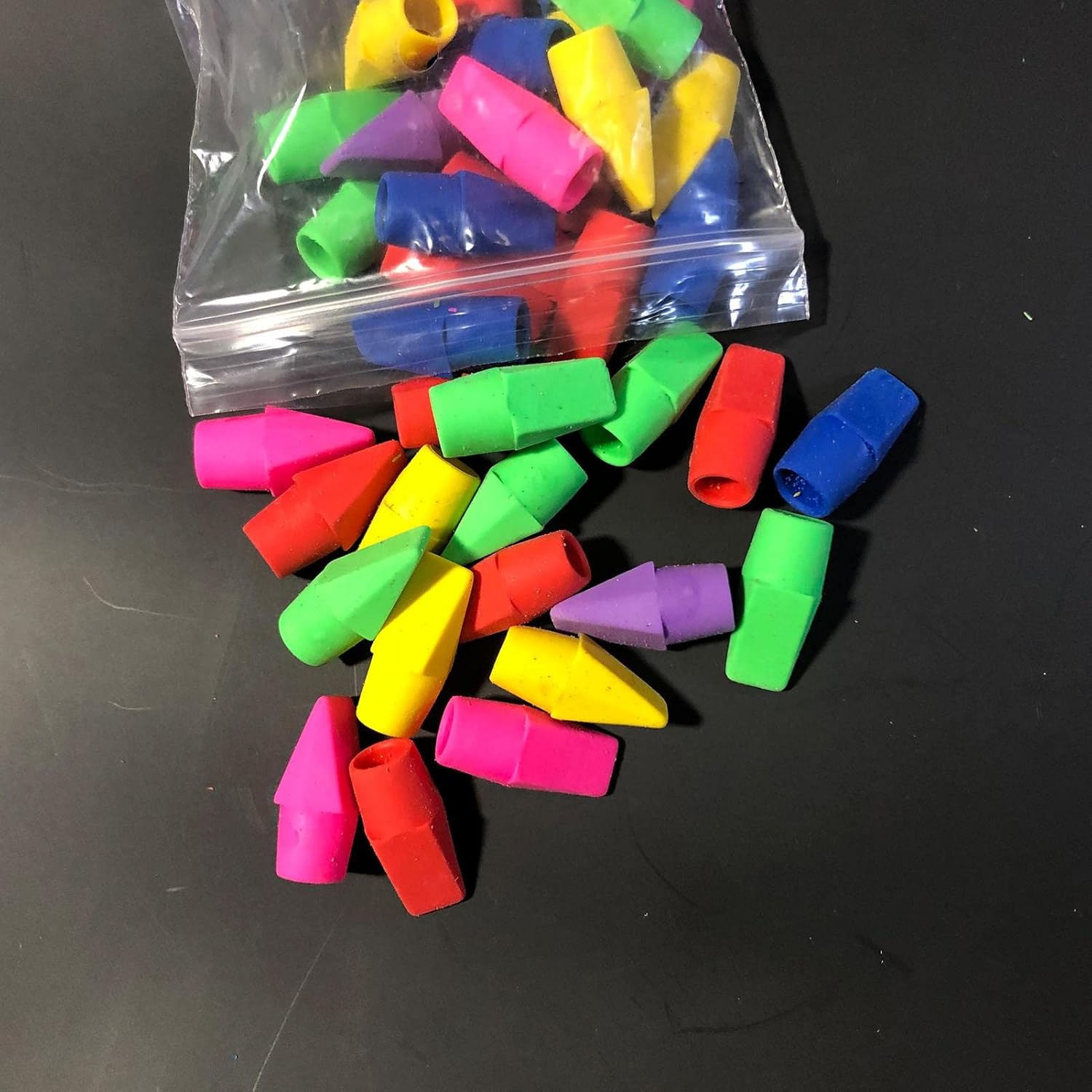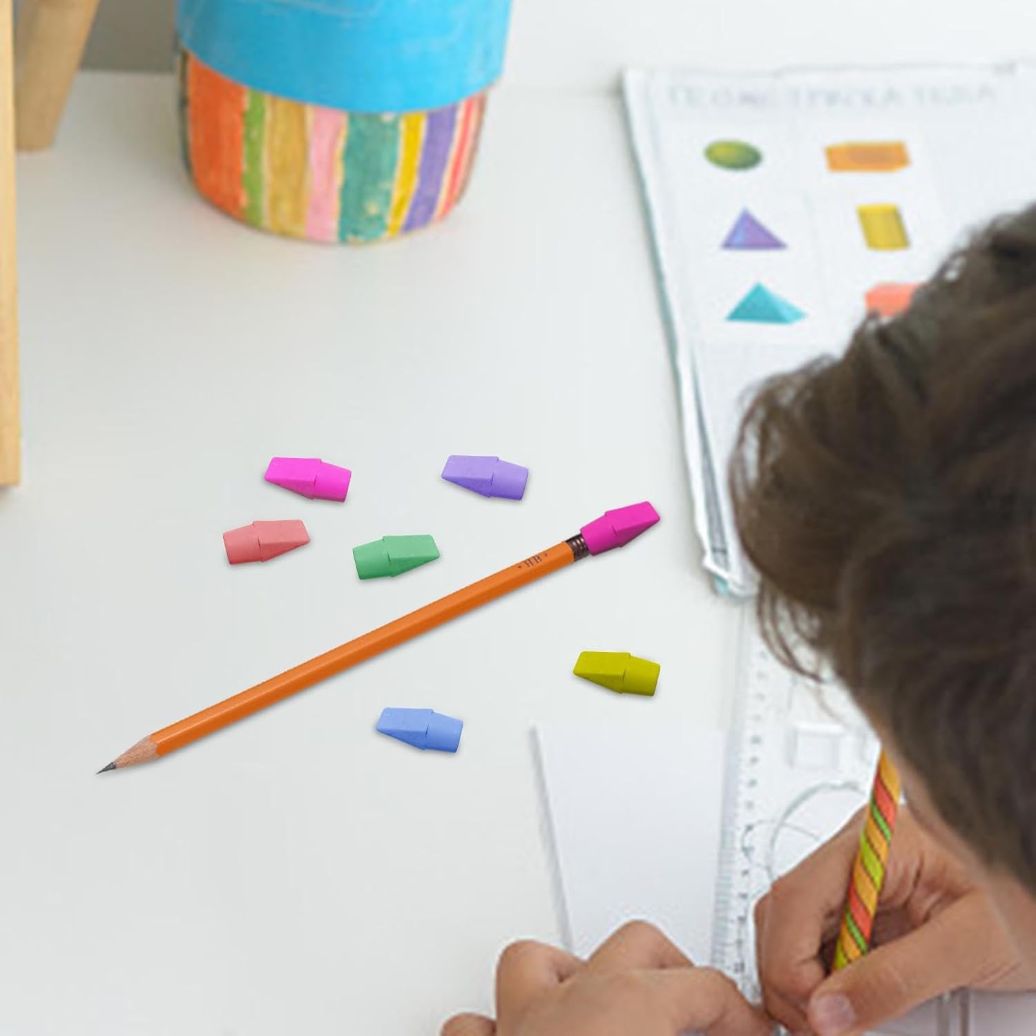 Materiali di alta qualità: realizzate in gomma senza lattice e PVC, le gomme da cancellare sono davvero adatte a qualsiasi matita standard e molto sicure per l'uso. Tipiche gomme a forma di cuneo: progettate con bordi e superfici piatte, le gomme per matita sono ideali per mantenere le pagine fresche e pulite e possono rimuovere facilmente i segni della matita. Semplici da usare: i topper per matite sono adatti per correggere documenti d'ufficio e compiti, ideali per rimuovere segni di matita senza graffiare o strappare la carta, e buone scelte per il materiale scolastico. Multifunzione: può essere fissato sulla parte superiore delle matite standard, le gomme per matite non sono facili da perdere, proteggendo la mina da danni e la scatola delle matite da essere contaminata dalle matite. Regali pratici per bambini: circa 1 cm di profondità interna per fissare saldamente, le gomme per bambini sono caratterizzate da colori ricchi e sono facili da abbinare alla maggior parte degli articoli di cancelleria, dando alla matita un aspetto colorato.
