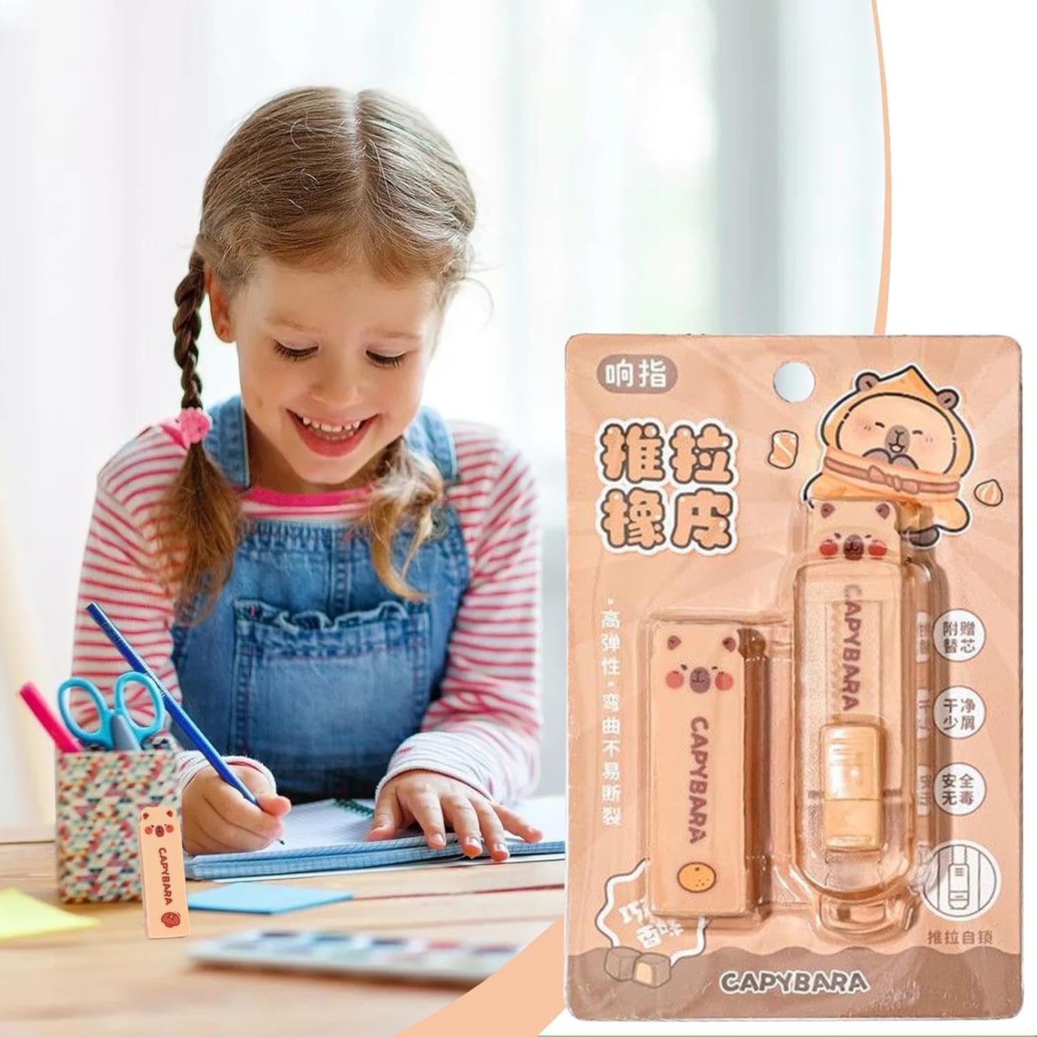 Accessorio Elegante:Gomma retrattile come articolo da scrivania da regalo che comunica cura e premura. Soluzione pratica ma carina per studenti e professionisti, combina funzionalità e valore affettivo per occasioni speciali Funzionamento Fluido: push-pull regola facilmente la gomma retrattile per correzioni intuitive, eliminando la fastidiosa rimozione ripetuta e garantendo un'esperienza d'uso per tutti gli utenti con movimenti precisi e controllati Strumento Polivalente: Cancellino retrattile per matite, appunti di scuola e perfezionamento schizzi, elevata usabilità in molteplici contesti quotidiani con prestazioni affidabili Cancelleria Divertente: Mostrando un motivo di capibara cartoon, questa gomma retrattile unisce l'appeal da collezione a caratteristiche pratiche, assicurando un'esperienza piacevole in ogni situazione d'uso Portatile e Compatta: Gomma retrattile leggera per cancellatura immediata, assicura archiviazione facile e praticità da portare ovunque, ideale per uso esterno senza volume aggiuntivo grazie al design minimale