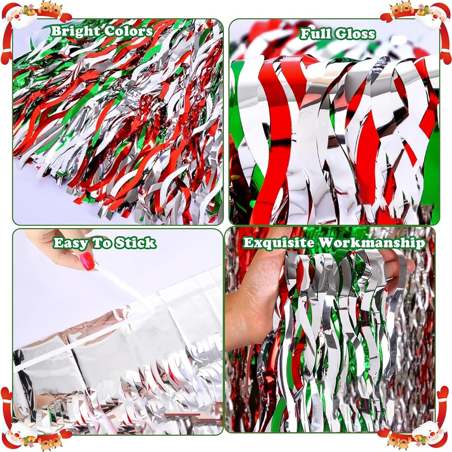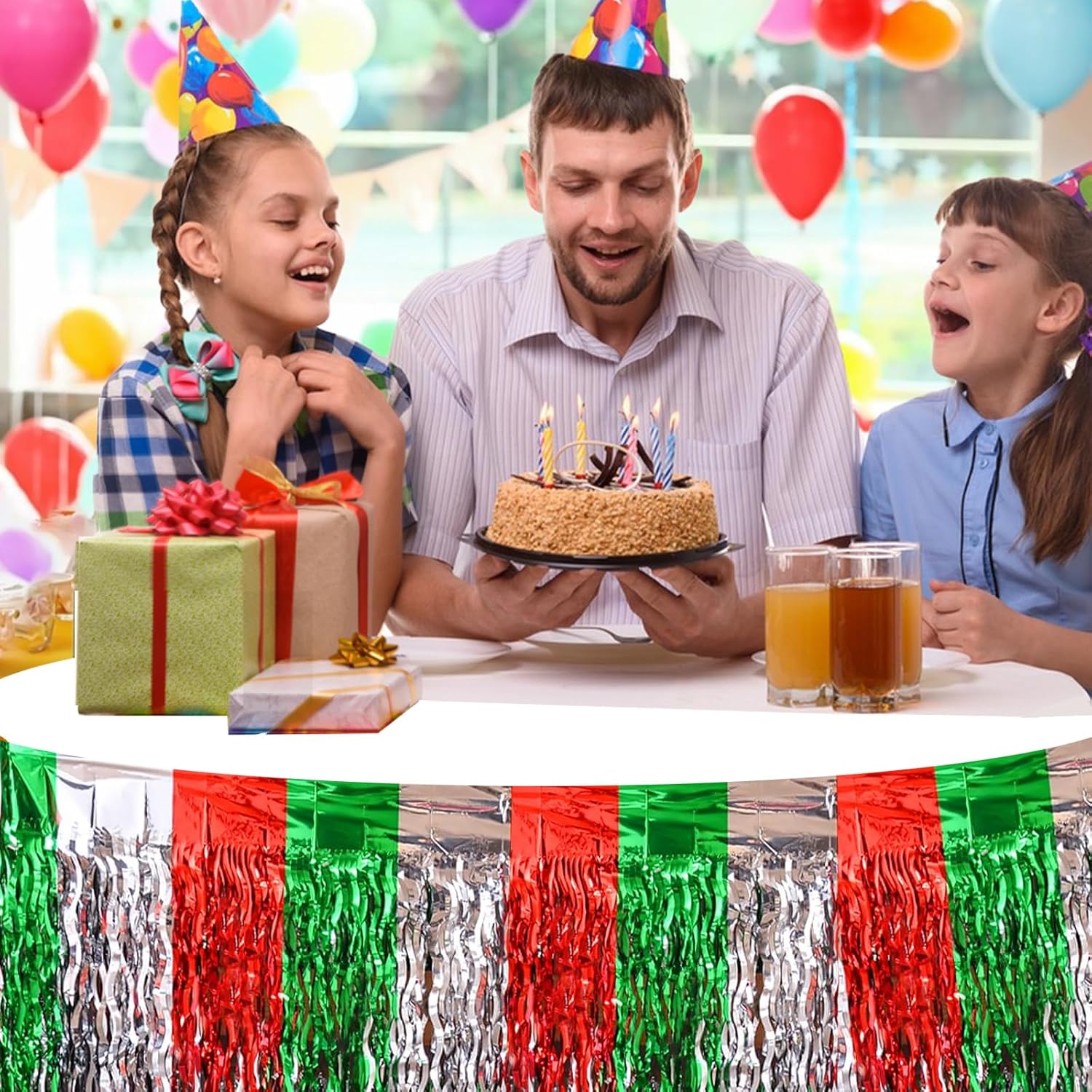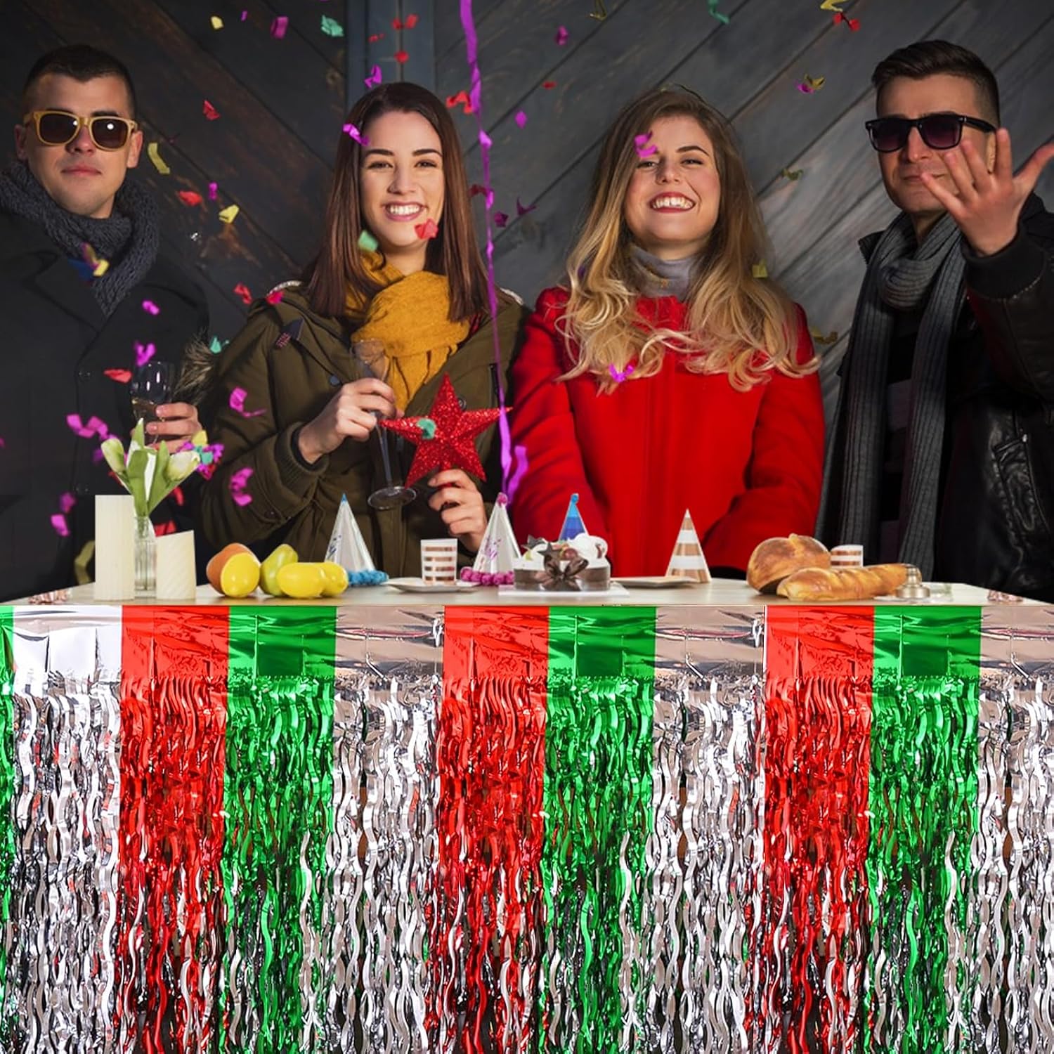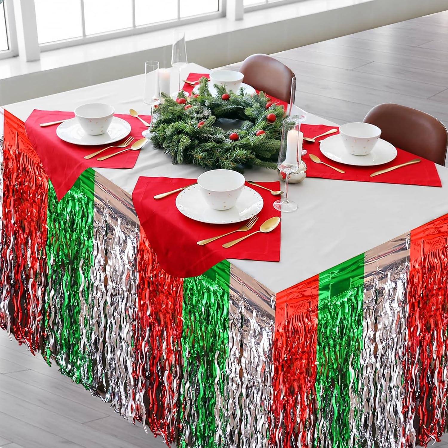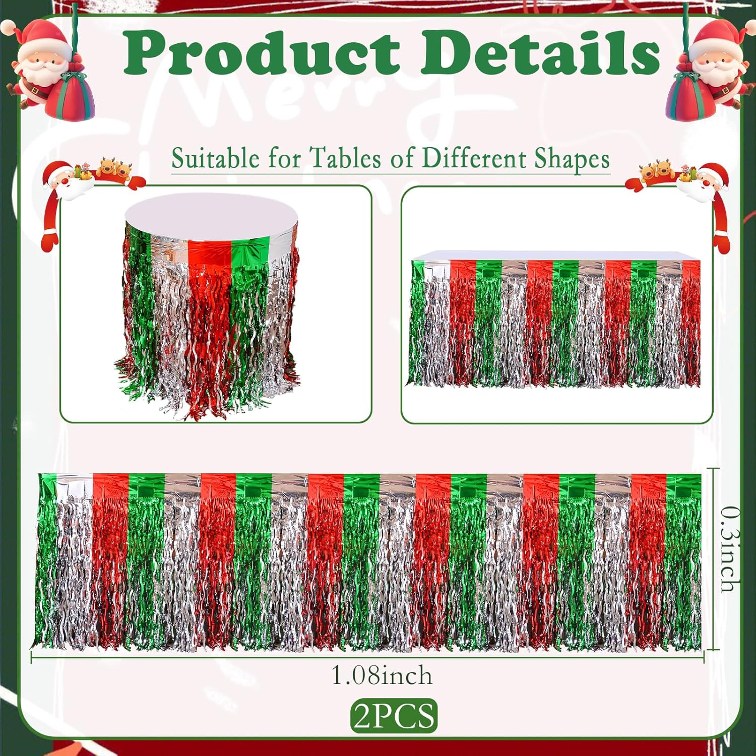 【Decorazioni per feste di Natale】Contiene: 2 gonne da tavolo con frange. Rosso, argento e verde si intrecciano e scorrono con la luce, presentando un affascinante effetto visivo e illuminando istantaneamente l'atmosfera della festa. 【Alta qualità】 La gonna da tavolo natalizia è realizzata in materiale PET di alta qualità, con colori brillanti e lucentezza, forte autoadesione, stabile e non facile da staccare, mantenendo un buon effetto decorativo durante la festa. 【Misura Universale】Ogni gonna da tavolo di compleanno misura circa 29 x 108 pollici, adatta per tavoli con forme rotonde, rettangolari, quadrate e di altro tipo, in grado di coprire facilmente il bordo del tavolo. 【Facile da installare】 La nostra gonna da tavolo natalizia è dotata di nastro adesivo, basta staccarlo per completare rapidamente l'attività di decorazione. Soddisfa le tue esigenze di decorazione natalizia e aggiungi vivaci colori natalizi. 【Ampia applicazione】 La gonna da tavolo decorativa natalizia può essere utilizzata come sfondo, carta da parati, supporto fotografico ed è un'aggiunta perfetta a vari festival. Perfetto per Natale, compleanni, matrimoni, feste in giardino, Capodanno, feste rave e altro ancora.
