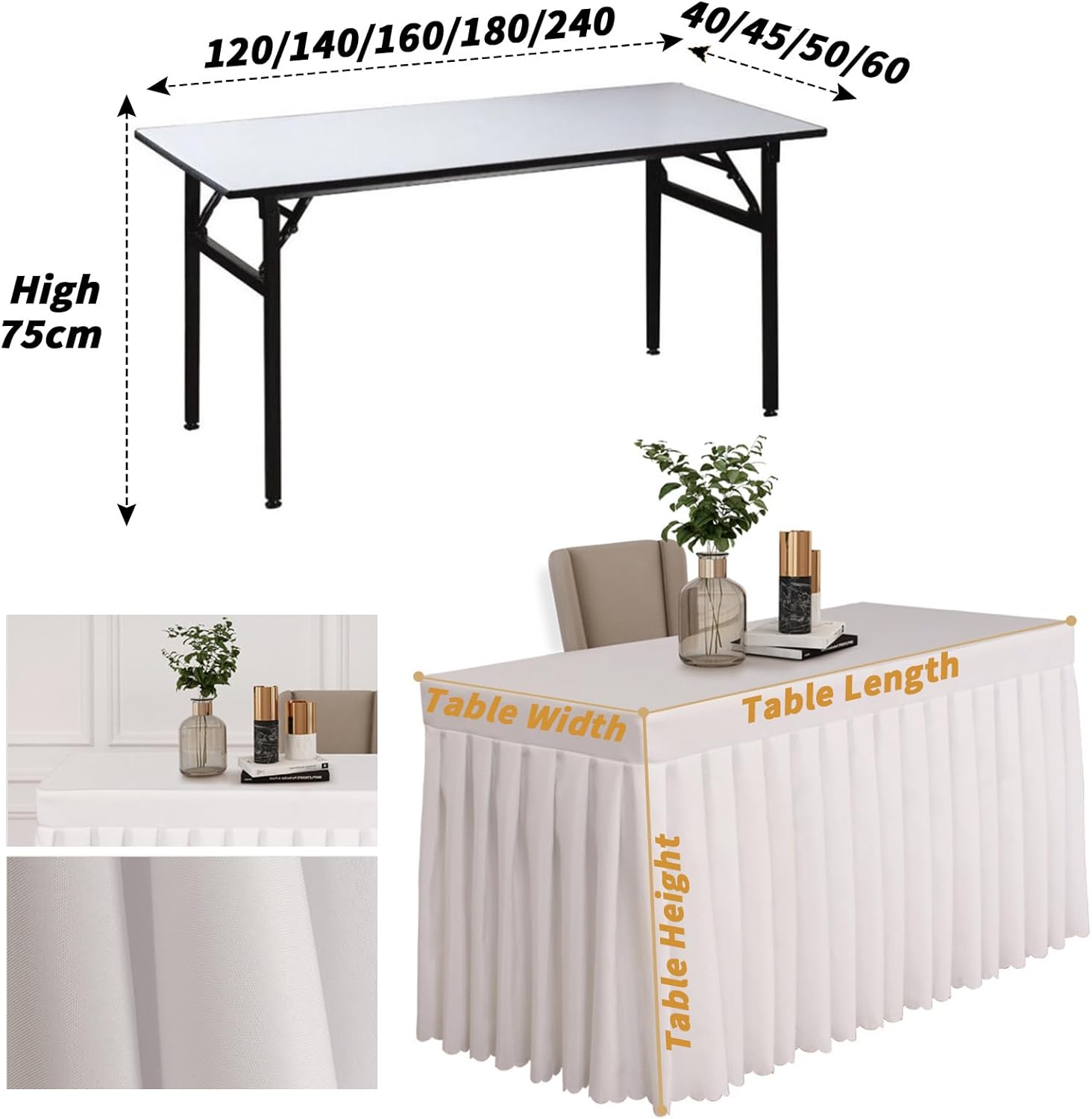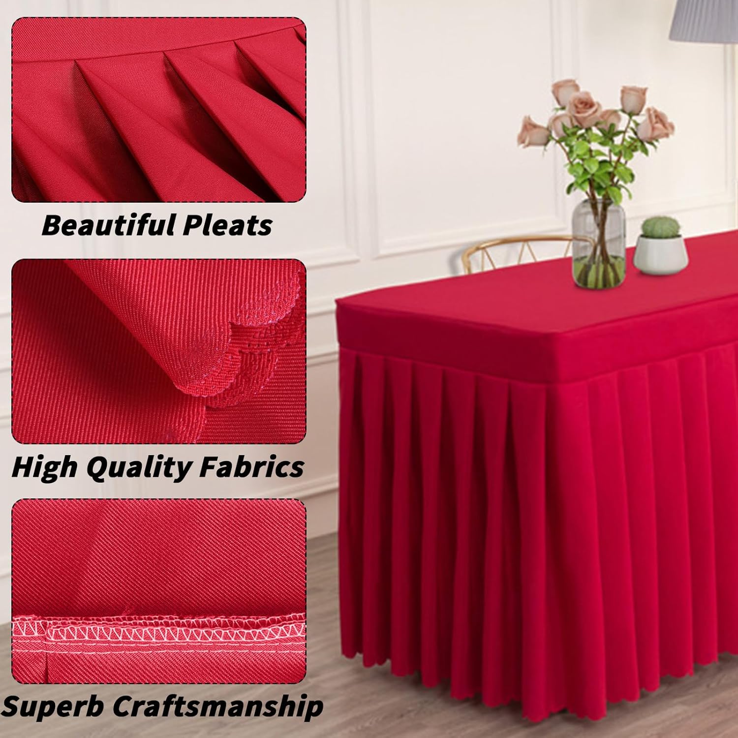 Tovaglia materiale: gonna da tavolo per banchetti in poliestere 100% di alta qualità, realizzata in materiale liscio ed elastico senza rughe, durevole, riutilizzabile e leggera. Tovaglia dal design della gonna: la tovaglia in spandex con gonna a onde rispetto alle tovaglie tradizionali è elegante e unica, rende i tuoi eventi accattivanti. Spessa e durevole: si adatta sia a tavoli rettangolari che a buffet, bar, ecc. Combinalo con una tovaglia in tinta unita per creare un look elegante e professionale! Eventi pesanti, fiere, decorazioni per fiere, ideali per hotel e ristoranti! Occasione: tovaglia perfetta per feste di compleanno, decorazioni per baby shower per ragazze, ricevimenti di nozze, buffet, decorazioni per la tavola dei dolci per banchetti, venditori, decorazioni per la tavola delle fiere. Le tovaglie plissettate in poliestere sono più flessibili e versatili rispetto alle tovaglie tradizionali. Facile manutenzione: devi indossare la gonna da tavolo solo poche ore prima dell'inizio della festa. Supporto per tovaglia per feste da lavare a mano o in lavatrice, appendere ad asciugare e continuare a utilizzarlo per l'evento successivo.