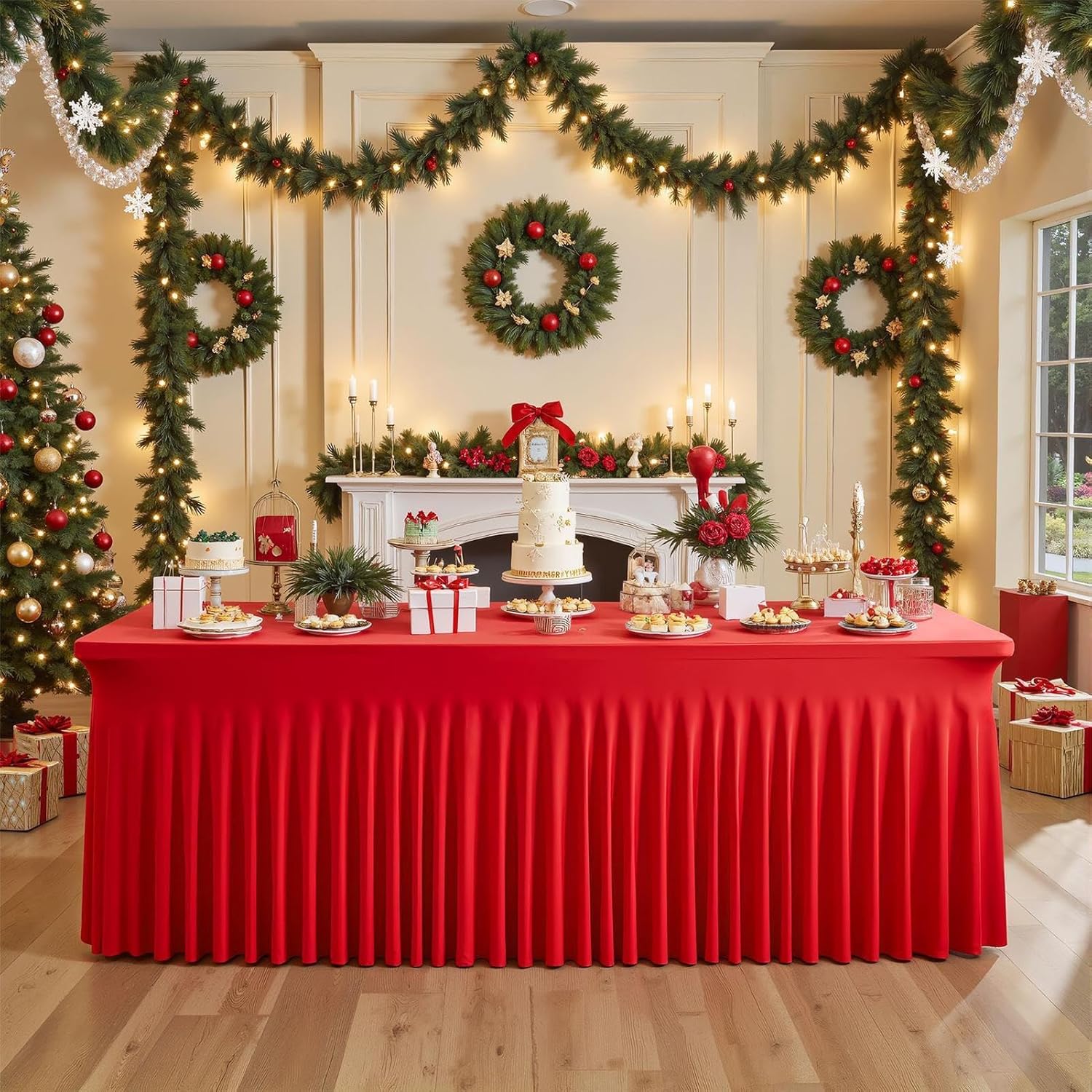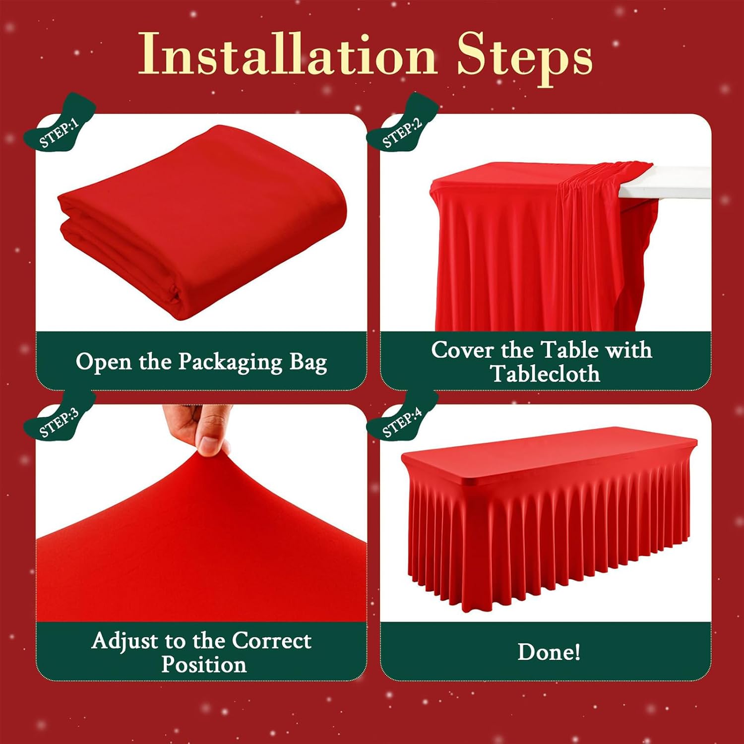 Utilizzo flessibile: con la sua forma adattabile, il grembiule per razioni è adatto a diverse forme di tavoli e temi di eventi come feste, vacanze o riunioni formali. La versatile soluzione decorativa crea momenti indimenticabili ad ogni incontro attraverso un party design armoniosamente coordinato. Decorazione senza cuciture: con un design integrato, la tovaglia per feste offre una copertura completa per mantenere le superfici libere da ingombri e garantire una presentazione elegante per matrimoni o feste di vacanza Installazione senza problemi: la funzione distesa garantisce un assemblaggio senza attrezzi senza graffette, forma graziose volant a cascata per un immediato miglioramento della scrivania in ambienti di lavoro individuali o collaborativi con raffinatezza visiva Tessuto morbido e confortevole: è realizzato in poliestere robusto ma morbido che offre comfort e garantisce durata per un uso frequente. Grazie alla sua qualità riutilizzabile, è ideale per decorare con stile feste, riunioni o occasioni festive e creare ogni volta un'atmosfera elegante. Riutilizzabile ed elegante: la gonna da tavolo natalizia plissettata è progettata per molteplici usi, estremamente facile da pulire e combina praticità funzionale con un design chic per lasciare un'impressione duratura in vari eventi festivi