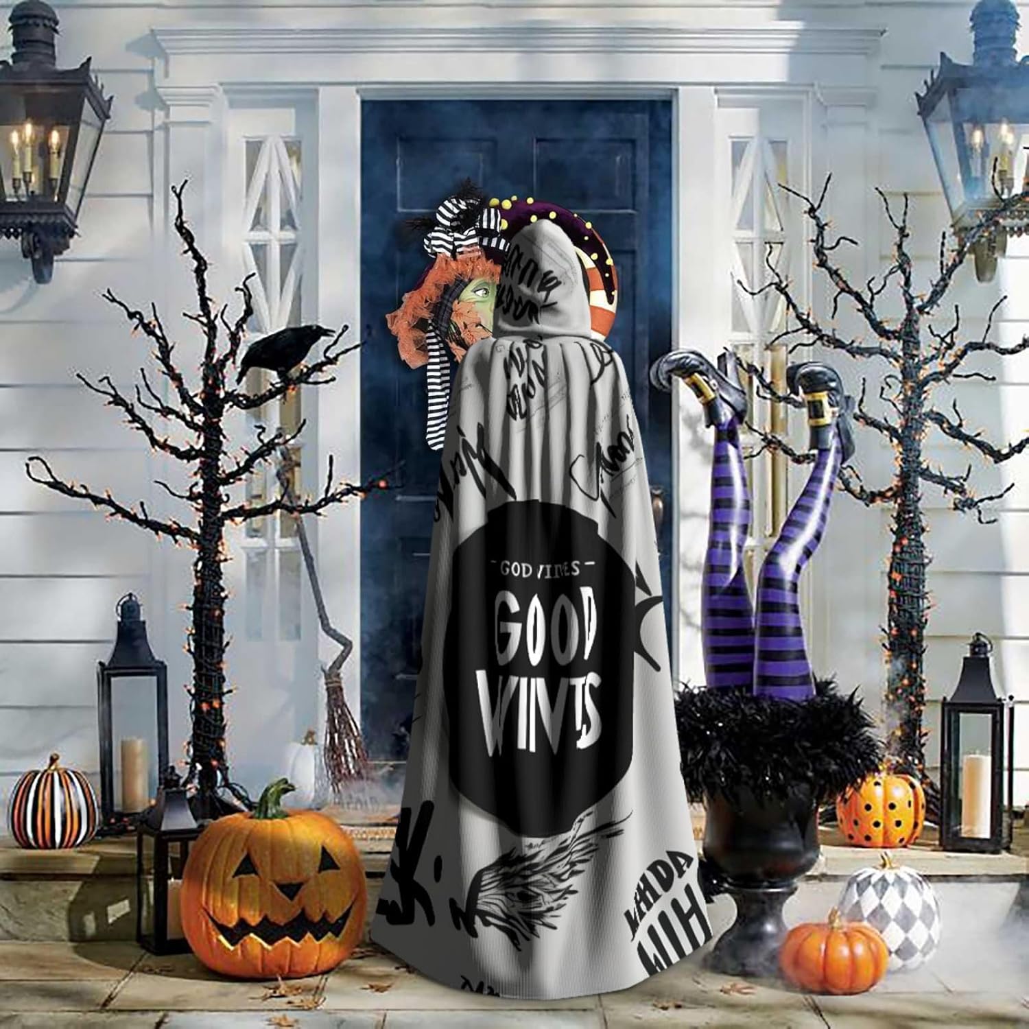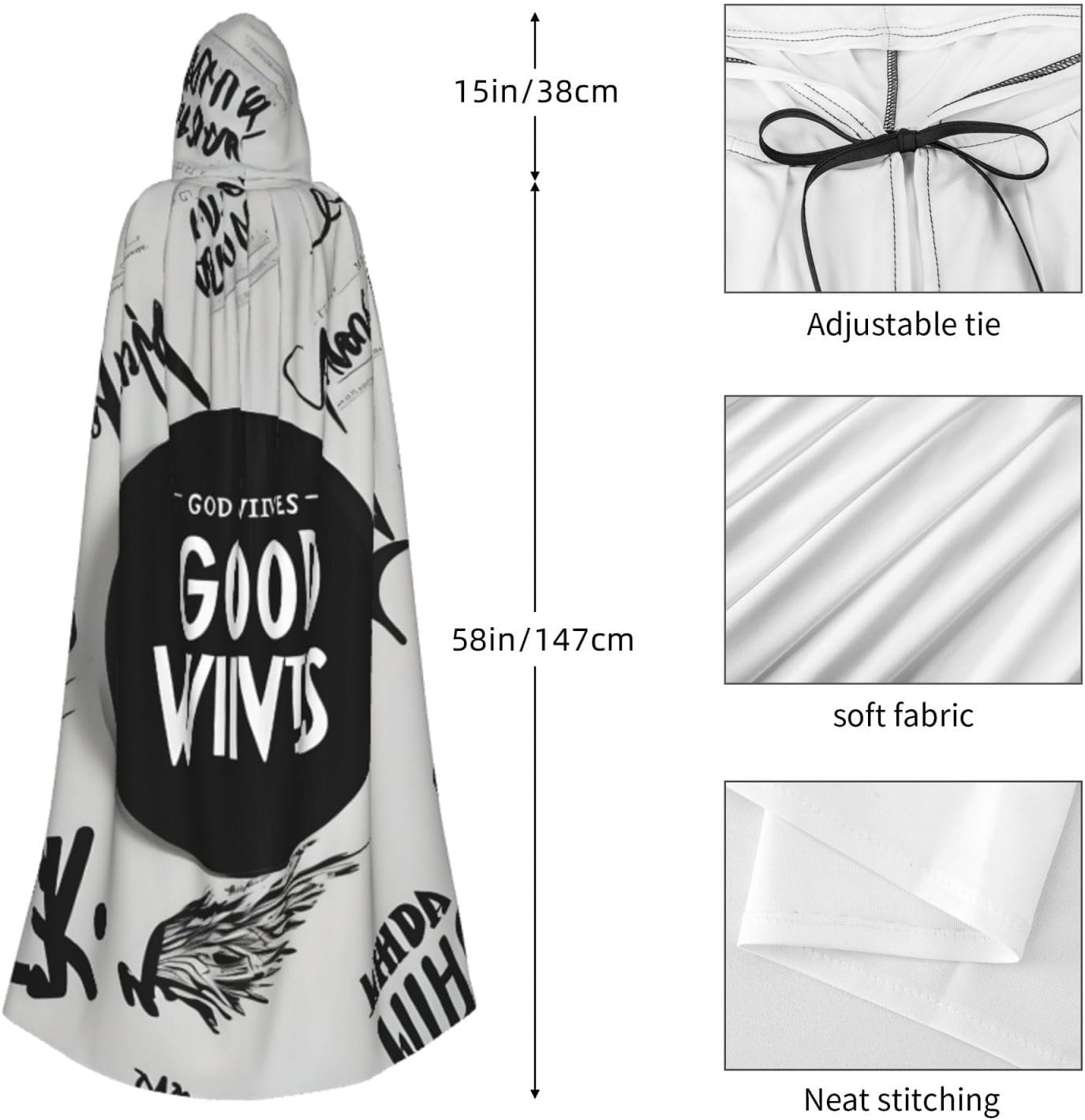 Ruba lo spettacolo a qualsiasi evento di Halloween o a tema con il nostro mantello con cappuccio. Realizzato con un tessuto confortevole, non pruriginoso, questo mantello con stampa Good Vibes Only è progettato per assicurarti di distinguerti tra la folla. Il mantello è facile da indossare e togliere, grazie alla cravatta e all'assenza di una cerniera. Con un design facile da pulire, può essere lavato in lavatrice o a mano per garantire che sia sempre pronto per il tuo prossimo evento. Prova la perfetta miscela di comfort, stile e versatilità con il nostro mantello con cappuccio.
