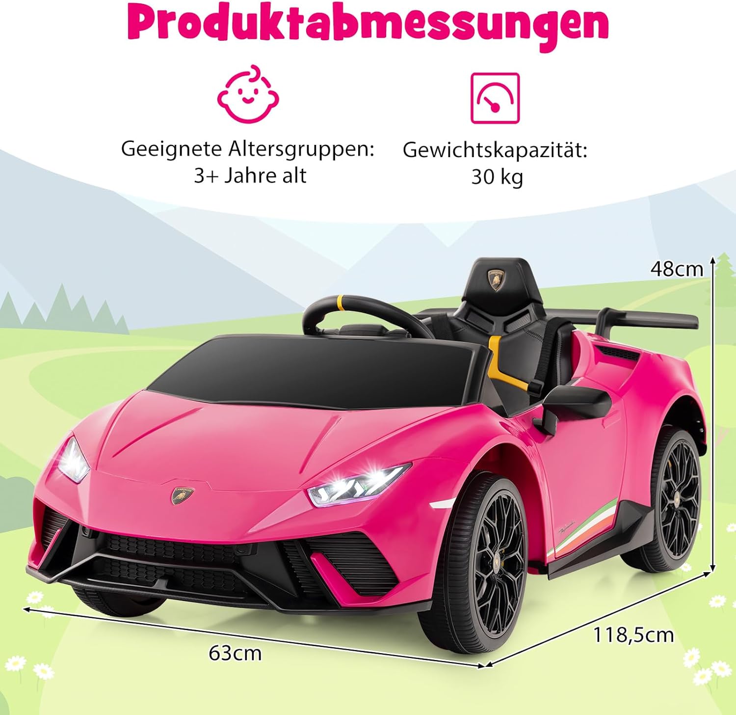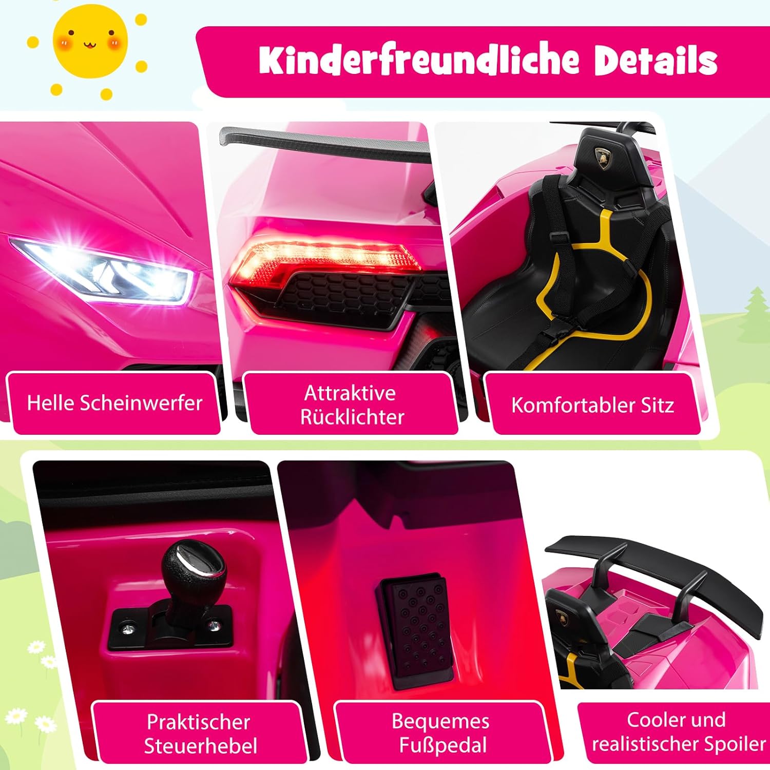 🚗Caratteristiche entusiasmanti: con potenti doppi motori da 12 V e suoni simulati del motore, la nostra Lamborghini con licenza garantisce un vero piacere di guida per i tuoi piccoli. Il pannello interattivo prende vita con la musica e una porta USB, così i tuoi bambini potranno godersi le loro canzoni preferite mentre sono in movimento. 🚗Gioia per tutti: il veicolo per bambini offre 2 modalità di controllo e 3 velocità, ideali per principianti e conducenti esperti. I bambini possono controllarsi da soli utilizzando la leva e i pedali, mentre i genitori, se necessario, possono intervenire tramite il telecomando. 🚗La sicurezza prima di tutto: la sicurezza è prioritaria grazie alla funzione di avviamento morbido della nostra auto sportiva, che consente un avviamento più controllato. Le ruote posteriori sono dotate di molle per una guida più fluida e la cintura di sicurezza a 3 punti regolabile mantiene il bambino saldamente in posizione durante la guida. 🚗Maggiore comfort: con pratica maniglia e ruote di trasporto, il veicolo è ideale per i viaggi in famiglia. La potente batteria da 12 V 4,5 Ah garantisce sessioni di gioco più lunghe e l'indicatore di alimentazione ti ricorda di caricare la batteria in tempo. 🚗Regalo perfetto: i colori fantastici, i dettagli realistici delle auto sportive e le luci a LED luminose rendono questo veicolo un regalo attraente. Delizia i bambini dai 3 anni in su ed è un regalo indimenticabile per i compleanni o per Natale che favorisce il divertimento e lo sviluppo motorio.