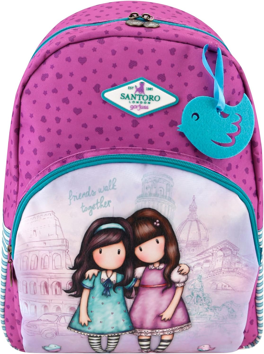 Features Friends Walk Together design on front of the bag One main compartment One small front pocket Adjustable shoulder straps Felt bag charm