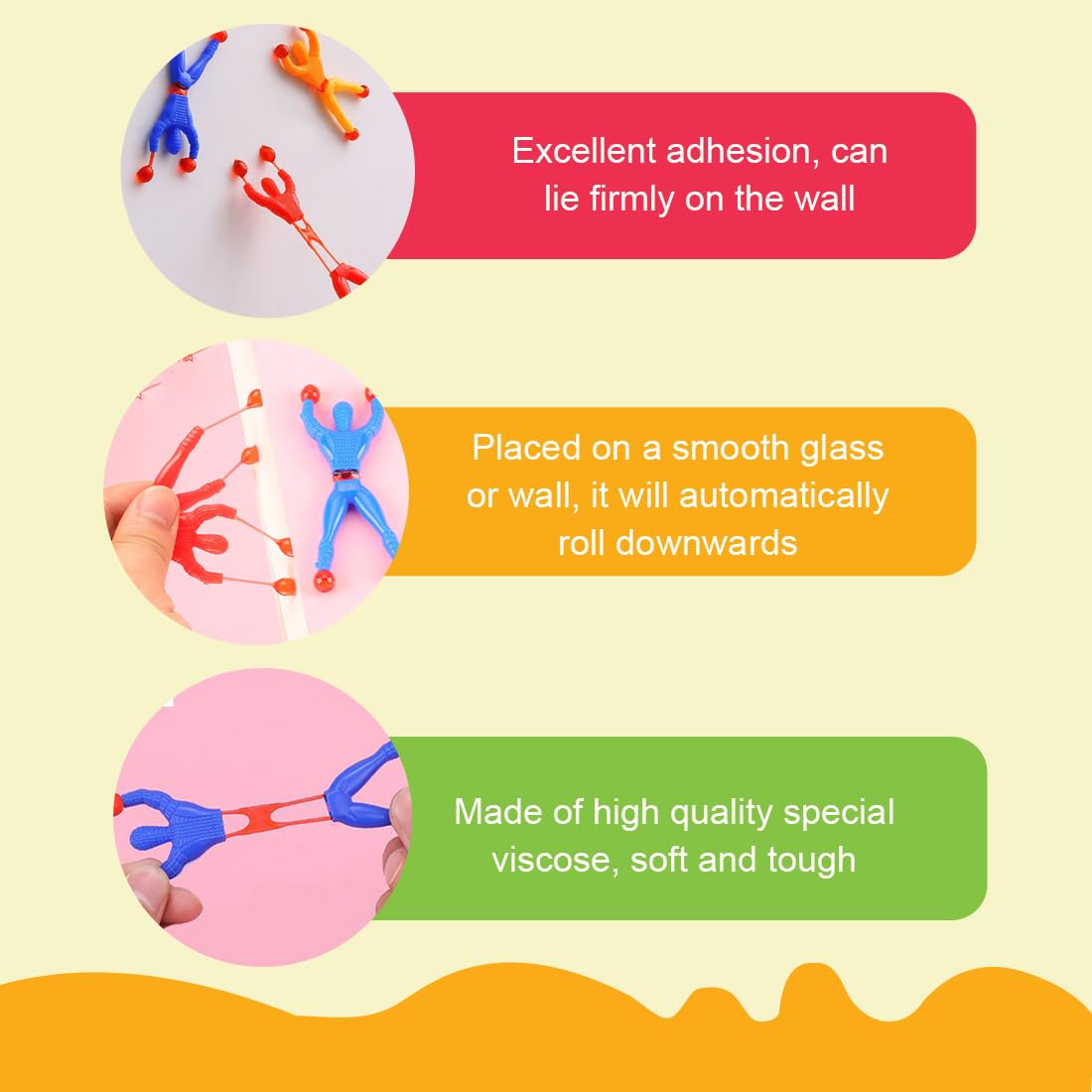 Divertente set di giocattoli appiccicosi: inclusi scalatori di pareti, palme appiccicose e altre forme, colorate, un set per soddisfare le esigenze di una varietà di giochi, ispirare i bambini a esplorare il divertimento. Materiale adesivo di alta qualità: materiale adesivo speciale, appiccicoso, può essere fissato saldamente alla parete, al vetro, ma anche scorrere automaticamente, morbido e resistente, non facile da strappare, durevole e duraturo da giocare. Sicuro e facile da pulire: il materiale è sicuro e inodore, i bambini possono giocare senza preoccupazioni; Dopo essersi sporcato, sciacquare con acqua per ripristinare l'adesione, facile da mantenere, mantenere il giocattolo pulito. Gioco interattivo per alleviare lo stress: può essere lanciato incollato, corsa verso il basso, interazione genitore-figlio, il gioco con gli amici è adatto per alleviare la pressione, aggiungere un'atmosfera felice, esercitare la coordinazione occhio-mano dei bambini. Portatile e multi-scena: compatto e leggero, può essere giocato a casa, all'aperto, in viaggio, incollato su vetro, pareti e altre superfici lisce, inizia un gioco divertente sempre e ovunque per trascorrere il tempo libero.