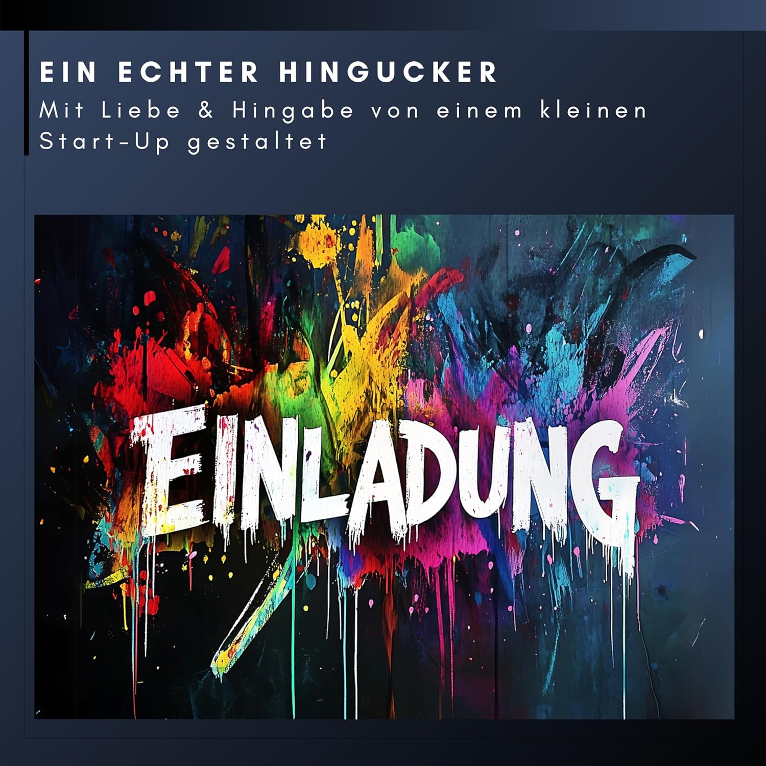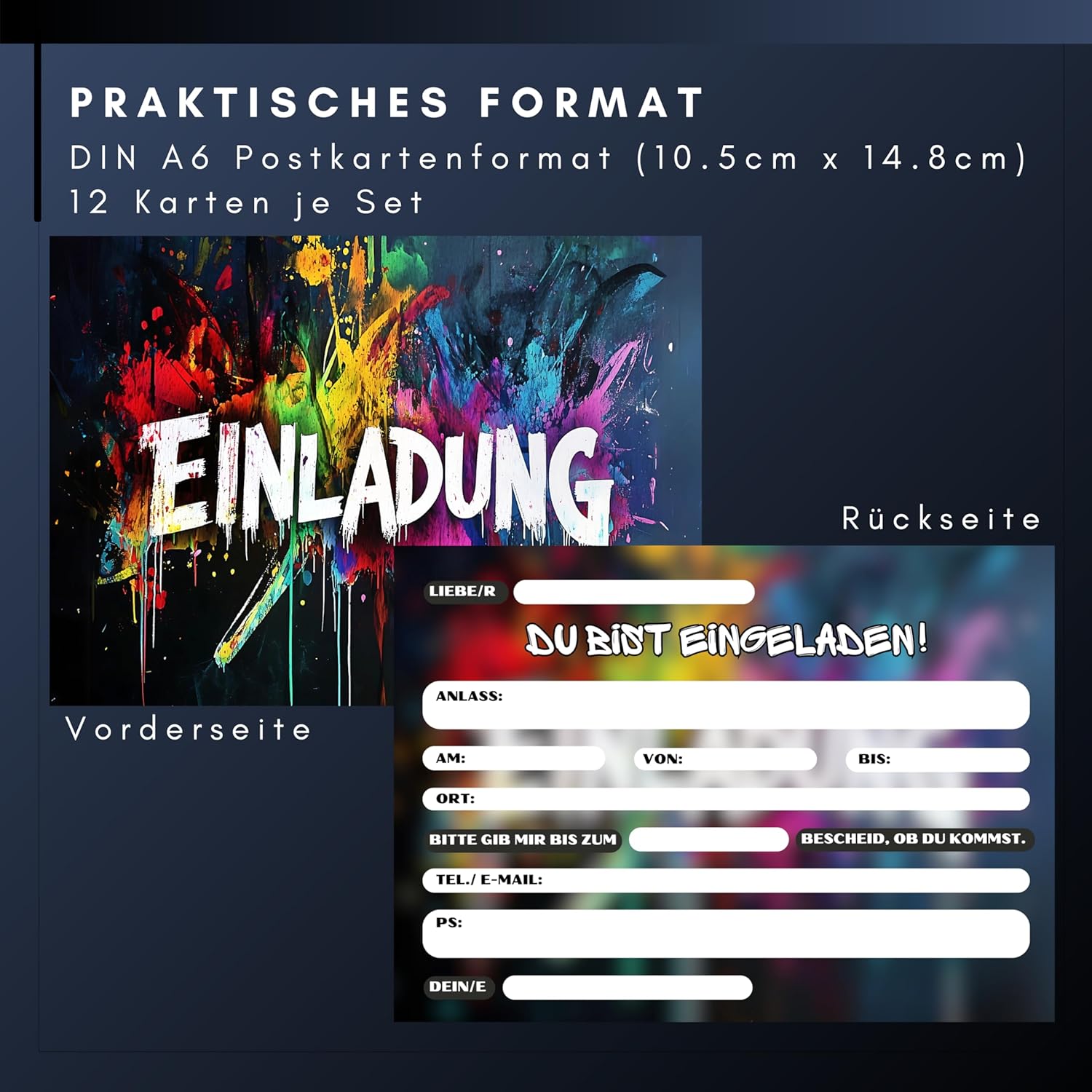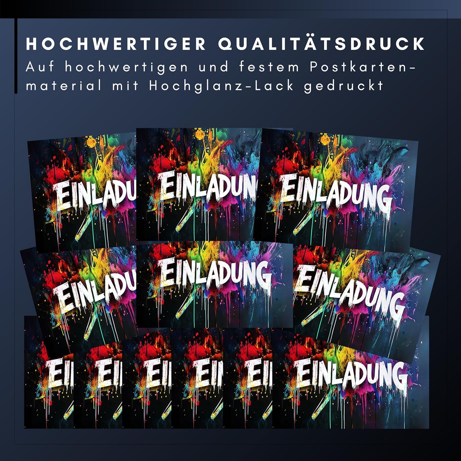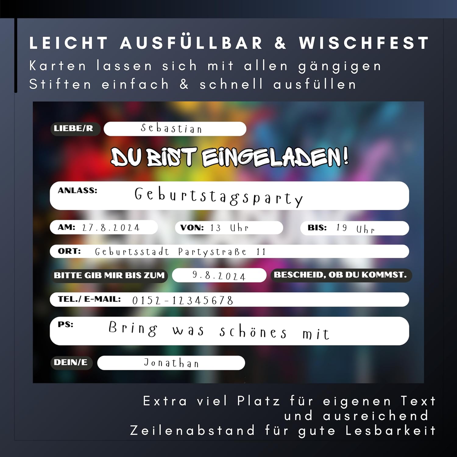 🌆 COOL GRAFFITI I Trasforma l'invito al compleanno di un bambino in un'avventura: i nostri esclusivi biglietti d'invito con graffiti sono un must per ogni festa di compleanno: un vero colpo d'occhio che promette gioia. 🌆 PIÙ FACILE DA COMPILARE E A PROVA DI PULIZIA I I nostri biglietti d'invito sono un gioco da ragazzi da compilare utilizzando i campi forniti. Inoltre, grazie al materiale a prova di sbavature, ogni informazione importante è perfettamente conservata, anche con il riempitivo! 🌆 ALTA QUALITÀ E RISPETTOSO DELL'AMBIENTE I I nostri biglietti sono stampati su materiale per cartoline di alta qualità e particolarmente resistente. Inoltre, non utilizziamo plastica per l'imballaggio. 🌆 PERFETTO PER OGNI OCCASIONE I Non importa se per il compleanno di un bambino, un pigiama party o qualsiasi altra celebrazione. I nostri biglietti d'invito danno ad ogni evento quel qualcosa in più. 🌆 ECCO COSA RICEVERAI I 12 biglietti d'invito con graffiti in formato cartolina DIN A6 (10,5 cm x 14,8 cm), stampati su entrambi i lati e consegnati in modo sicuro in una busta robusta. La parte anteriore è stampata con vernice extra lucida e la parte posteriore è scrivibile.