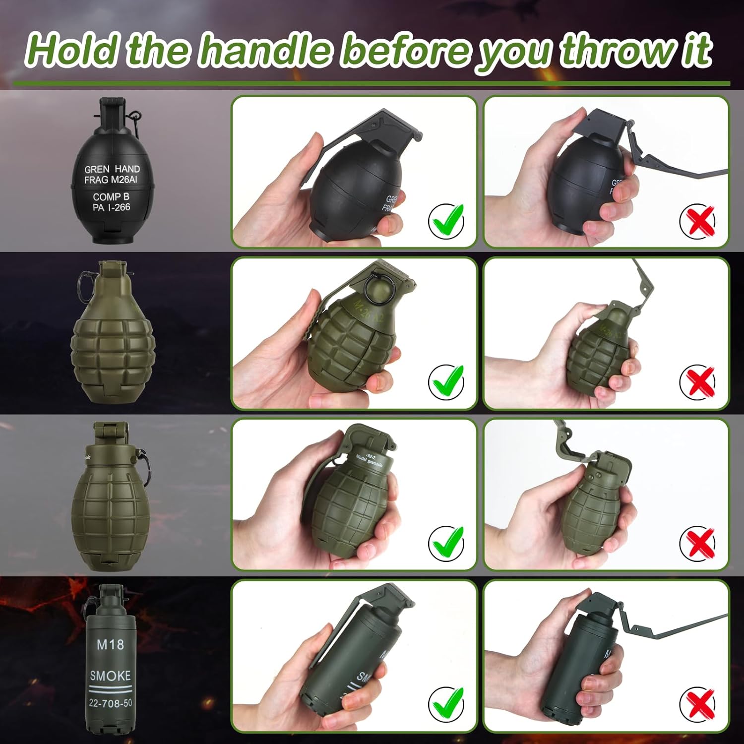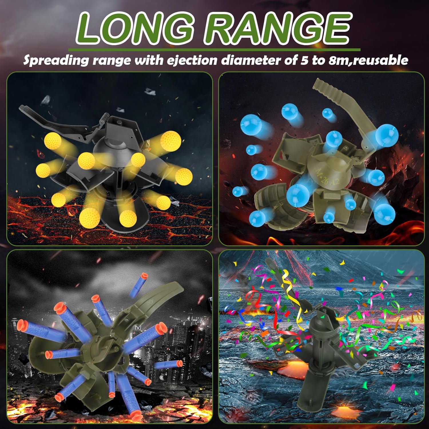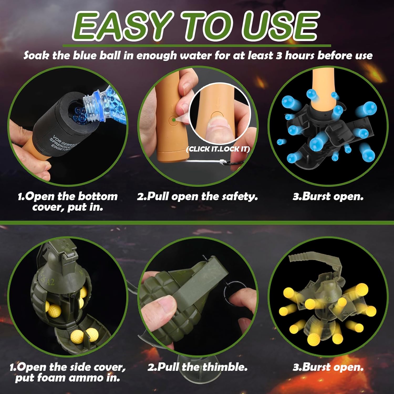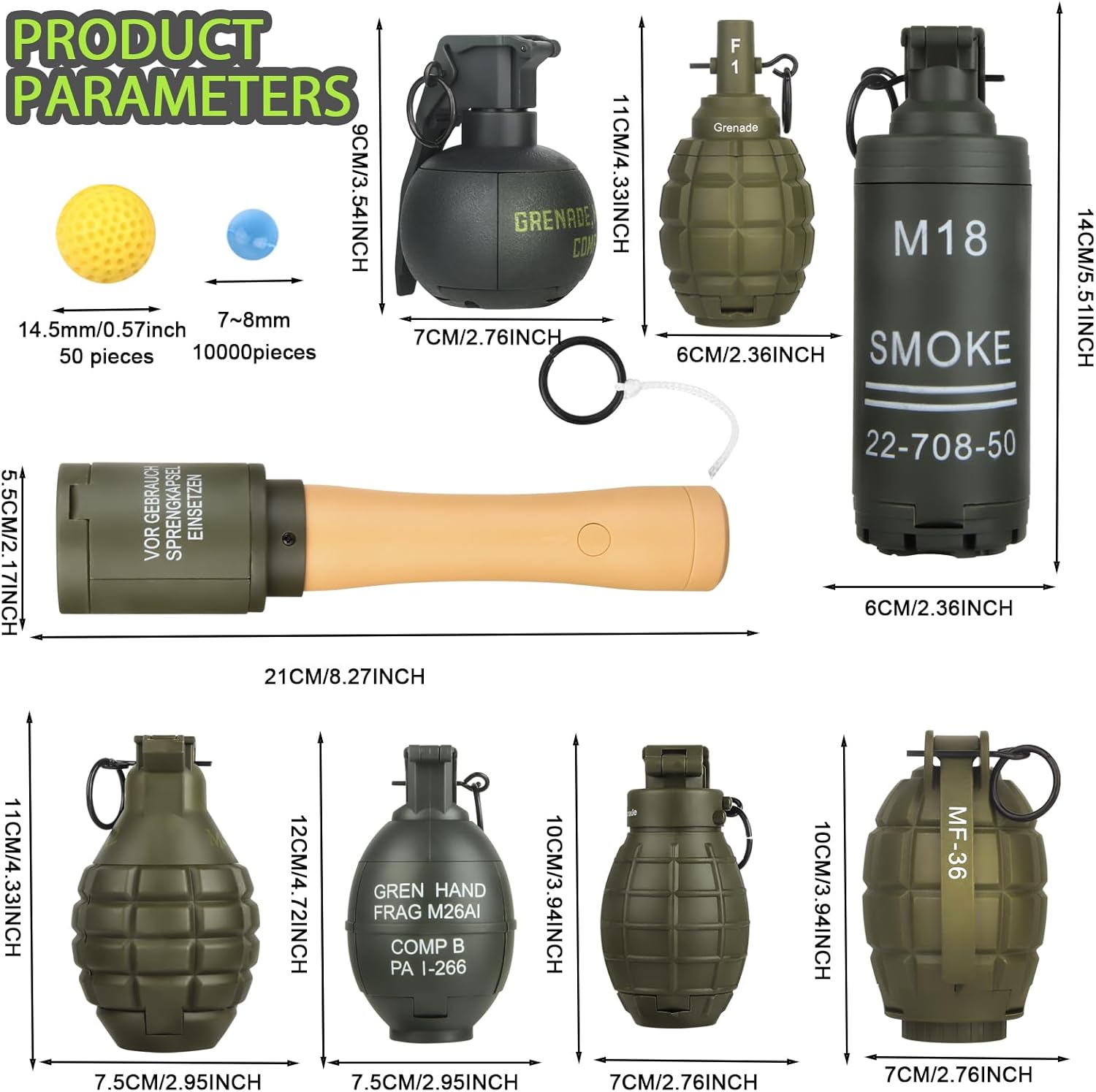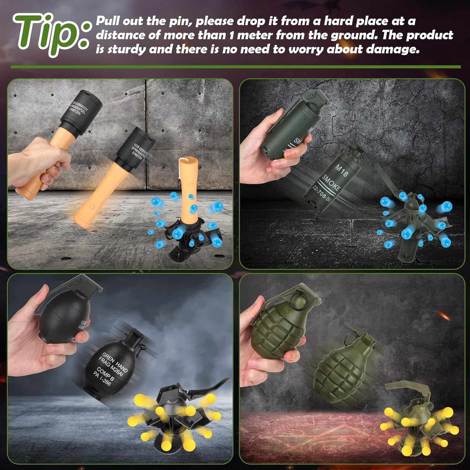 Facile da usare: svitare il coperchio posteriore, caricare munizioni di schiuma o farina, stringere il coperchio posteriore, attendere il momento giusto di gioco, strappare il perno e buttarlo fuori solo. Facile da trasportare: il prodotto è piccolo, quindi puoi portare la granata tattica ovunque tu voglia. Perfettamente nascosta nella tasca e utilizzata di sorpresa. Robusto e portatile: realizzato in nylon di alta qualità, questo giocattolo a granata è robusto, con grande resistenza alle cadute e durezza, non importa come cade, non si rompe. Progettato per CS Battle Game: Si tratta di una granata tattica giocattolo, il prodotto è adatto per il gioco di battaglia CS. Puoi usarlo uccidere una squadra. Ampia gamma di diffusione: a molla, grilletto sensibile e riutilizzabile. Viene fornito con un perno riutilizzabile che può essere inserito ed estratto.