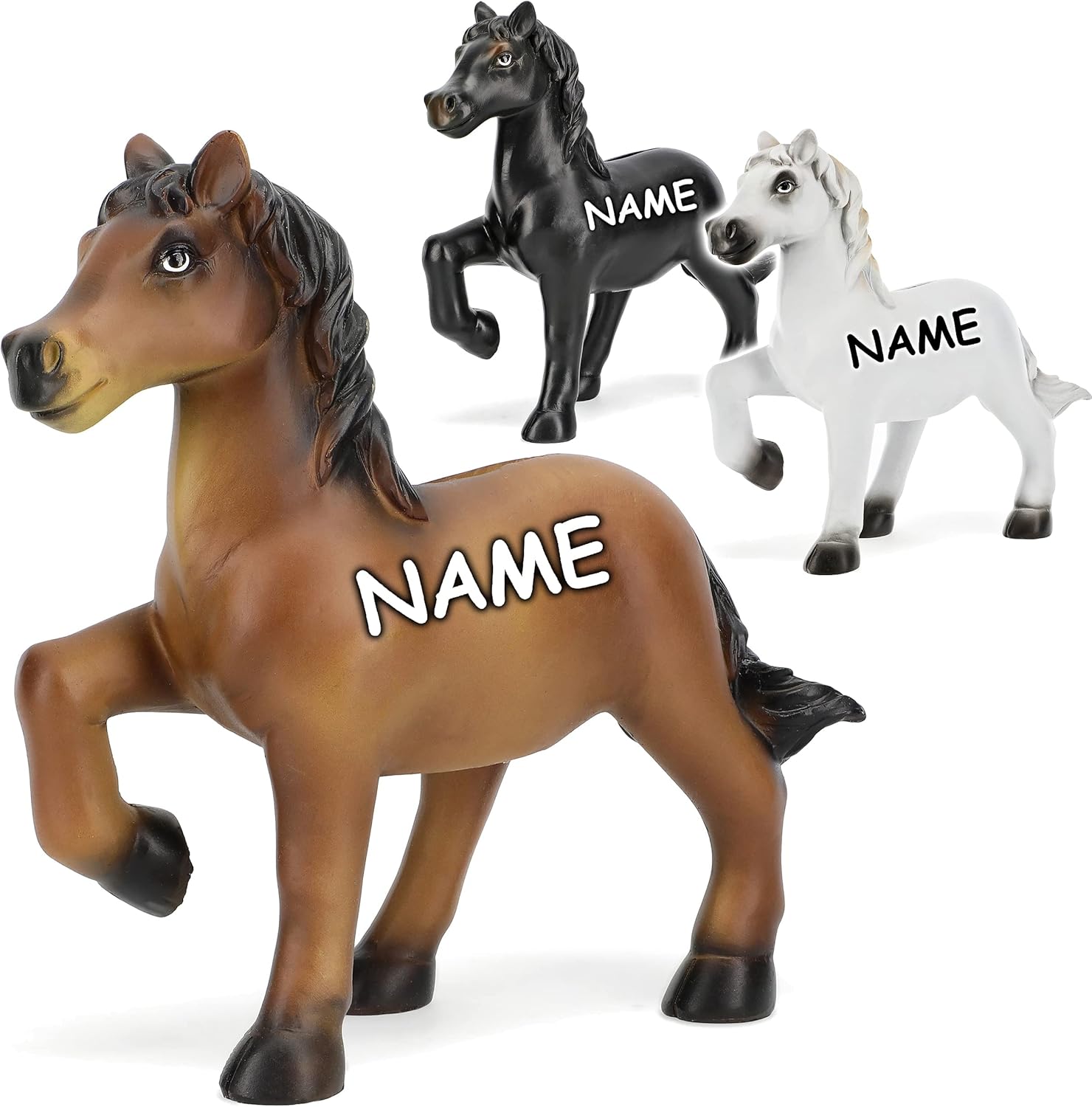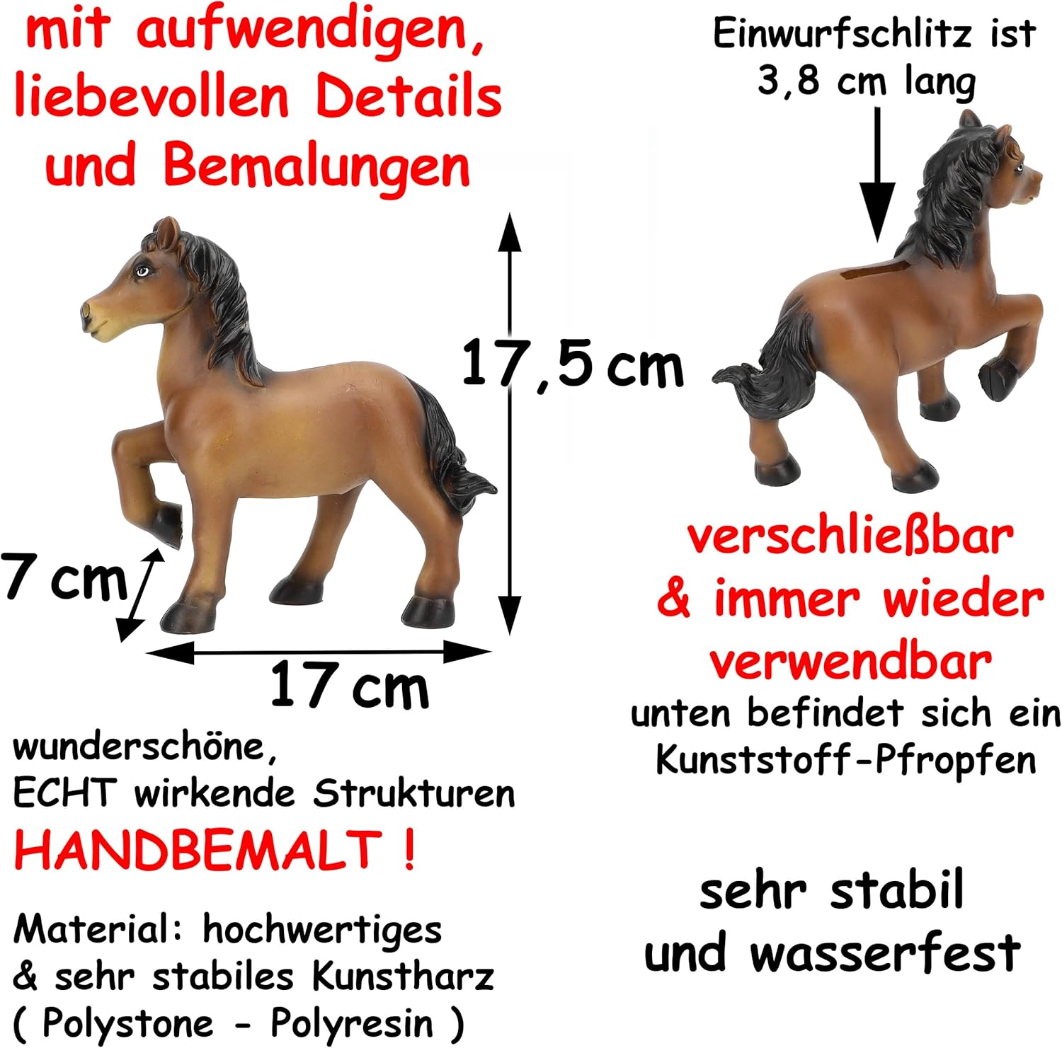 molto bello grande - ALTA QUALITÀ - salvadanaio XL ___ con dettagli e dipinti elaborati e amorevoli ____ mix di colori colorati: "cavallo - marrone / nero / bianco" i salvadanai sono chiudibili a chiave e possono essere utilizzati più e più volte -> c'è un tappo di plastica sul fondo che viene semplicemente spinto fuori per rimuovere i soldi ___ / ___ la fessura lunga 3,8 cm si trova sul retro dimensione XL: ca. 17,5 cm di altezza; 17 cm di lunghezza e 7 cm di larghezza ___ / ____ Materiale: resina sintetica di alta qualità e molto stabile (polystone - poliresina) ____ con bellissime strutture dall'aspetto REALE - DIPINTO A MANO! _______ molto stabile e impermeabile ideale per risparmiare denaro, come regalo speciale in denaro o portafortuna ___ per neonati, per battesimi e nascite, per bambini e compleanni di bambini, per un appassionato di cavalli... __ ideale per TUTTE le età! ___ i colori vengono consegnati in un mix colorato (puoi vedere le diverse varianti nelle immagini ___ se acquisti l'articolo più volte, riceverai un mix colorato) Individualmente con il tuo NOME DESIDERATO - aggiungi semplicemente l'articolo "nome desiderato" nel carrello come extra, il nome verrà quindi abbinato