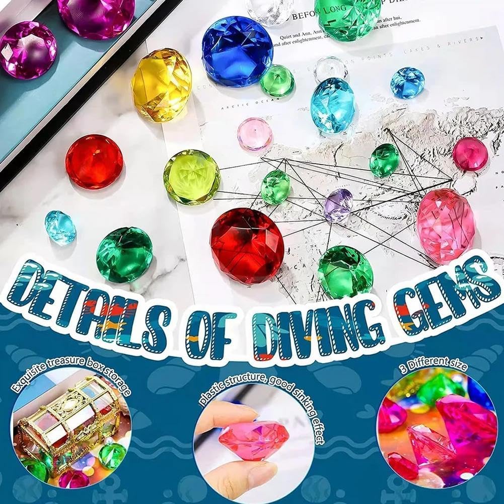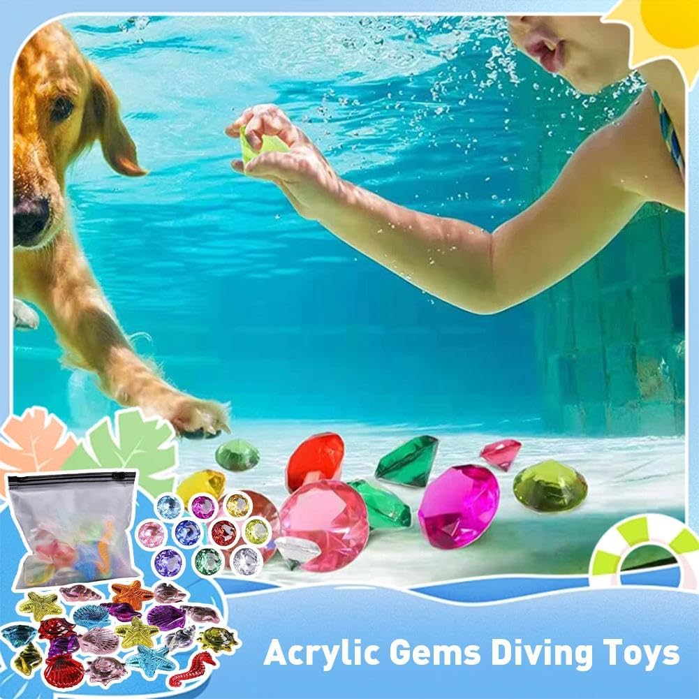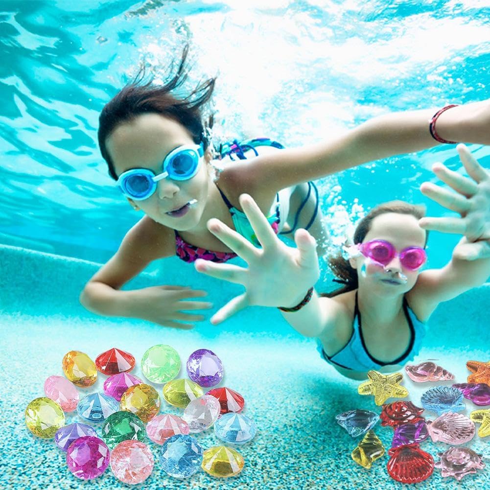 [Set di giocattoli con gemme luminose per piscina] Pietre preziose da piscina grandi e colorate (4 cm) a forma di cuore e rombo – perfette per le mani piccole! Questi divertenti giocattoli subacquei aiutano i bambini a praticare le loro abilità di nuoto mentre vivono avventure subacquee. Materiale acrilico sicuro e durevole: queste pietre preziose sono realizzate in acrilico di alta qualità, infrangibili, resistenti alla luce e progettate per affondare delicatamente. Resistente ma leggero per giocare in piscina o oceani in modo sicuro e duraturo. [Divertimento versatile per tutte le età] Ideale per allenamenti di nuoto, caccia al tesoro o giochi di festa. Utilizzali per feste in piscina, gite in spiaggia, come decorazione per acquari o anche per l'allenamento di nuoto con i cani. Un regalo ideale per ragazzi, ragazze e amanti del nuoto. [Promuovere la sicurezza dell'acqua] Incoraggia bambini e adolescenti a immergersi, scoprire e nuotare! Getta le gemme in piscina per sfide emozionanti o nascondile in un "forziere dei pirati" per giochi di gruppo. [Perfetta attività estiva] Porta tensione al nuoto estivo, ai compleanni o alle feste in giardino. Queste gemme riutilizzabili rendono il gioco dell'acqua emozionante e allo stesso tempo promuovono la coordinazione e le abilità subacquee.