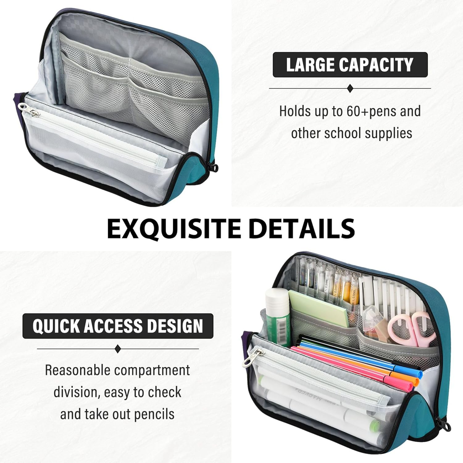 Versatile funzionalità in piedi: la borsa per il trucco in tela si apre piatta e si ripiega in modo sicuro per creare un contenitore autoportante, combinando portabilità con comodità sulla scrivania Materiale affidabile: grazie al suo nylon resistente all'acqua e ai graffi, la graziosa borsa con cerniera rimane ordinata e intatta, adatta per stili di vita in movimento o studenti attivi Grande capienza: dispone di uno scomparto principale, una tasca in rete con cerniera e una tasca aperta per organizzare penne, matite, gomme, temperamatite e foglietti adesivi Un sacchetto, molti scopi: l'astuccio per ragazze si sposta facilmente tra la custodia per la scuola, il trucco o il porta attrezzi da viaggio, ideale per studenti, professionisti e creativi Ideale per occasioni speciali: le borse da viaggio offrono un tocco personale con stampe vivaci e personalizzazione opzionale, adatte per laurea, compleanni o rientro a scuola
