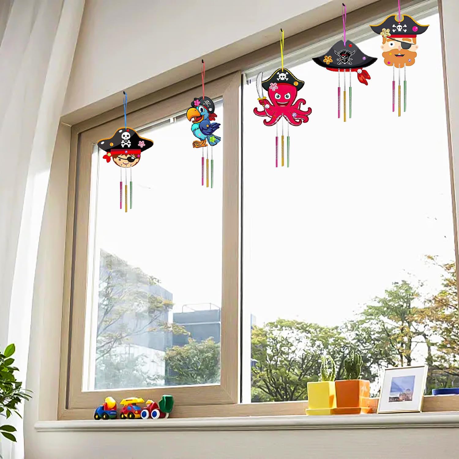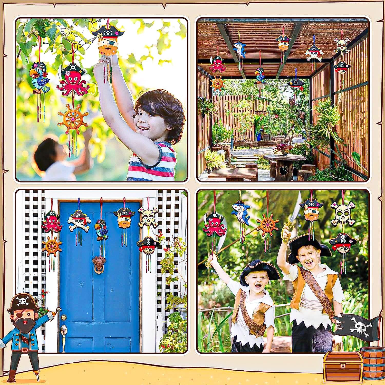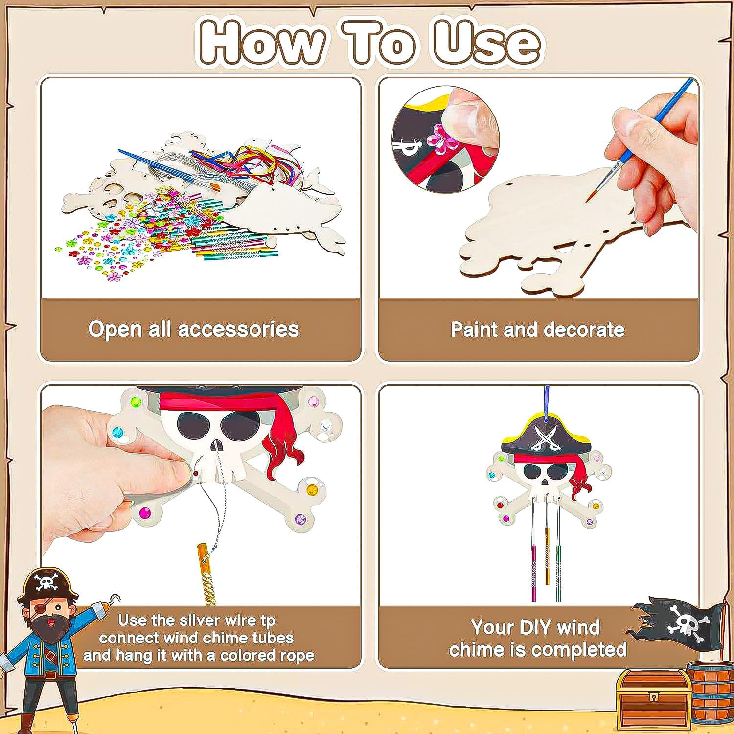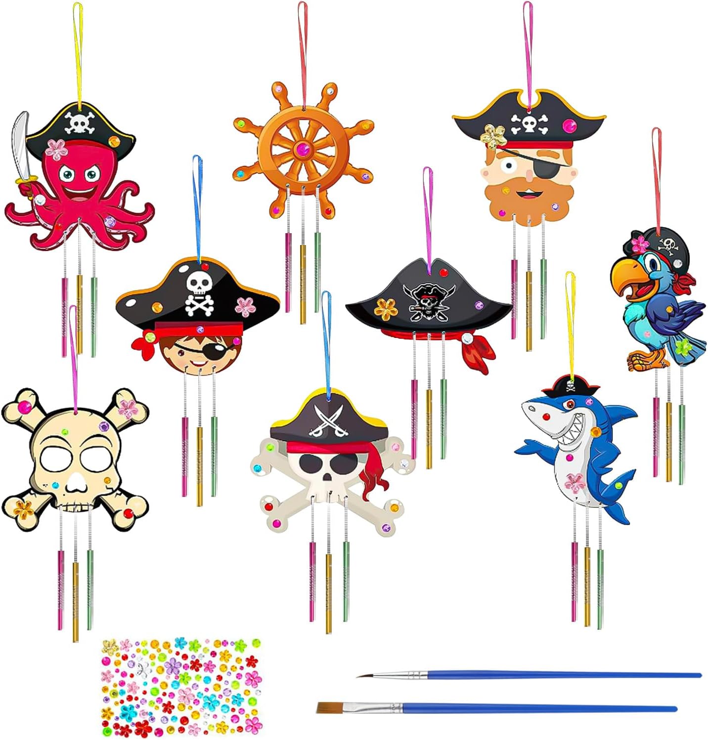 Kit fai da te creativo in legno pirata: il kit fai da te comprende 9 campanelli eolici pirata (9 stili), 27 tubi per campanelli eolici, 1 corda da 8 m, 9 nastri, 2 pennelli e 1 foglio di adesivi con strass. L'esclusivo kit fai-da-te del carillon dei pirati può essere decorato ovunque. Materiale di alta qualità: il campanello a vento pirata è realizzato in legno di alta qualità, durevole e ha una superficie liscia su cui non puoi ferirti le dita, così puoi fare il fai-da-te in sicurezza. Il tubo del campanello è realizzato in metallo per un suono chiaro e piacevole. Migliora la creatività: il kit artigianale per cappelli da pirata promuove la tua immaginazione e creatività. Perfetto per compleanni di bambini, Natale, matrimoni, baby shower, attività per feste, premi di classe, decorazioni per feste e lezioni di artigianato. Regali per bambini: il nostro kit fai-da-te per cappelli da pirata è perfetto da appendere a cancelli, caminetti, pareti e finestre come decorazione o da appendere alla grondaia del tuo giardino o balcone; Quando soffia il vento, il carillon del vento produrrà un suono meraviglioso e creerà una forte atmosfera festosa. 【Garanzia di servizio】Grazie per aver scelto il nostro kit fai-da-te per campanelli eolici in legno. In caso di problemi con la quantità o la qualità del kit campanello a vento fai-da-te, contattaci via e-mail. Risolveremo il problema per te finché non sarai soddisfatto.