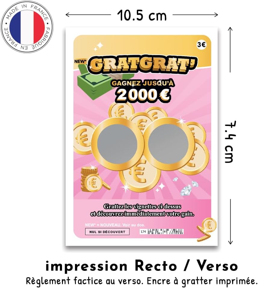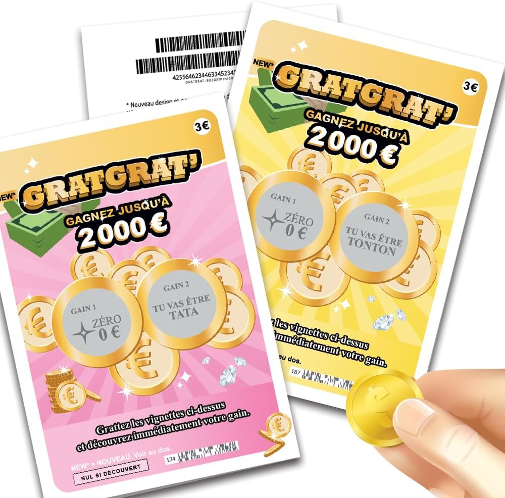 Idea regalo originale per fare l'annuncio della tua gravidanza ai tuoi cari. Futuro nonno, zio, bisnonno, futura nonna, zia, bisnonna. Gratta e vinci. Messaggio da scoprire: "Stai per diventare nonno" (fondo blu), "Stai per diventare nonna" (fondo verde), "Diventerai zio" (fondo giallo), "Diventerai zia" (fondo rosa), "Diventerai bisnonno" (fondo blu), "Sarai bisnonna" (fondo viola), "La famiglia crescerà" (fondo arancione). Non personalizzabile. Gioco gratta e vinci. Cartoncino, Formato 10,5 x 7,4 cm, Stampa offset ad alta definizione (stampante professionale). Inchiostro antigraffio in lattice (stampato direttamente sul file), reso più vicino ai veri giochi gratta e vinci. Regolazioni fittizie sul retro per un maggiore realismo. Per differenziare i giochi gratta e vinci, troverete sul retro di ogni biglietto accanto al copyright (sopra al codice QR): "TA": per il modello "tata" (carta rosa), "TO": per il modello "tonton" (carta gialla), "MA": per il modello "mamie" (carta verde), "PI": per il modello "papi" (carta blu), "AGM": per il modello "bisnonna" (carta viola), "AGP": per il " bisnonno” (cartellino blu), “FA”: per il modello “la famiglia crescerà” (cartellino arancione). Set gratta e vinci "diventerai nonno" + etichetta adesiva per vasetto di marmellata "marmellata della futura nonna" (si presenta sotto forma di adesivo, formato 10 x 5 cm, carta adesiva da 80 gr, stampa OFFSET ad alta definizione). Mimi grandit è una piccola azienda francese specializzata in prodotti originali per l'annuncio della gravidanza e della nascita.