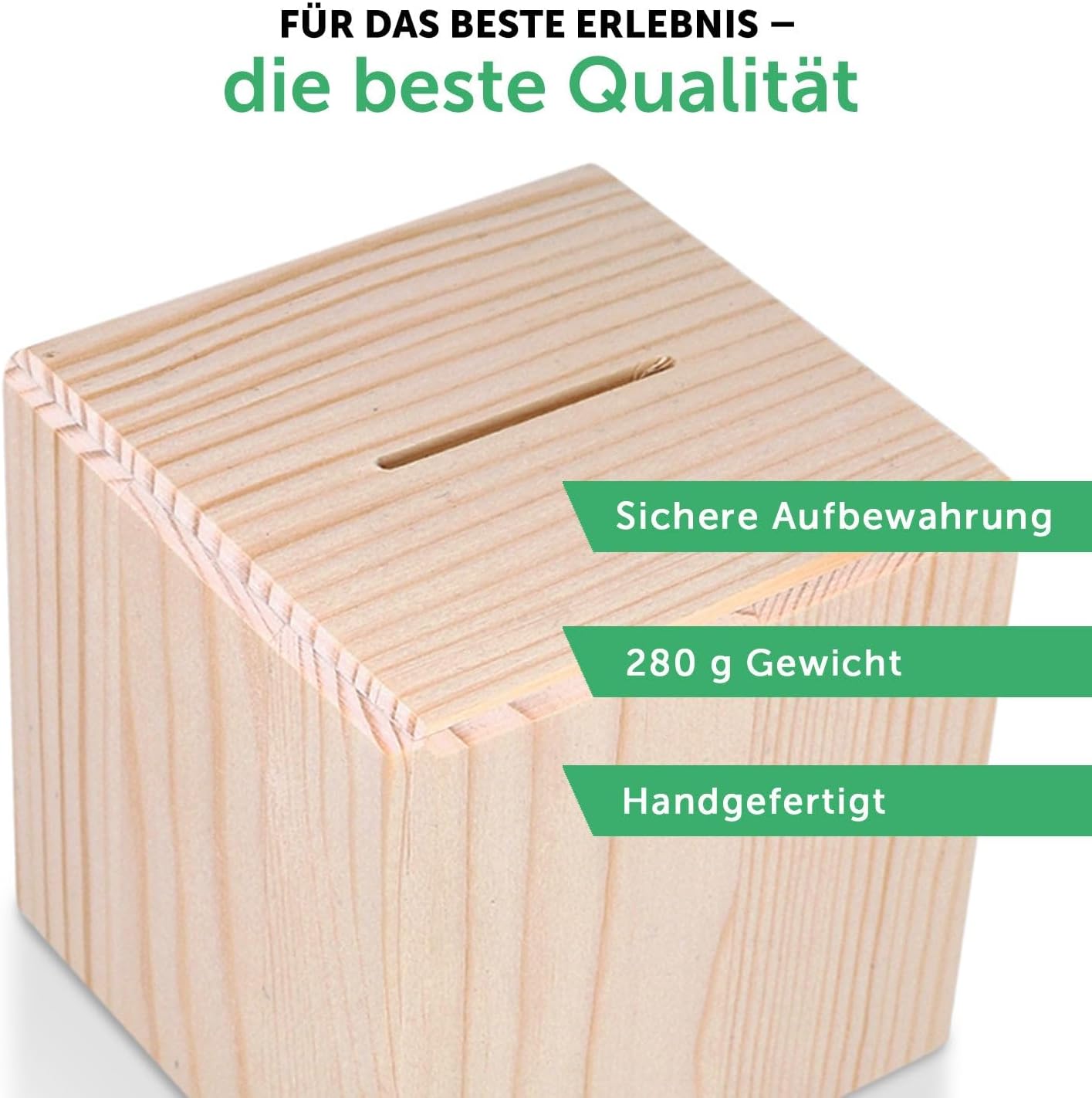 🌈 STAMPA COLORATA - La nostra stampa UV ti garantisce colori stampati duraturi, brillanti e altamente precisi che si legano direttamente al legno. Nessuno sbiadimento, sfocatura o distacco dei motivi di stampa! 🎁 REGALO PERSONALMENTE - Personalizzato con il nome desiderato, il salvadanaio diventa un regalo amorevole per una nascita, un battesimo o un compleanno ed è adatto anche come decorazione amorevole per la cameretta dei bambini 🪵 VERO LEGNO - Il salvadanaio è realizzato in legno di abete rosso naturale con bordi arrotondati e venature visibili. Piccole irregolarità nel motivo rendono ogni pezzo unico e sottolineano il carattere naturale 📐 DIMENSIONI - Il salvadanaio stampato è realizzato in legno di abete rosso a forma di cubo (circa 10 × 10 × 10 cm) con bordi piacevolmente arrotondati. Una serratura in metallo con chiave protegge in modo affidabile il contenuto. Il peso totale è di ca. 280 g 📦 ORIENTATO AL SERVIZIO - Ordina oggi e scopri tu stesso la qualità di prima classe e la spedizione veloce. Se hai domande sui nostri prodotti o una consegna non soddisfa le tue aspettative, siamo a disposizione per fornirti consulenza e supporto sia telefonicamente che via email