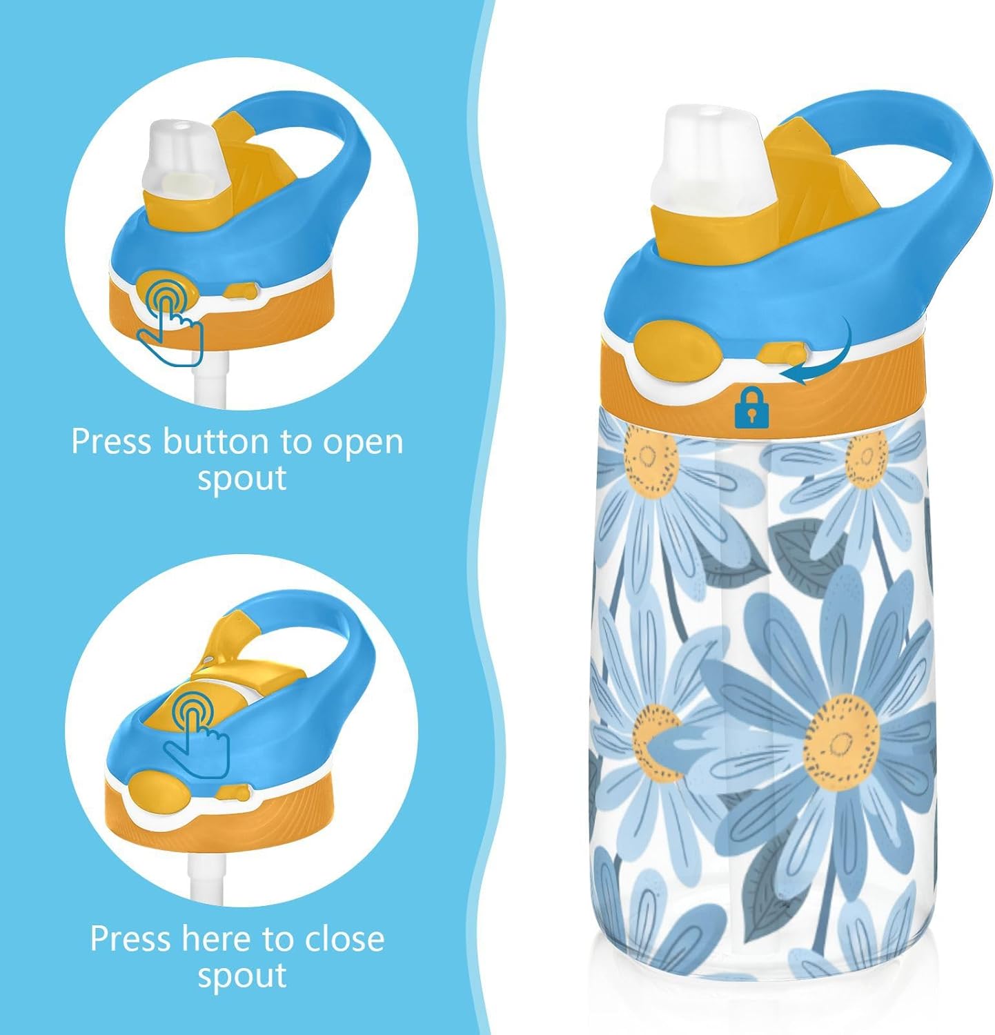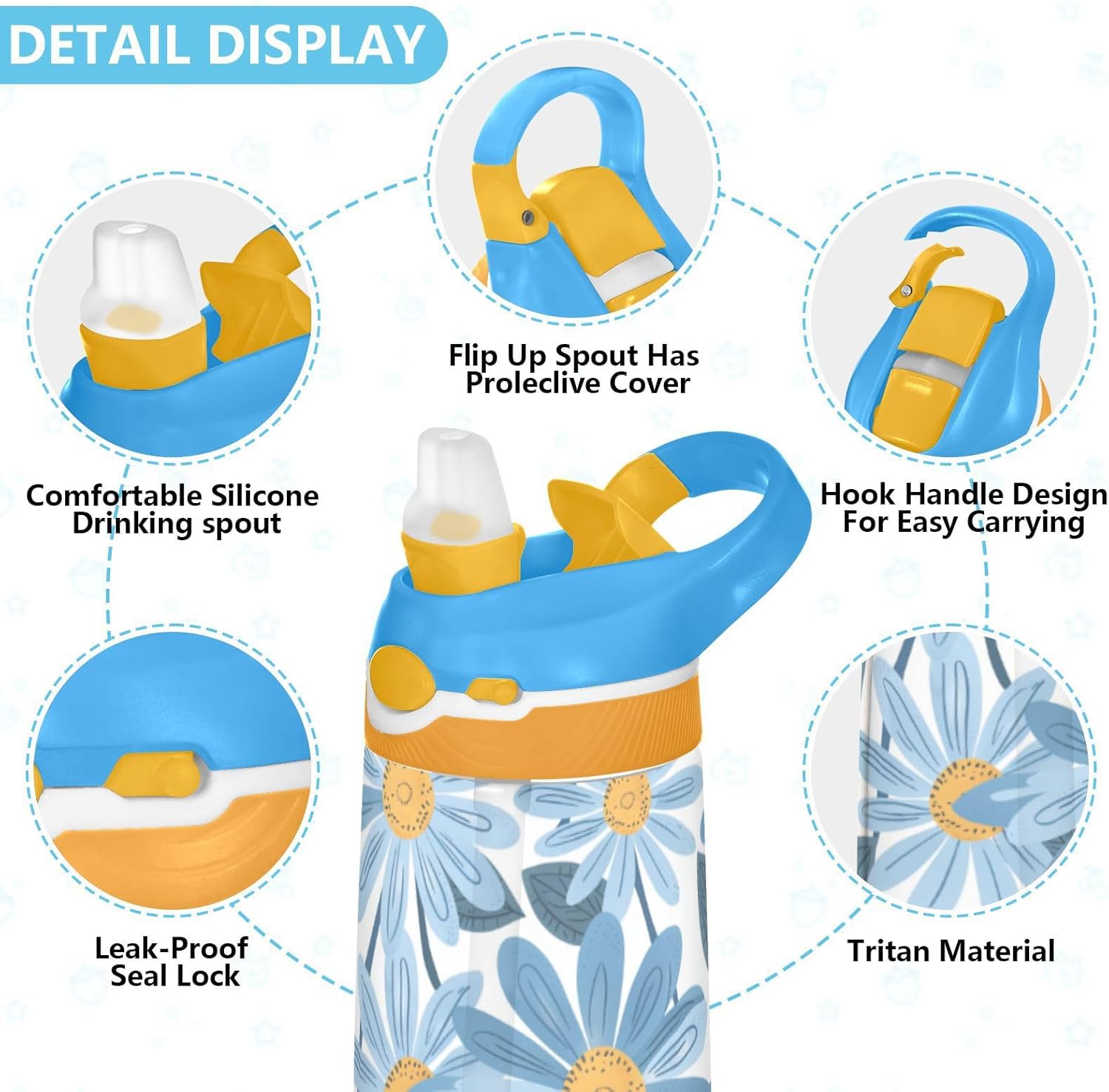 Materiali: questa borraccia sportiva da 480 ml (16 cm di lunghezza, 7,5 cm di larghezza) combina tritan e silicone alimentare. per la pratica sportiva o i giorni scolastici, è sicuro per i bambini da usare tutti i giorni. Non adatto a bambini di età inferiore ai 3 anni! Comoda da trasportare: con un ampio manico per mani piccole e un gancio sul coperchio, la borraccia può essere appesa agli zaini. I bambini non faranno fatica a trasportarla durante le gite sul campo o le attività dopo la scuola. Uso senza problemi con una sola mano: il design a becco d'anatra si adatta alle bocche dei bambini, con una copertura antipolvere. L'interruttore a pulsante della borraccia sportiva è facile da usare con una sola mano, anche quando giocano o corrono. Previene le perdite: il blocco a pulsante blocca l'apertura accidentale del becco d'anatra. Mantiene le bevande all'interno, proteggendo zaini e vestiti durante i pendolari o il gioco. Pulizia semplice: le parti completamente rimovibili evitano l'accumulo di sporco. Pulire con detergente neutro e acqua calda: facile per i genitori mantenere pulita la borraccia per bambini per l'uso quotidiano.