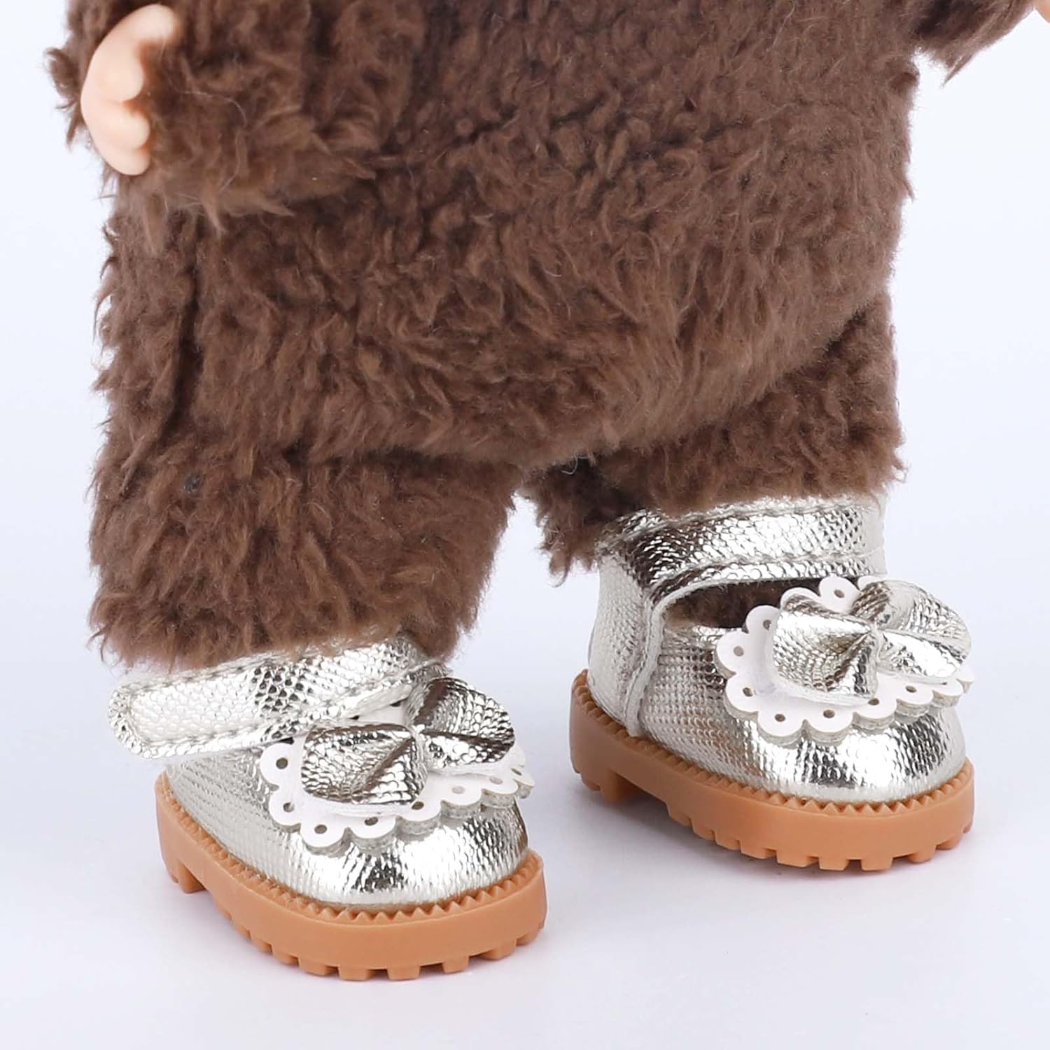 Materiale di qualità: le scarpe sono realizzate in pelle PU, morbida, comoda al tatto, resistente e non facile da danneggiare e sbiadire, servendoti a lungo. Contenuto del prodotto: riceverai 1 paio di graziose mini scarpe per bambole, perfette per decorare le tue bambole. Dimensioni del prodotto: questo paio di mini scarpe misura circa 3,8 x 2,5 x 2 cm, adatto per bambole di 15 cm e 17 cm. Si prega di verificare le dimensioni della bambola da collezione prima dell'acquisto. Design carino: questo paio di scarpe lucide, delicate e carine, decorate con bellissimi pizzo e fiocchi, che possono far risaltare la tua bambola all'istante. Regalo premuroso: questo paio di scarpe sorprenderà e delizierà i bambini che amano decorare bambole, collezionisti o appassionati di fai da te. Un regalo perfetto per compleanni, vacanze o uso quotidiano.