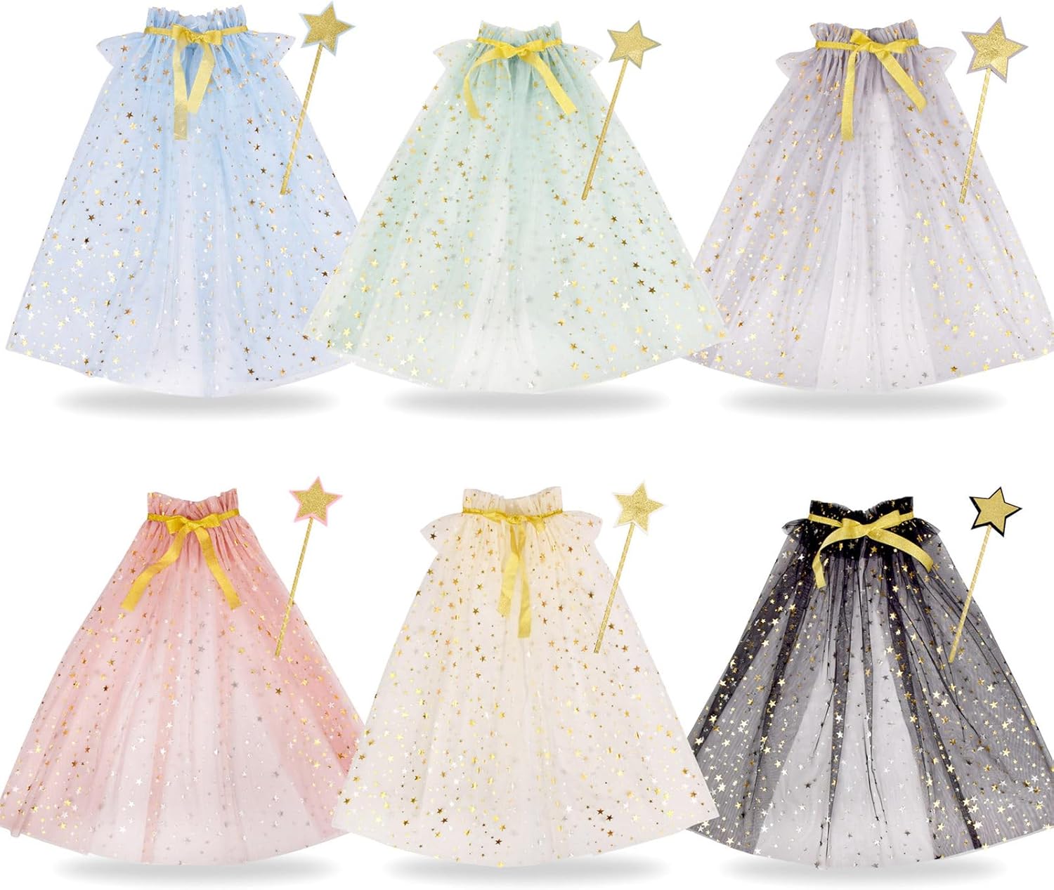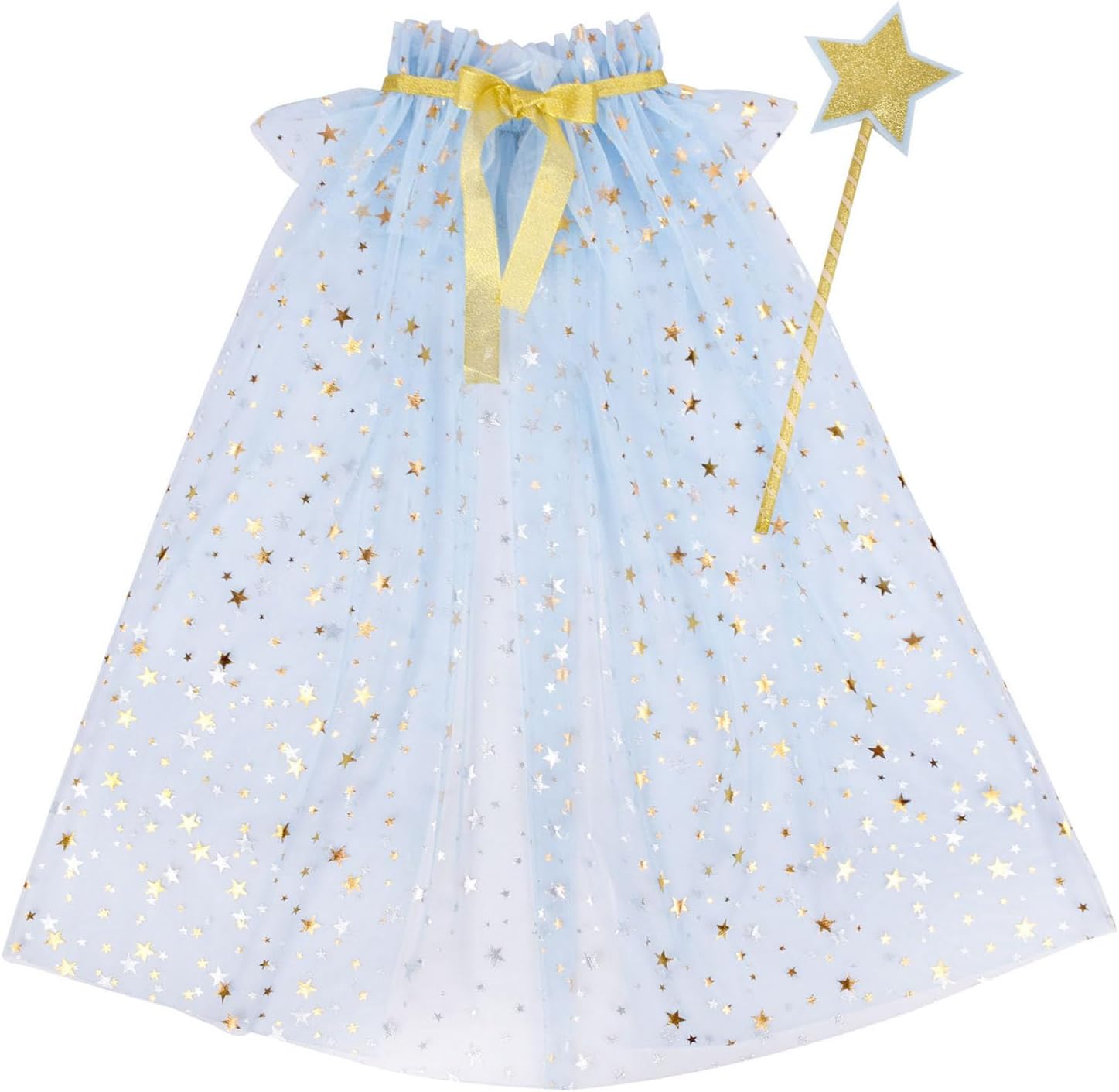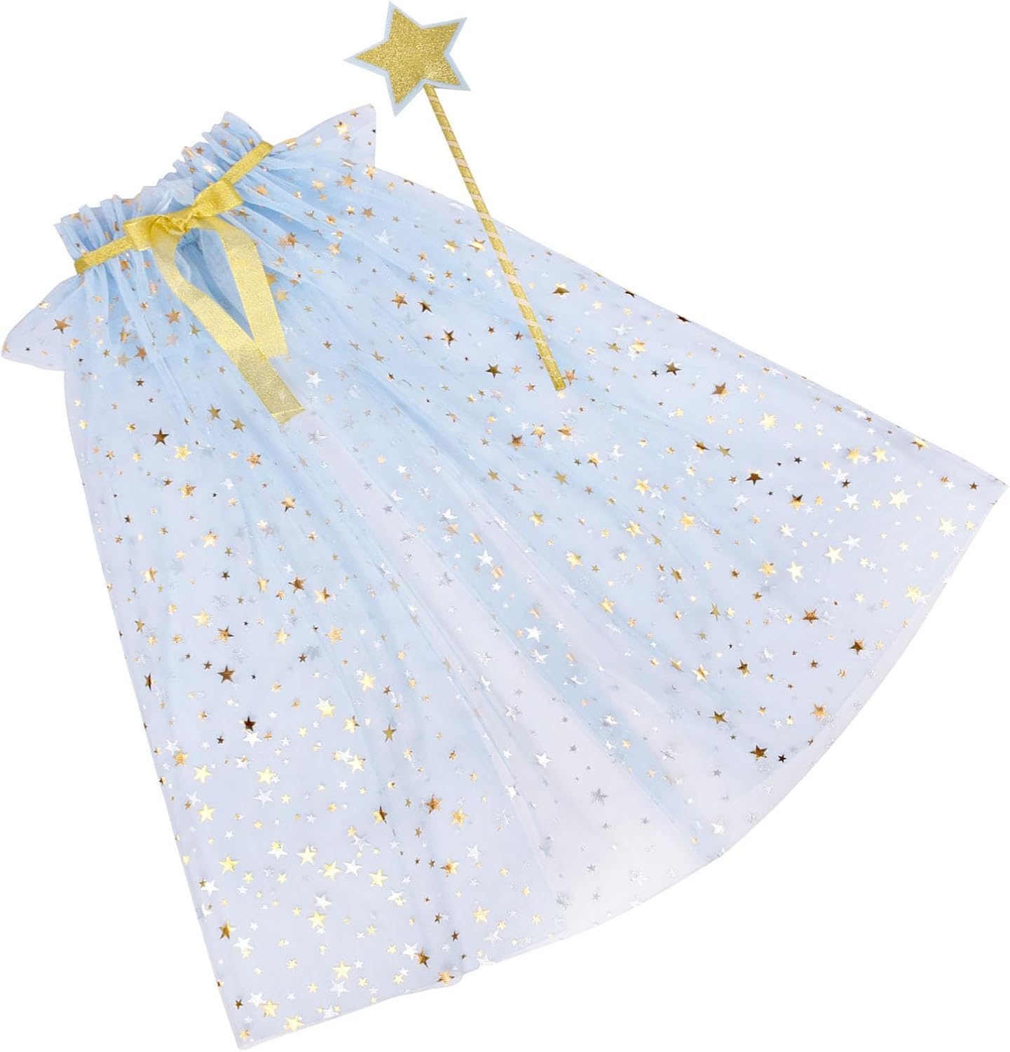 Set di 2 bacchette magiche a forma di stella per bambina e una mantella in tulle, per accendere la fantasia. Realizzata in tulle leggero e morbido, la mantella è decorata con stelle, mentre lo scollo regolabile assicura una vestibilità comoda. Progettato per i bambini, è ideale per i sognatori e le fate in erba. Ideale per feste di compleanno, cosplay, spettacoli teatrali o servizi fotografici, questo costume promette di creare ricordi indimenticabili e momenti affascinanti. Lancia un po' di magia con questo set di bacchetta magica e mantello, un accessorio indispensabile per la collezione fantasy di ogni bambino, assicurando che si distinguano tra la folla in ogni occasione festiva.