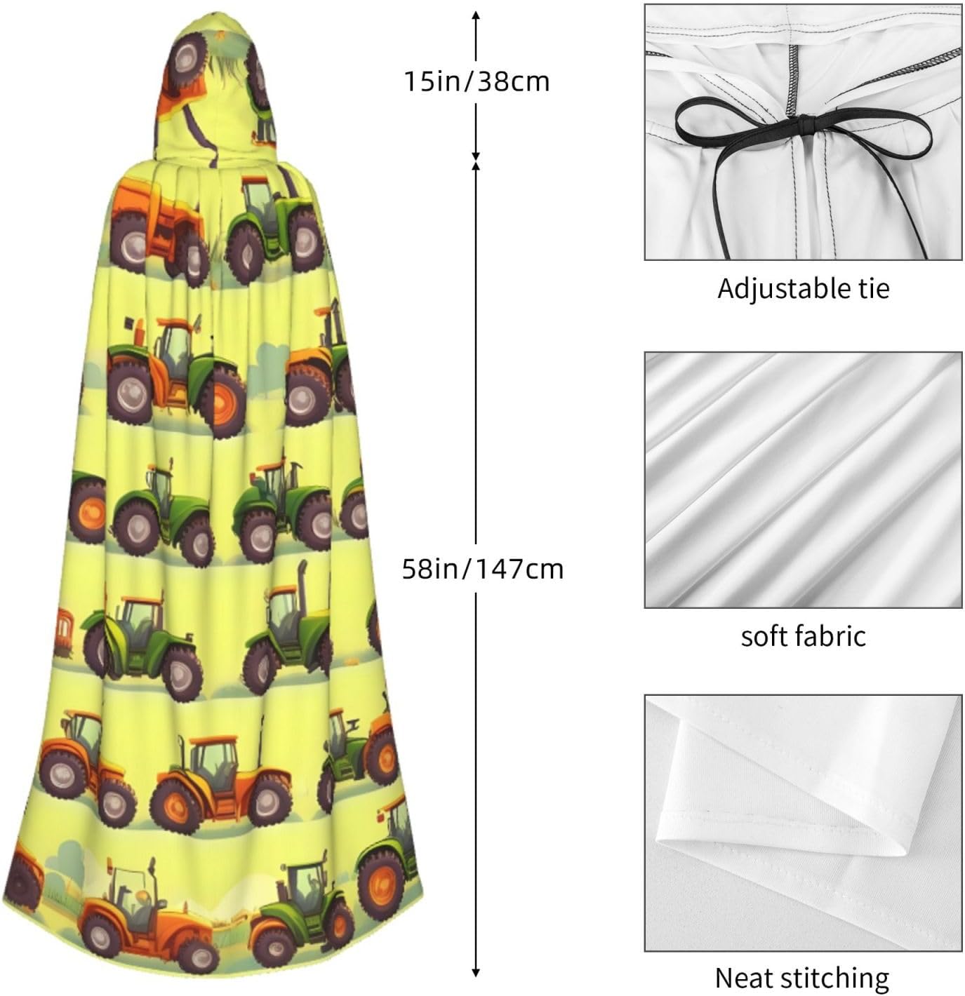 Il mantello con cappuccio per Halloween è realizzato con tessuto in poliestere morbido anche sulla pelle, prevenendo qualsiasi irritazione. Il mantello presenta un ampio cappuccio e uno stile annodato senza cerniere per un design sofisticato ed elegante. Con la sua dimensione universale, offre una copertura completa, adatta a tutti, assicurandoti di distinguerti tra la folla. Questo mantello con stampa a macchina Green Fields Farming non è solo per Halloween; è abbastanza versatile per cosplay, spettacoli teatrali, balli in maschera, feste a tema e molto altro ancora.