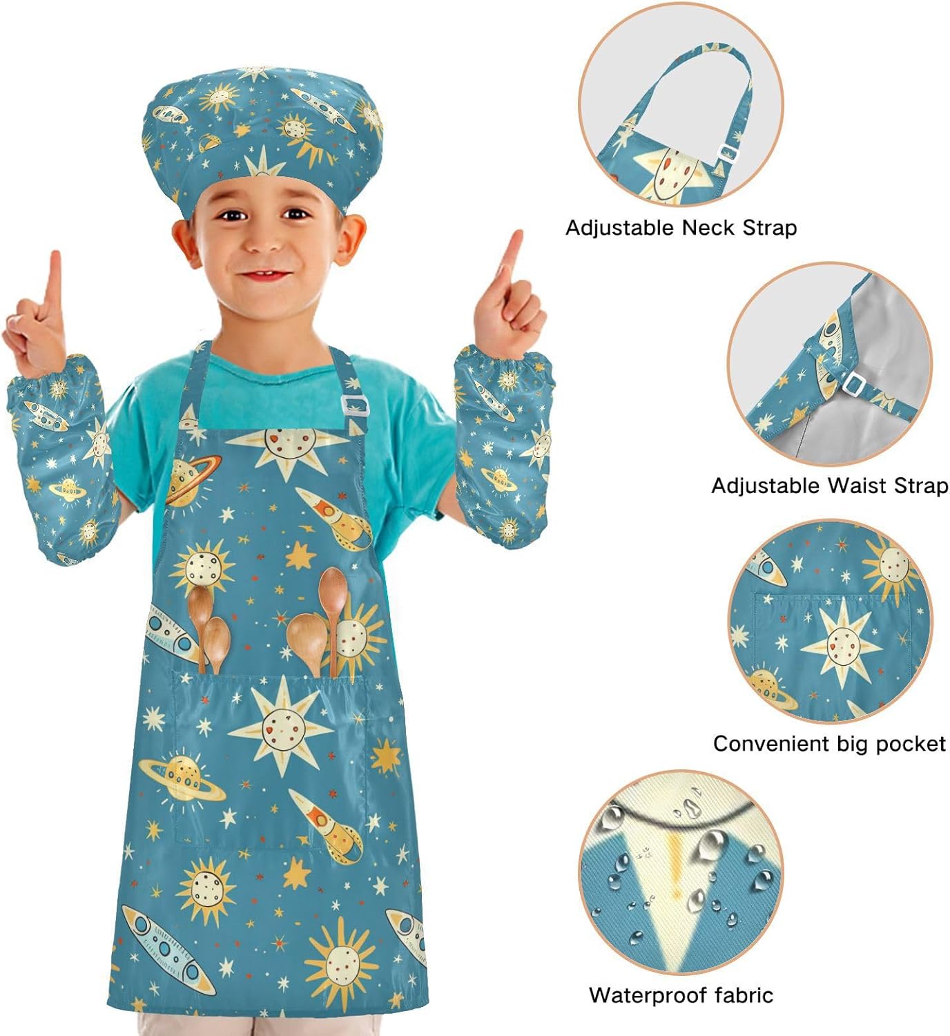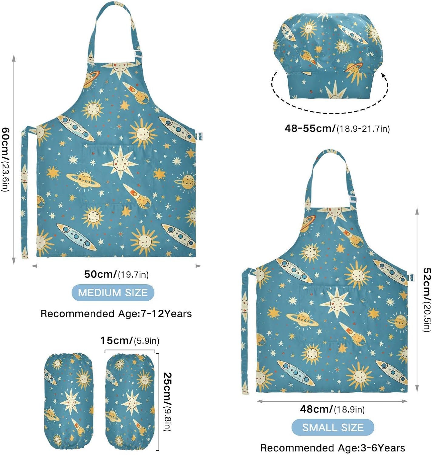 Grembiule da cucina per bambini, motivo: sole e stelle, cappello da chef per bambini dai 3 ai 12 anni